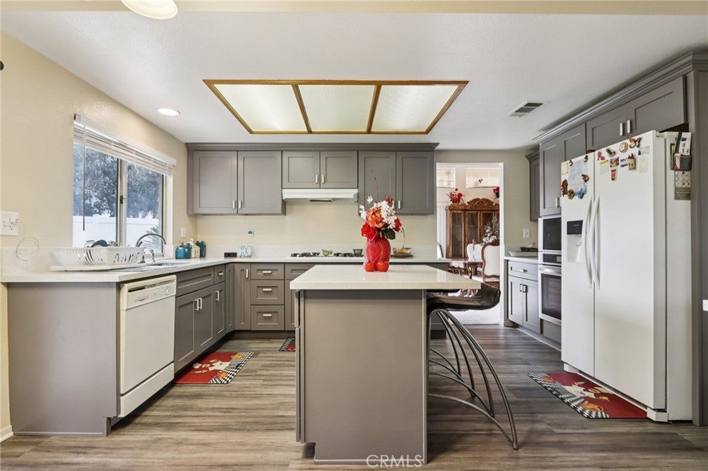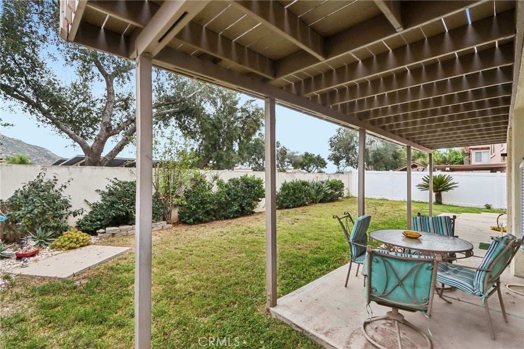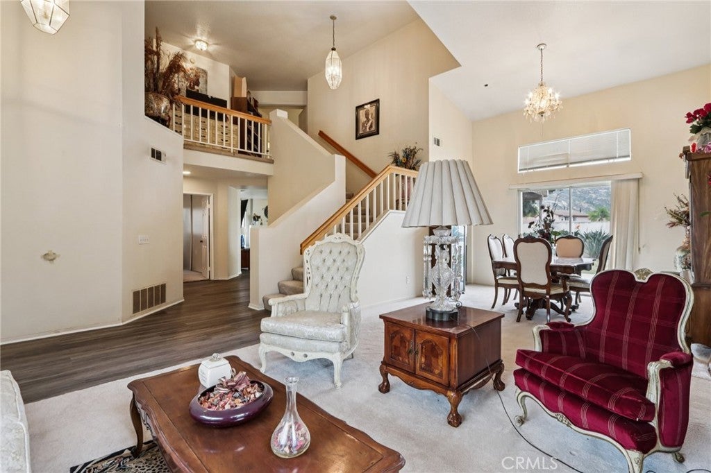 Move-in ready 4-bedroom, 3-bath, 2,585 sqft two-story home with an attached 3-car garage. The front yard features grass, and a fountain. Enter the spacious home through double-doors that open to soaring ceilings in the formal living room and dining room. The kitchen has been remodeled and features quartz countertops, a center island with breakfast bar seating, soft close cabinets and drawers and additional bar seating at the peninsula. The kitchen overlooks the family room with fireplace and secondary dining area. There is also a downstairs bedroom and bathroom with a walk-in shower, as well as a laundry room. Take the wide staircase to the 2nd floor where you will find the massive primary suite with retreat area, as well as an attached wrap around deck, and a spa-like ensuite with dual vanities, a soaking tub, a separate shower, and a walk-in closet. There is also a full-size hall closet for the 2 secondary bedrooms to share. Enjoy the private backyard with grass, covered patio area, mountain views, and no rear neighbors! Conveniently located near schools, shopping, and dining, with easy access to the 60 and 215 freeways. Schedule your tour today!