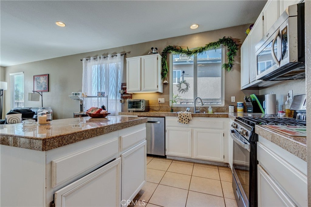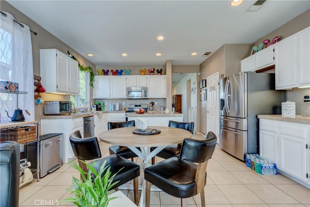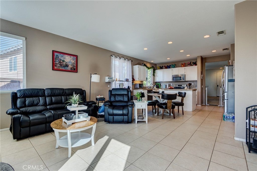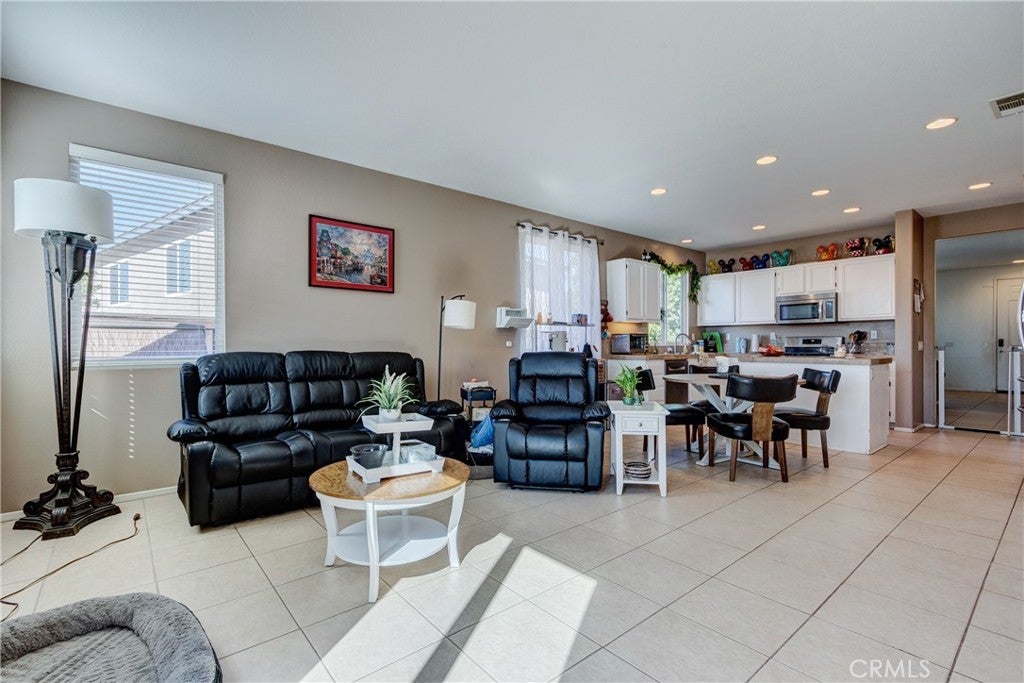 Large 4 bedroom single-story home in Menifee offering almost 2,000 sq ft of beautifully updated living space and enjoys a desirable private yard with picturesque views. The spacious layout featuring tall 9 foot ceilings & recessed lighting seamlessly connects the large living and kitchen areas. Enjoy the modern aesthetic and easy maintenance of LVP plank flooring in bedrooms and stylish tile throughout the home. The well-appointed kitchen features desirable upgrades including granite countertops, a large island, stainless steel appliances, and ample cabinetry for storage. A large primary bedroom provides a tranquil retreat featuring a private en-suite bathroom and very generous walk in closet space. Three additional spacious bedrooms offer versatility for a growing family, guests, or a home office. Step outside to a private backyard oasis, perfect for relaxation and entertaining. The yard features a combination of concrete for entertaining areas, lush grass, and open orientation, creating a serene and functional space. Enjoy total privacy & the beauty of your surroundings with stunning views of the mountains from your private backyard with no home behind! All this and close to parks, excellent schools, Menifee Global Hospital, restaurants & the 215 freeway for easy access to surrounding communities including San Diego beaches & local mountains.