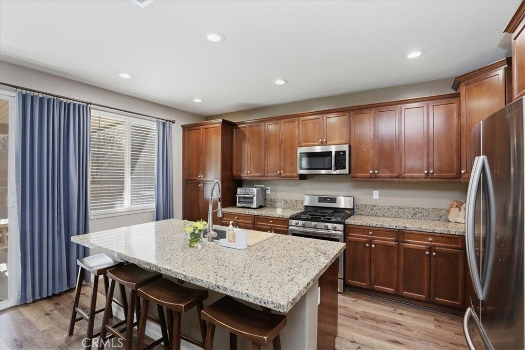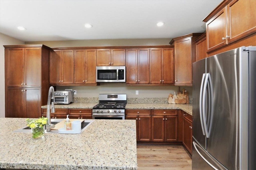 Welcome to your dream home in the highly sought-after community of Sycamore Creek where comfort, style, & lifestyle come together beautifully. This stunning 3 bedroom, 3 bath home offers exceptional curb appeal & an inviting presence from the moment you arrive. Thoughtfully designed with an ideal layout, this 2 story home lives like a single story thanks to its spacious primary suite conveniently located on the main level providing everyday ease & long-term comfort. Step inside to soaring cathedral ceilings & a formal dining room. The heart of the home is the beautifully appointed kitchen, featuring rich granite countertops, a generous center island with seating, abundant cabinetry, & S/S appliances. Perfectly positioned to overlook the family room, this open-concept space allows you to cook, entertain, & connect effortlessly. The family room boasts an impressive fireplace that creates the perfect ambiance for relaxing evenings. The downstairs master, offers a spacious walk-in closet, dual vanities, a separate jetted soaking tub, & a walk-in shower. Additional downstairs bedroom & full bath provides lots of options. Laundry room w/lots of storage completes the main level. Upstairs, you’ll find a massive loft, ideal as a playroom, or secondary living space, along with an additional bedroom & full bath. Throughout the home, you’ll appreciate the stunning laminate flooring, upgraded baseboards, recessed lighting, ceiling fans & meticulous pride of ownership that make this home truly move-in ready. Step outside to a low-maintenance backyard designed for year-round enjoyment. The expansive Alumawood patio cover, complete with 2 ceiling fans, creates a comfortable outdoor living space perfect for dining, relaxing, or entertaining in any season. Living in Sycamore Creek means enjoying the resort-style amenities included in the low HOA: 2 Swimming Pools, Kiddie Pool, Water Splash Fun Zone, Charming Clubhouse w/Kitchen, New State Of The Art Fitness Center, Pocket Parks, Walking & Hiking Trails, Sports Regional Park with Dog Park, Skate Park, Soccer & Baseball Fields, Basketball & Tennis Courts, Picnic Areas & BBQ's. Walking Distance to Award Winning Todd Elementary! Conveniently Located to Shopping, Entertainment, Tom's Farms, Golf Courses & 15 Fwy. Surrounded by serene rolling hills and breathtaking sunrises and sunsets, this home offers not just a place to live but a lifestyle to love. Hurry! Don’t miss the opportunity to make it yours.