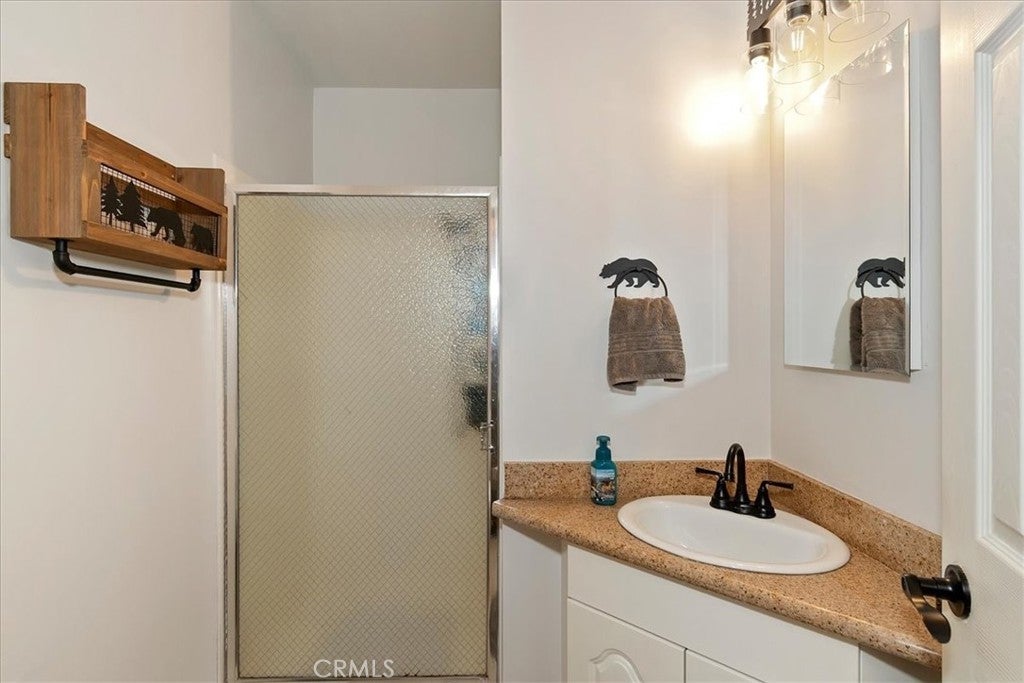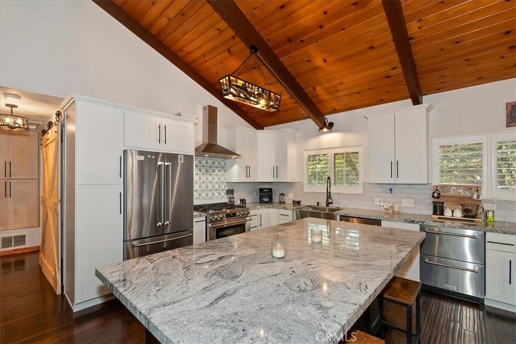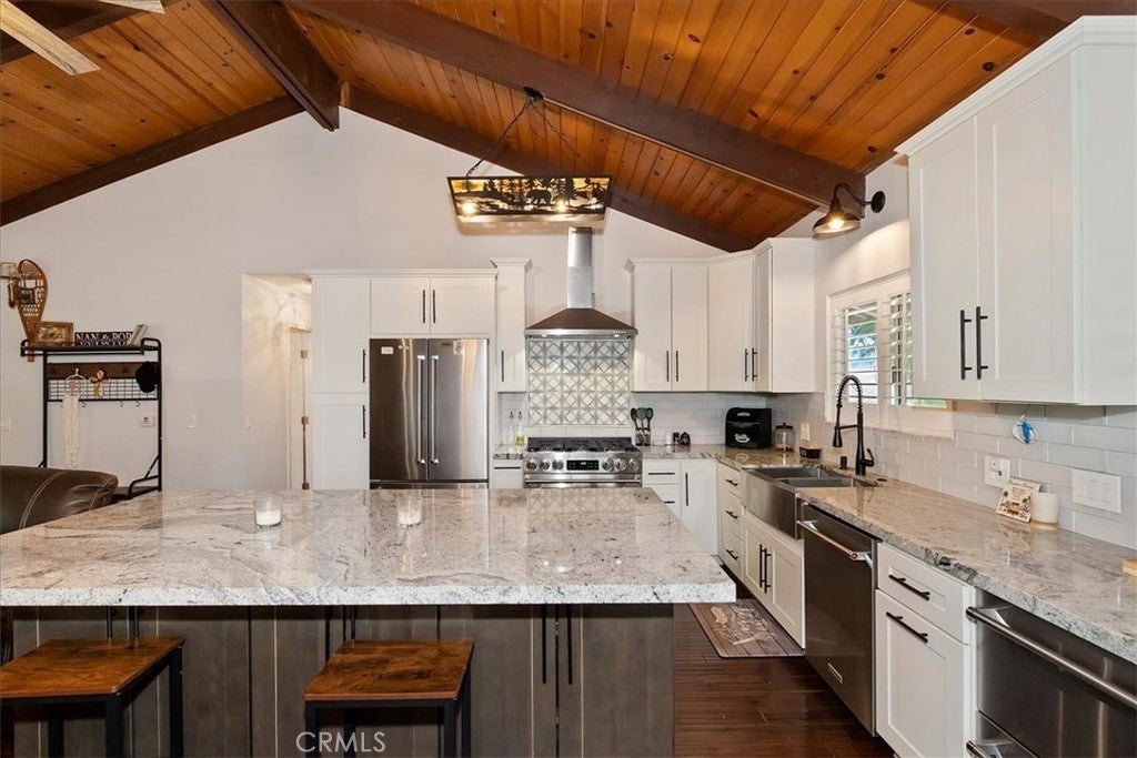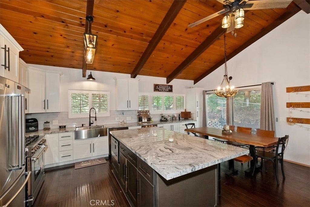 This home showcases a kitchen where no expense was spared. Whether your client dreams of a chef-inspired space or simply values generous counter space, this kitchen delivers. It features fully updated appliances, including a six-burner stove and a convenient two-drawer beverage refrigerator. A beautiful center island stands as a striking centerpiece. The kitchen flows seamlessly into the spacious living room, which boasts soaring vaulted ceilings and a cozy fireplace—ideal for cold winter nights. Updated laminate flooring runs throughout the home, adding both style and functionality. A dedicated laundry area in the hallway includes cabinets above the washer and dryer for added storage. The hall bathroom offers a sleek walk-in shower. The primary bedroom is generously sized, featuring a large closet and a private bath with a full tub. The second bedroom also offers ample space for family or guests. Elegant plantation shutters accent every window, providing both charm and light control. A sliding glass door off the dining area opens to a perfectly level, fenced yard—ideal for children, pets, or relaxed outdoor living. This mountain home reflects true pride of ownership and is ideal as either a full-time residence or a serene vacation getaway.