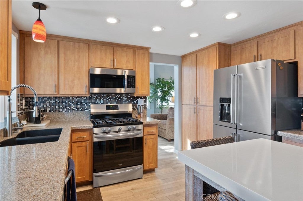 Welcome to 34247 Via Buena Drive in Yucaipa — a beautifully upgraded home offering nearly 1,800 square feet of living space on an expansive 9,000 square foot lot, perfectly designed for comfort, functionality, and entertaining. This spacious four-bedroom, three full-bathroom home features a highly desirable layout with one bedroom and a full bathroom conveniently located on the main level — ideal for guests, multi-generational living, or a home office. All three bathrooms have been tastefully remodeled with high-end finishes and modern design touches. The upgraded kitchen is the heart of the home, showcasing newer cabinetry, updated countertops, stainless steel appliances, composite sink, recessed lighting, pendant lighting, a charming garden window, and a moveable center island with seating. The kitchen opens seamlessly to a generous living room with a cozy fireplace, creating the perfect gathering space. Formal living and dining rooms feature vaulted ceilings that add volume and natural light, enhancing the home's open and airy feel. Step outside to a truly stunning backyard retreat. Enjoy your private in-ground swimming pool and spa with custom stonework, multiple entertaining levels, dual patio areas, built-in fire pit, ambient lighting, and even an in-ground ice chest conveniently located near the spa — perfect for hosting and not haviing to go far for your favorite beverage. Additional upgrades include ceramic wood tile flooring downstairs, upgraded carpeting upstairs, window shutters, updated light fixtures, ceiling fans, upgraded HVAC system, dual-pane windows and sliding glass door, interior and exterior paint, and a spacious three-car garage. The home reflects pride of ownership throughout with a plethora of high-end improvements. Located in a desirable Yucaipa neighborhood with generous lot space and exceptional outdoor amenities, this property offers the perfect blend of style, comfort, and functionality...and no HOA! Be sure to checkout the 3D home tour and video!