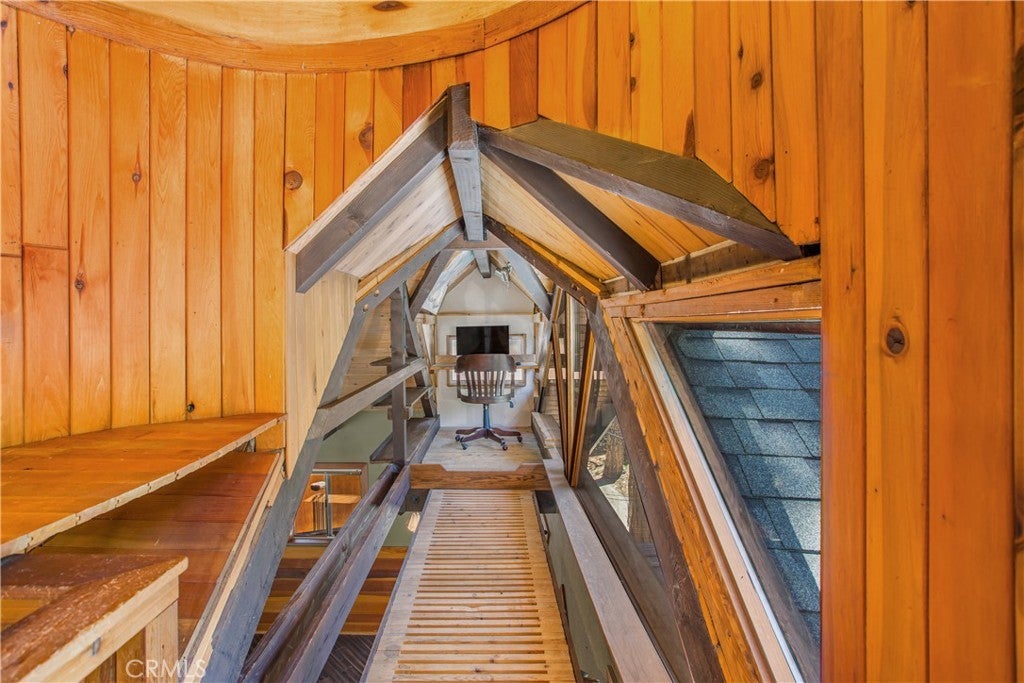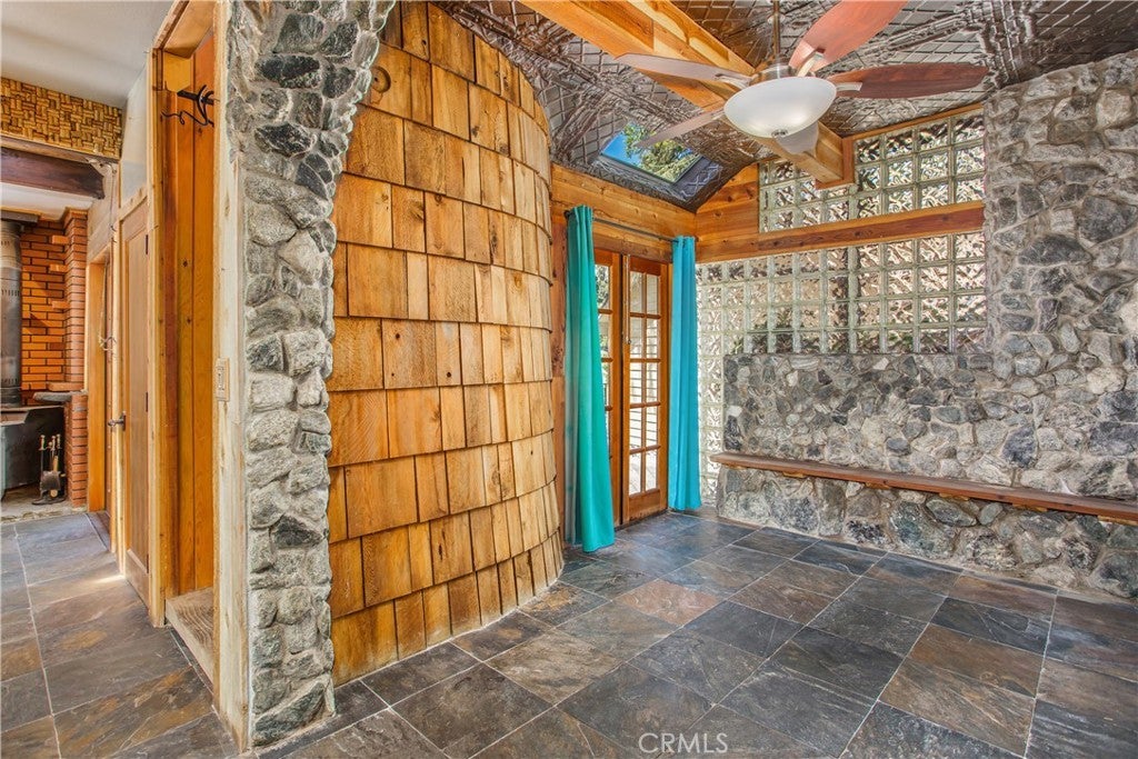 Welcome to this truly one-of-a-kind mountain retreat nestled in the heart of Forest Falls and backing directly to the San Bernardino National Forest. This unique 1 bedroom, 2-bathroom home offers warmth, character, and thoughtful upgrades throughout. Enjoy year-round comfort with heated floors, central heating, a cozy woodstove, and an inviting fireplace. The beautifully designed kitchen features granite countertops, abundant cabinet storage, and a rare built-in pizza oven — perfect for entertaining and mountain living. The stunning primary bathroom creates a spa-like experience with a relaxing steam shower. Just off the kitchen, the versatile stone dining room or office showcases a charming stone arch, skylight, and double doors that open to the deck, blending indoor and outdoor living. A dramatic spiral staircase wrapped around a natural tree trunk leads to the expansive open bedroom featuring tall ceilings, a fireplace, skylight, and catwalk access to the secondary bath. The catwalk also leads to a private balcony, while the bedroom itself opens to two additional decks — one highlighted by a peaceful swinging bench. Continue up the spiral staircase to an additional catwalk and bonus office or storage space. If you’re looking for a distinctive mountain property with architectural character and direct forest access, this Forest Falls gem is not to be missed!