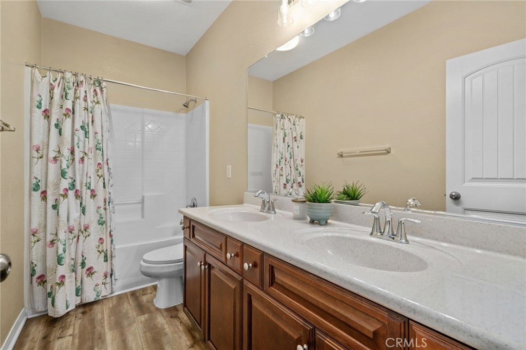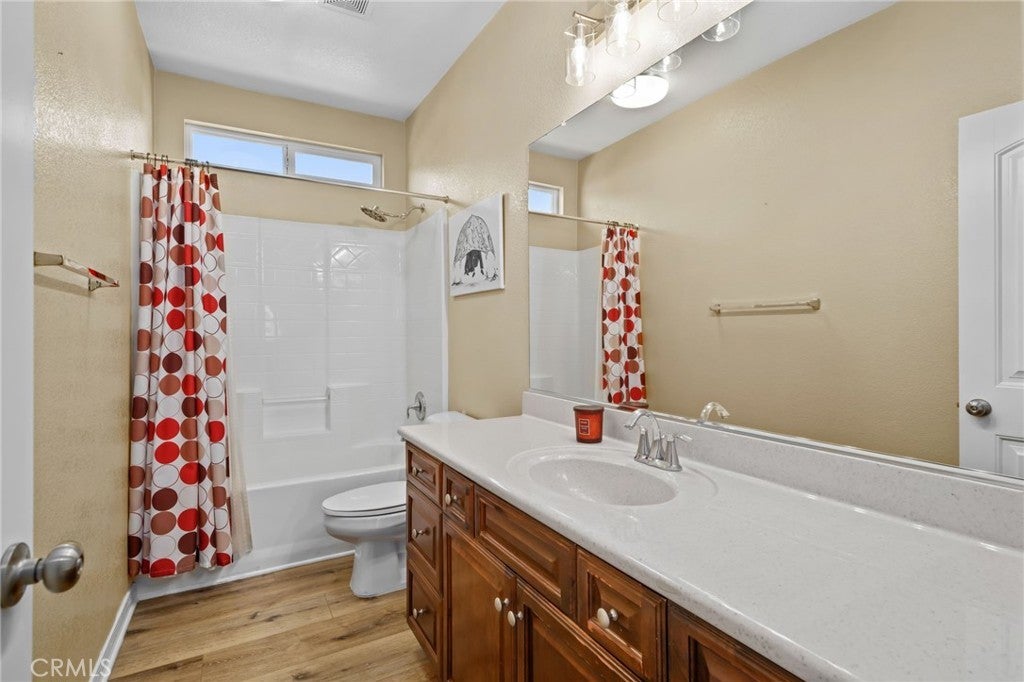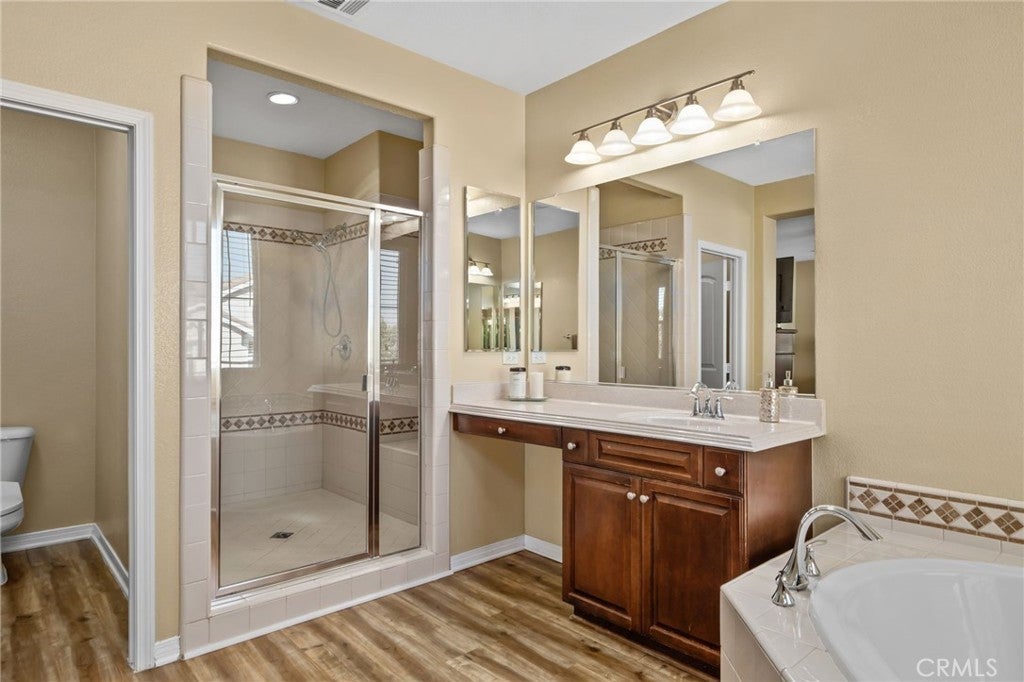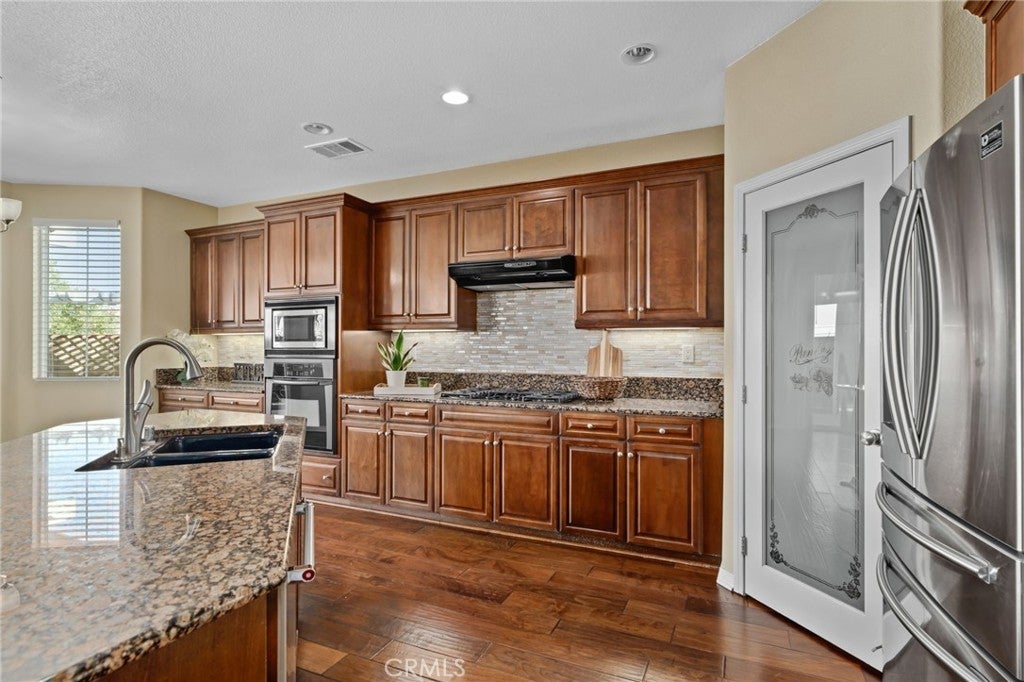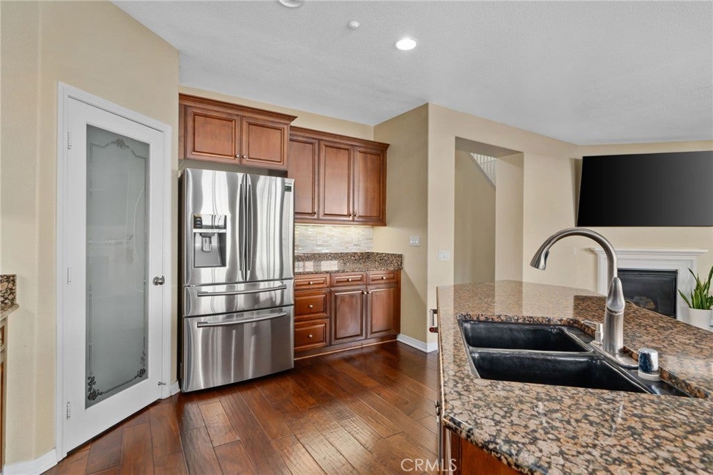 Welcome to this exquisite, corner-lot Hunters Ridge residence in North Fontana, where stunning curb appeal meets modern elegance. Enjoy a beautifully designed porch walkway leading to a grand double-door entry, complemented by a freshly painted exterior, an oversized driveway with ample side parking, and convenient RV parking. As you step inside, you’re greeted by a wide entryway that flows seamlessly into the formal living room and separate dining room, perfect for entertaining. The main floor features a convenient bedroom with its own bathroom, as well as an office space and a stylish powder bathroom. The spacious family room boasts a cozy fireplace and is open to the gourmet kitchen, which is a chef’s dream. Highlights of the kitchen include a walk-in pantry, large kitchen island, built-in microwave and oven, cooktop, and elegant granite countertops. A charming breakfast nook offers sliding doors that lead to the backyard oasis. Upstairs, the open railing invites you to explore two expansive loft areas, providing versatile spaces for relaxation or play. The massive primary suite features abundant natural light, a generous walk-in closet, and a luxurious primary bathroom complete with a vanity area, jetted tub, and separate shower. Additionally, the upper level includes three well-appointed bedrooms, two bathrooms, and a convenient laundry room equipped with cabinets and a sink. Step into the backyard, where you’ll find a serene retreat featuring a barbecue area, covered patio with a refreshing mist system, four fruit trees, and lush green grass surrounded by beautifully landscaped plants—perfect for outdoor enjoyment and entertaining. This home also boasts paid-off solar panels, offering energy efficiency and savings on utility bills. Plus, it is situated within the award-winning Etiwanda School District, making it perfect for families. Recent updates include all new flooring installed in October 2025, enhancing both the upstairs and downstairs living spaces. Don’t miss the opportunity to make this stunning property your new home!