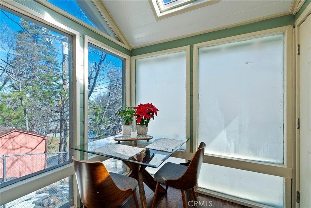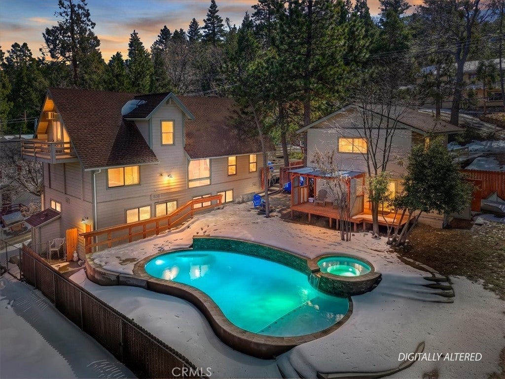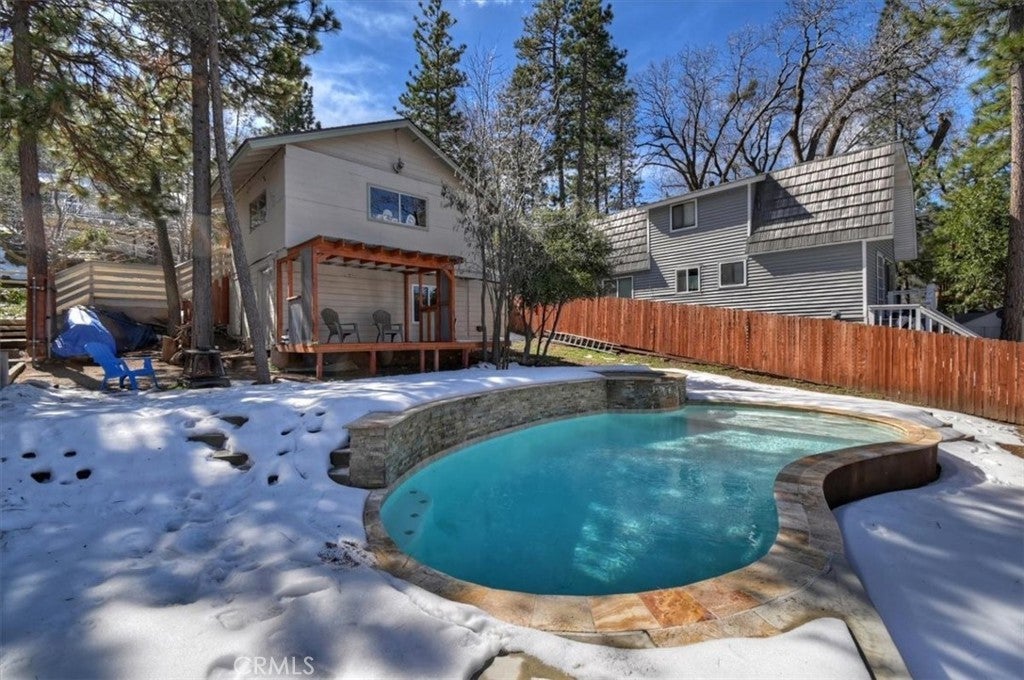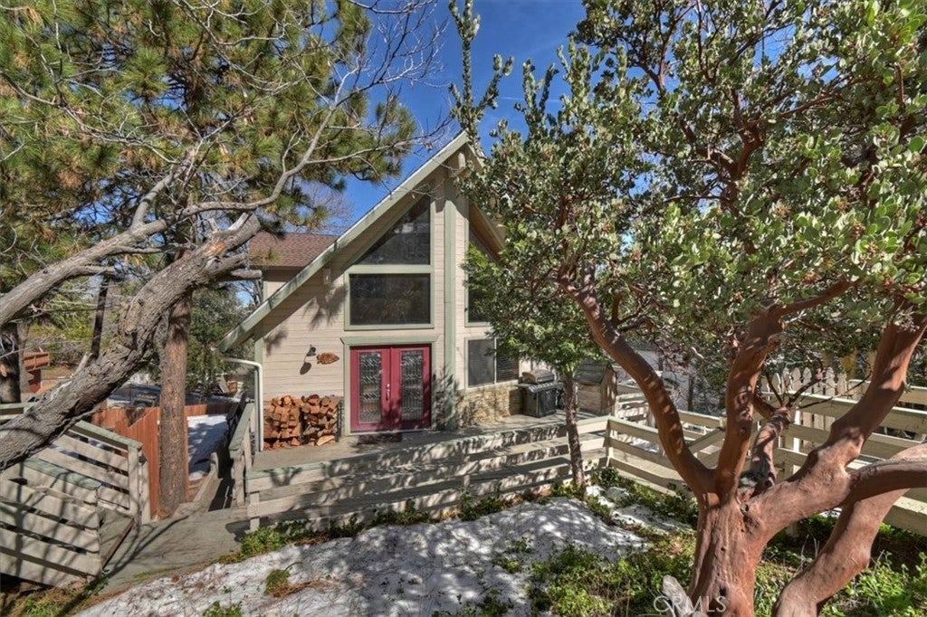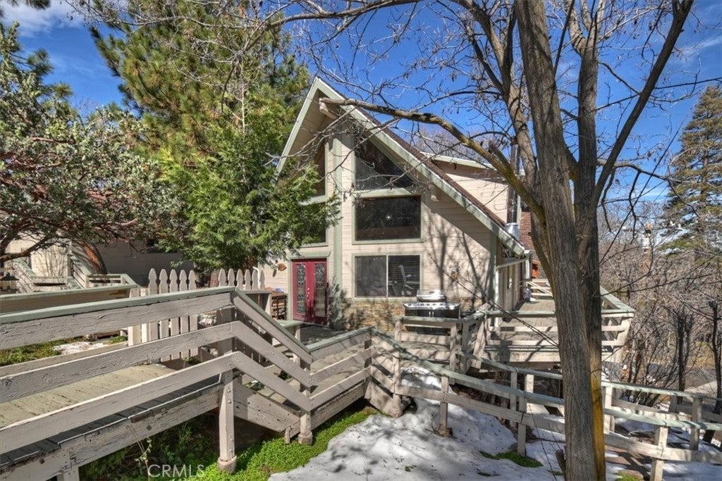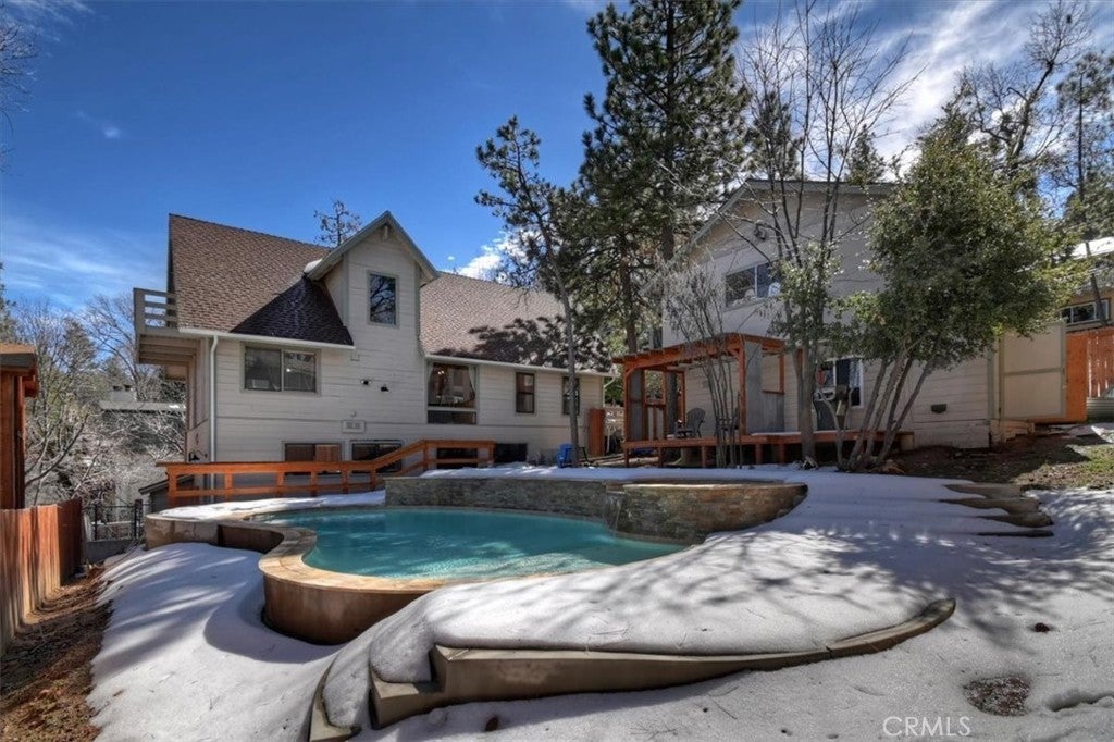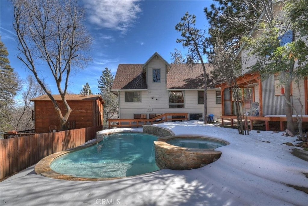 Unique mountain retreat featuring a rare in-ground pool and spa located in Lake Arrowheads charming Deer Lodge Park community. Situated on a spacious corner lot, this property offers a detached garage with ample storage below and a newly redone parking deck. Two separate yard areas provide space for the pool, entertaining, pets, or potential tenants. Just a few steps lead to the front door where you enter the open-concept main living area featuring vaulted, beamed T&G ceilings and a dramatic wall of windows that fills the space with natural light. The living room includes a newer wood-burning stove for cozy winter evenings and a newer A/C split unit for comfortable summers. The kitchen features a large island with a gas cooktop and breakfast bar seating, granite countertops, and double ovens. The dining area overlooks the beautiful pool and spa, creating a perfect setting for entertaining. The main floor offers two bedrooms and a bathroom. Upstairs, you’ll find a spacious primary suite with a loft office area, two separate vanity's; one with dual sinks and other for getting ready, walk in closet, and a private balcony. The lower level includes a separate apartment ideal for rental income or guest accommodations, with the potential to convert it back into part of the main residence. It offers one large bedroom with ample storage, bathroom, kitchen, pantry, and sunroom feel dining room, with fenced side yard. Large laundry room/mudroom. Enjoy outdoor living in the charming poolside gazebo, perfect for relaxing or entertaining. If you love nature and hiking there are trails and the popular Pinnacles to explore nearby. Whether you’re looking for a full-time residence that feels like a private staycation or a mountain vacation retreat, this property is truly one of a kind!