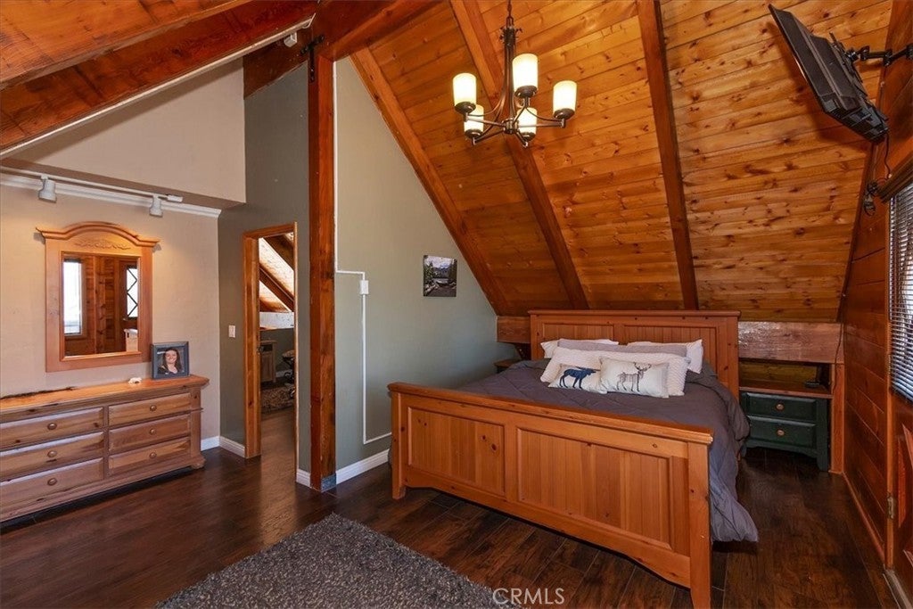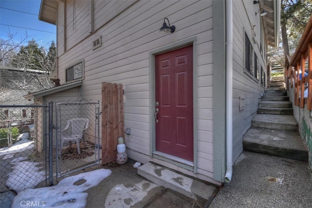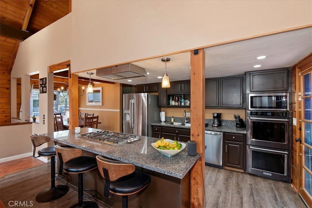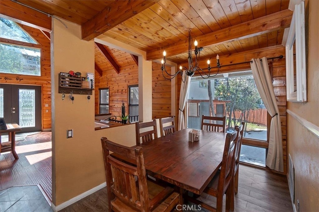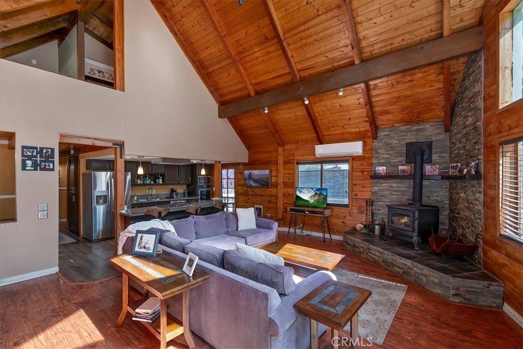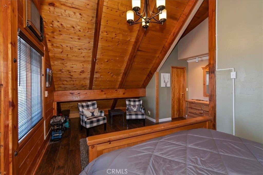 Unique mountain retreat featuring a rare in-ground pool and spa located in Lake Arrowheads charming Deer Lodge Park community. Situated on a spacious corner lot, this property offers a detached garage with ample storage below and a newly redone parking deck. Two separate yard areas provide space for the pool, entertaining, pets, or potential tenants. Just a few steps lead to the front door where you enter the open-concept main living area featuring vaulted, beamed T&G ceilings and a dramatic wall of windows that fills the space with natural light. The living room includes a newer wood-burning stove for cozy winter evenings and a newer A/C split unit for comfortable summers. The kitchen features a large island with a gas cooktop and breakfast bar seating, granite countertops, and double ovens. The dining area overlooks the beautiful pool and spa, creating a perfect setting for entertaining. The main floor offers two bedrooms and a bathroom. Upstairs, you’ll find a spacious primary suite with a loft office area, two separate vanity's; one with dual sinks and other for getting ready, walk in closet, and a private balcony. The lower level includes a separate apartment ideal for rental income or guest accommodations, with the potential to convert it back into part of the main residence. It offers one large bedroom with ample storage, bathroom, kitchen, pantry, and sunroom feel dining room, with fenced side yard. Large laundry room/mudroom. Enjoy outdoor living in the charming poolside gazebo, perfect for relaxing or entertaining. If you love nature and hiking there are trails and the popular Pinnacles to explore nearby. Whether you’re looking for a full-time residence that feels like a private staycation or a mountain vacation retreat, this property is truly one of a kind!