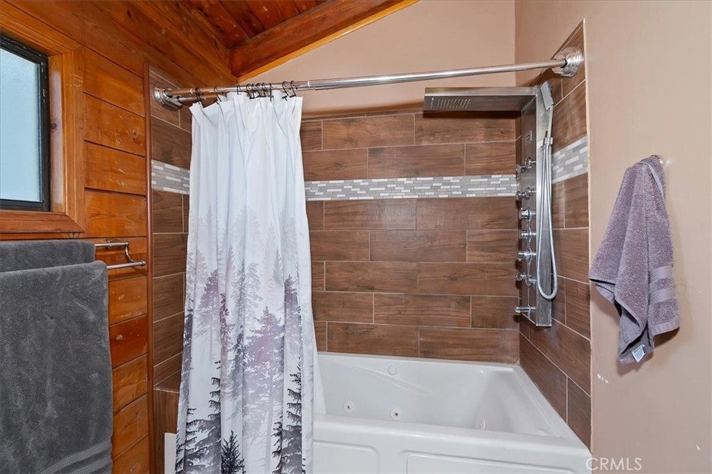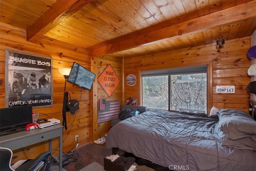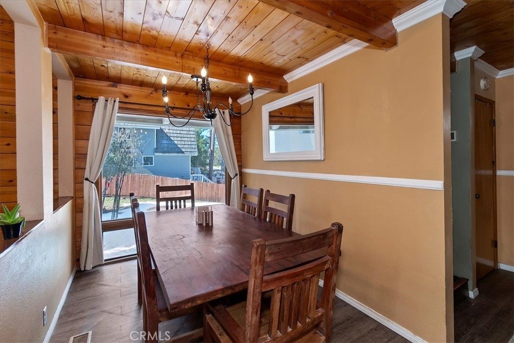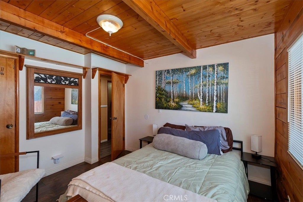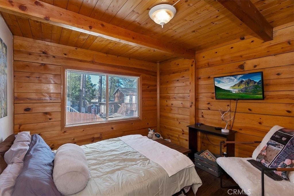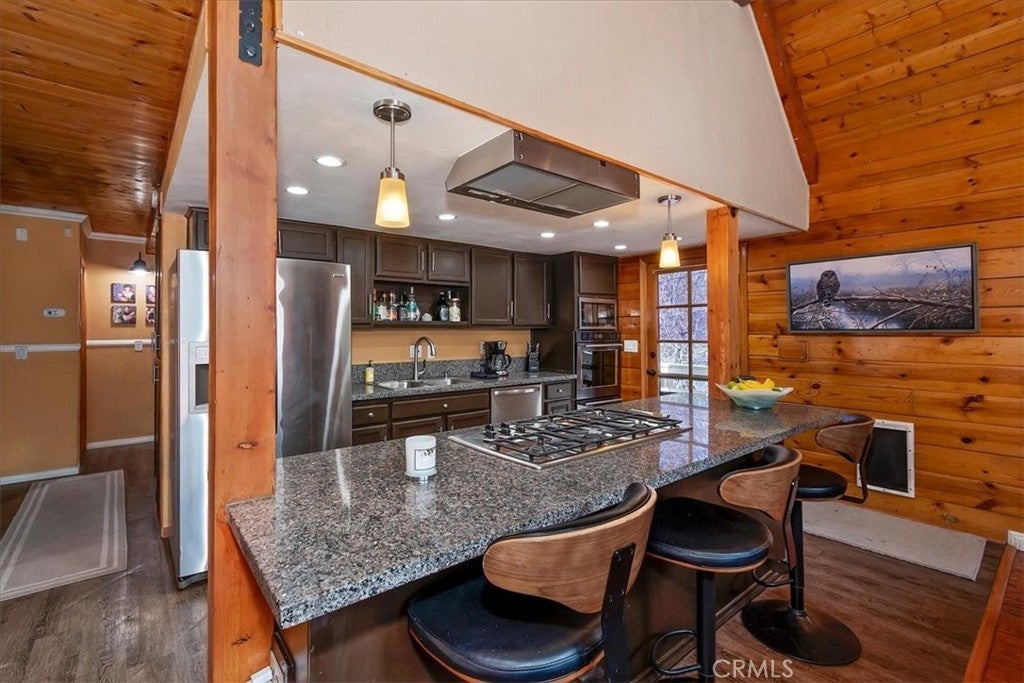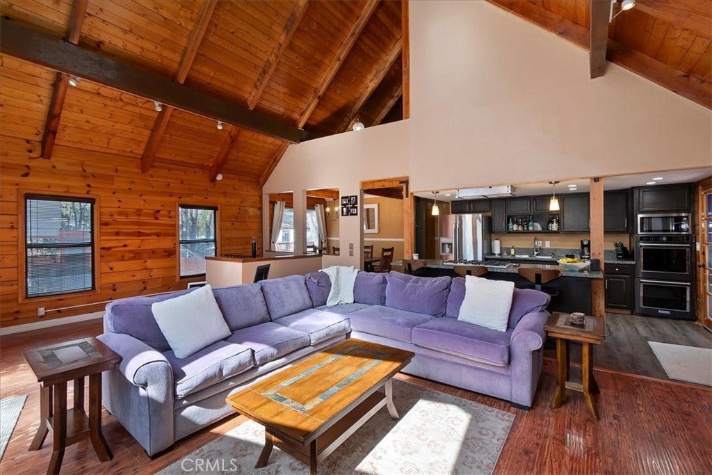 Unique mountain retreat featuring a rare in-ground pool and spa located in Lake Arrowheads charming Deer Lodge Park community. Situated on a spacious corner lot, this property offers a detached garage with ample storage below and a newly redone parking deck. Two separate yard areas provide space for the pool, entertaining, pets, or potential tenants. Just a few steps lead to the front door where you enter the open-concept main living area featuring vaulted, beamed T&G ceilings and a dramatic wall of windows that fills the space with natural light. The living room includes a newer wood-burning stove for cozy winter evenings and a newer A/C split unit for comfortable summers. The kitchen features a large island with a gas cooktop and breakfast bar seating, granite countertops, and double ovens. The dining area overlooks the beautiful pool and spa, creating a perfect setting for entertaining. The main floor offers two bedrooms and a bathroom. Upstairs, you’ll find a spacious primary suite with a loft office area, two separate vanity's; one with dual sinks and other for getting ready, walk in closet, and a private balcony. The lower level includes a separate apartment ideal for rental income or guest accommodations, with the potential to convert it back into part of the main residence. It offers one large bedroom with ample storage, bathroom, kitchen, pantry, and sunroom feel dining room, with fenced side yard. Large laundry room/mudroom. Enjoy outdoor living in the charming poolside gazebo, perfect for relaxing or entertaining. If you love nature and hiking there are trails and the popular Pinnacles to explore nearby. Whether you’re looking for a full-time residence that feels like a private staycation or a mountain vacation retreat, this property is truly one of a kind!