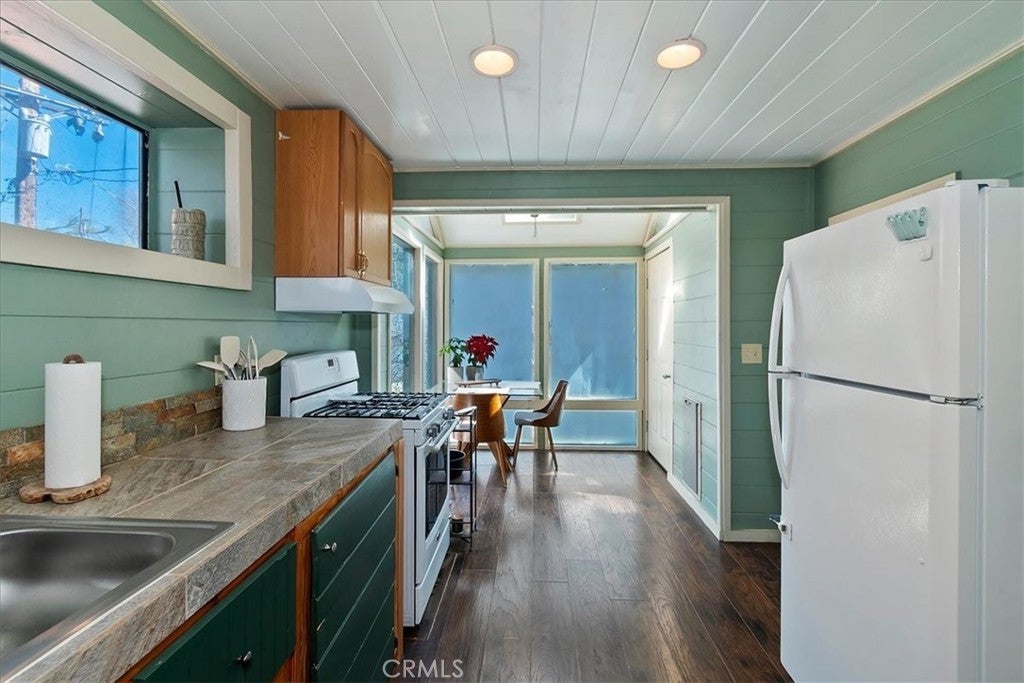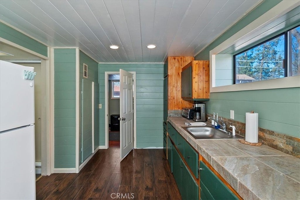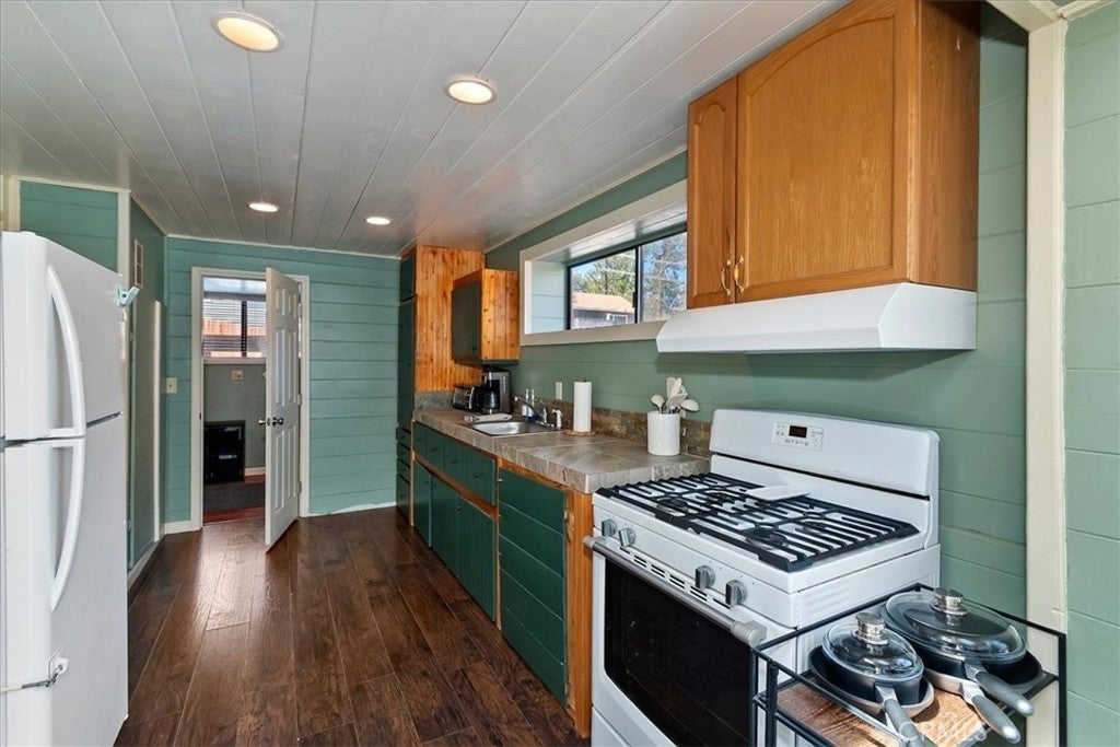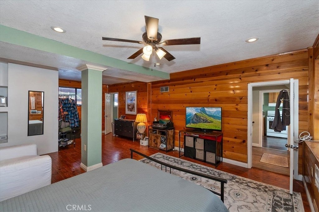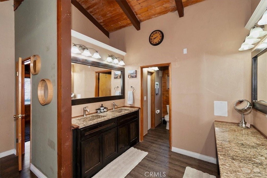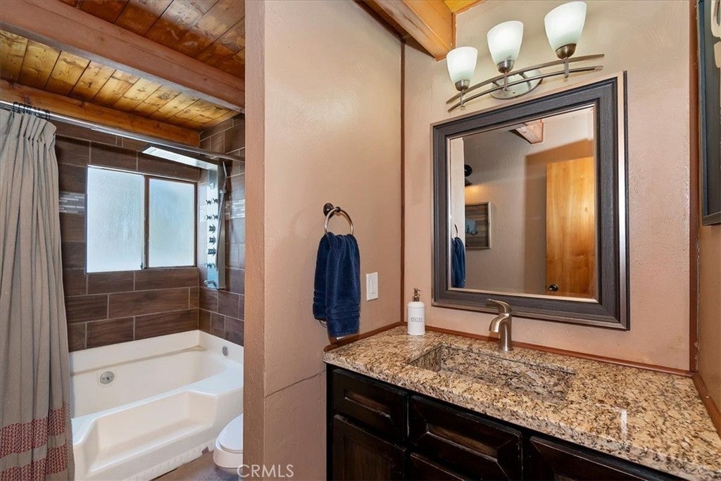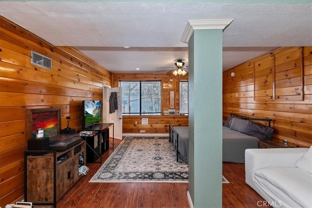 Unique mountain retreat featuring a rare in-ground pool and spa located in Lake Arrowheads charming Deer Lodge Park community. Situated on a spacious corner lot, this property offers a detached garage with ample storage below and a newly redone parking deck. Two separate yard areas provide space for the pool, entertaining, pets, or potential tenants. Just a few steps lead to the front door where you enter the open-concept main living area featuring vaulted, beamed T&G ceilings and a dramatic wall of windows that fills the space with natural light. The living room includes a newer wood-burning stove for cozy winter evenings and a newer A/C split unit for comfortable summers. The kitchen features a large island with a gas cooktop and breakfast bar seating, granite countertops, and double ovens. The dining area overlooks the beautiful pool and spa, creating a perfect setting for entertaining. The main floor offers two bedrooms and a bathroom. Upstairs, you’ll find a spacious primary suite with a loft office area, two separate vanity's; one with dual sinks and other for getting ready, walk in closet, and a private balcony. The lower level includes a separate apartment ideal for rental income or guest accommodations, with the potential to convert it back into part of the main residence. It offers one large bedroom with ample storage, bathroom, kitchen, pantry, and sunroom feel dining room, with fenced side yard. Large laundry room/mudroom. Enjoy outdoor living in the charming poolside gazebo, perfect for relaxing or entertaining. If you love nature and hiking there are trails and the popular Pinnacles to explore nearby. Whether you’re looking for a full-time residence that feels like a private staycation or a mountain vacation retreat, this property is truly one of a kind!