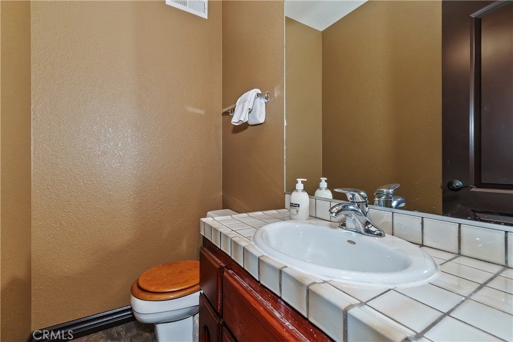 A 4 bedroom, 2.5 bathroom Moonridge cabin with panoramic ski slopes views and peek-a-boo lake view! Imagine your evenings after a day of play, relaxing on the front deck watching the sunset beyond Bear Mountain ~ The main level gives you an open floor plan with vaulted ceilings, one bedroom and full bathroom ~ In the living room you get a wood burning brick fireplace as your center piece and ski slope views ~ The kitchen has classic tile counter tops, stainless steel appliances and wood grain laminate flooring ~ You also get ski slope views from the dining area ~ The lower level has 3 more bedrooms with a half bathroom in the master, your second full bathroom, laundry and access to your back patio ~ The back patio is home to your hot tub for unwinding your weary body after a day on the slopes, hiking, mountain biking, or whatever adventure you choose ~ This cabin is a short walk to National Forest access, located at the end of Yosemite Dr, and short drive to the ski slopes ~ If you want to feel like you are above it all in a place where you can let your mind and body find peace, this is the cabin for​​‌​​​​‌​​‌‌​​‌​​​‌‌​​​​​​‌‌​‌‌​​‌​​​‌‌​ you!