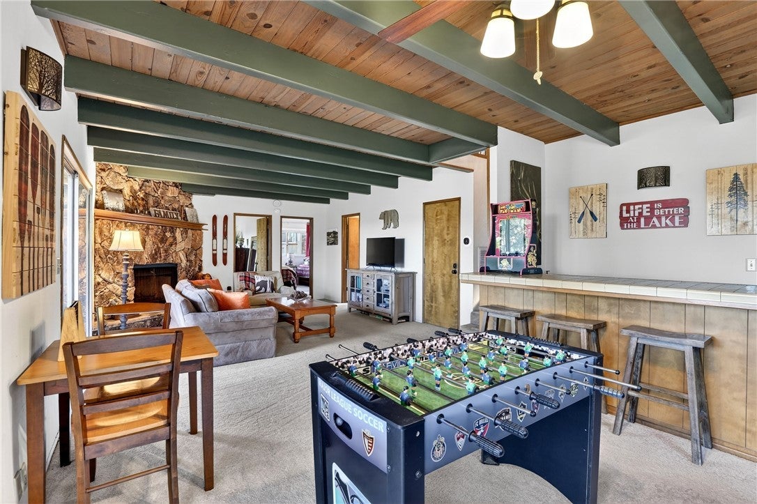 The most beautiful forest & golf course views from this thunderbird floorplan home! The perfect mix of cabin feel & modern convenience with just the right amount of updates. Home has been well maintained & updated including a new roof, decks, exterior rock facade, remodeled kitchen & air conditioning! Nice split level design makes living easy too! Once inside you will find a nice entry area with slate flooring & a coat closet. Great place to remove your shoes and head on in! Go up 1/2 flight to the main level & enjoy the vaulted ceilings, wall of windows, and a beautiful rock fireplace. This area is filled with beautiful natural light from windows facing both east & west. On the main level you will also find a nice size dining area & adjacent remodeled kitchen. Beautiful quartz countertops & new appliances along with LVP flooring. Two new sliding glass doors from the dining & living room take you to the huge rear deck. Check out the golf course and far ridgeline & forest views. This level also has a large bedroom & a full bathroom with double vanity & sunken tub. Back down the stairs you will find a very large family room area which features a wet bar, another fireplace, a laundry room & access to outside. There is also another bathroom on this level along with 2 good sized bedrooms. Room for everyone! This level also has it's own deck! This home is move in ready and could be available mostly furnished. Great neighborhood close to the golf course & Blue Jay. Also located on a plowed & maintained road for excellent year round access! A must see for those looking for a move in ready getaway!
