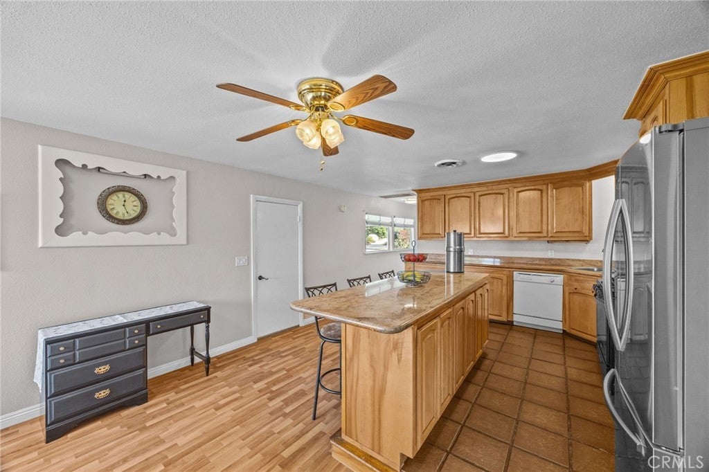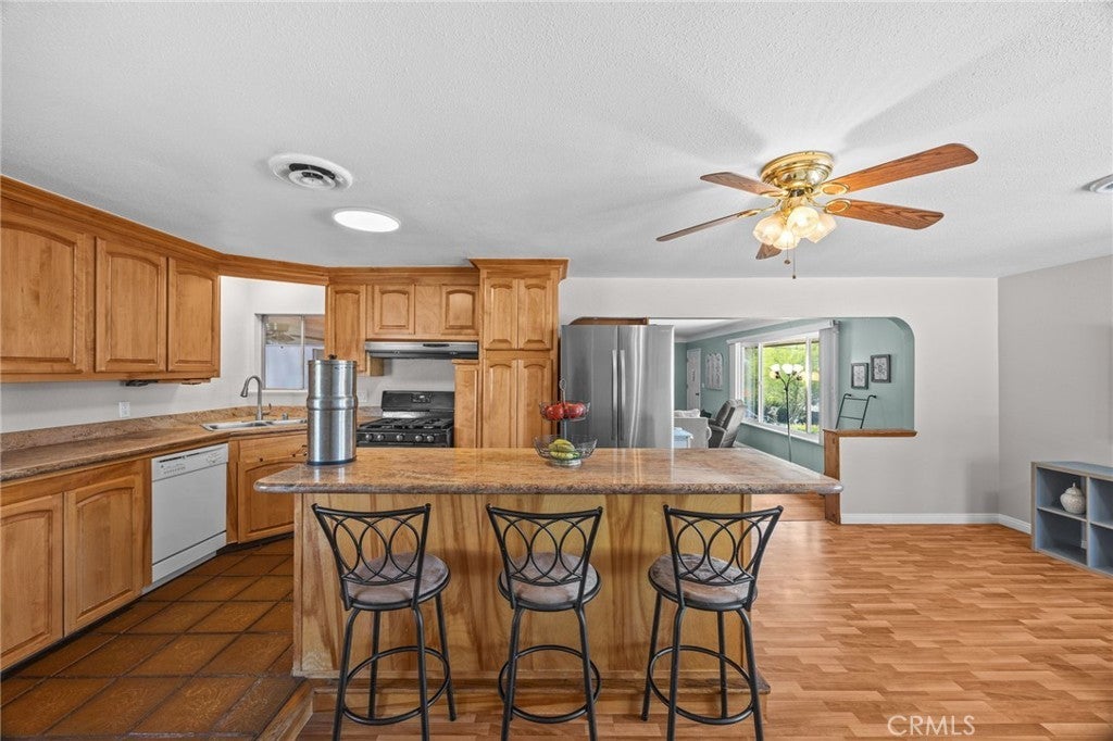 • Interior FeaturesBreakfast Bar, Ceiling Fan(s), Eat-in Kitchen, Granite Counters, Bedroom on Main Level, Main Level Primary, Primary Suite, Country Kitchen
