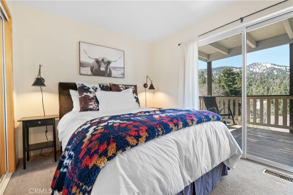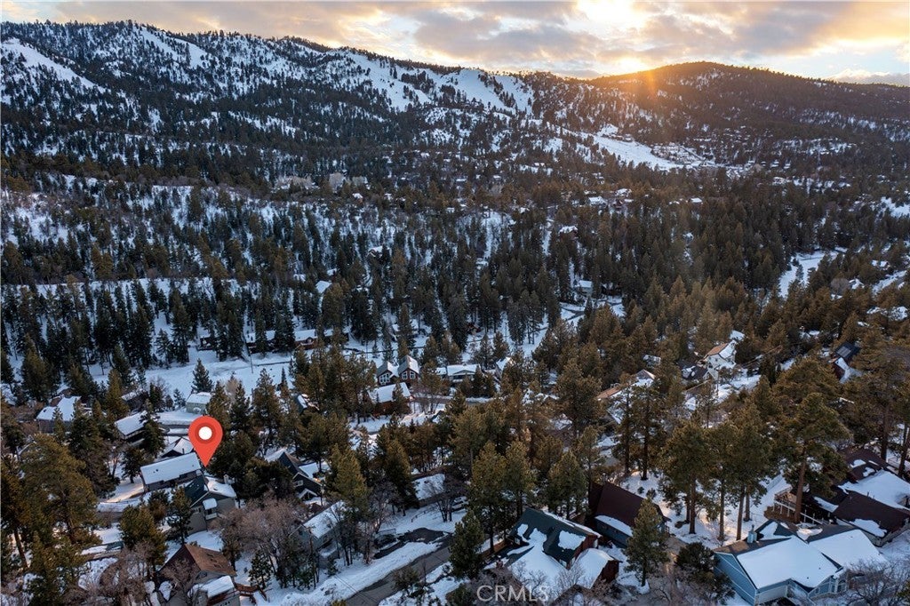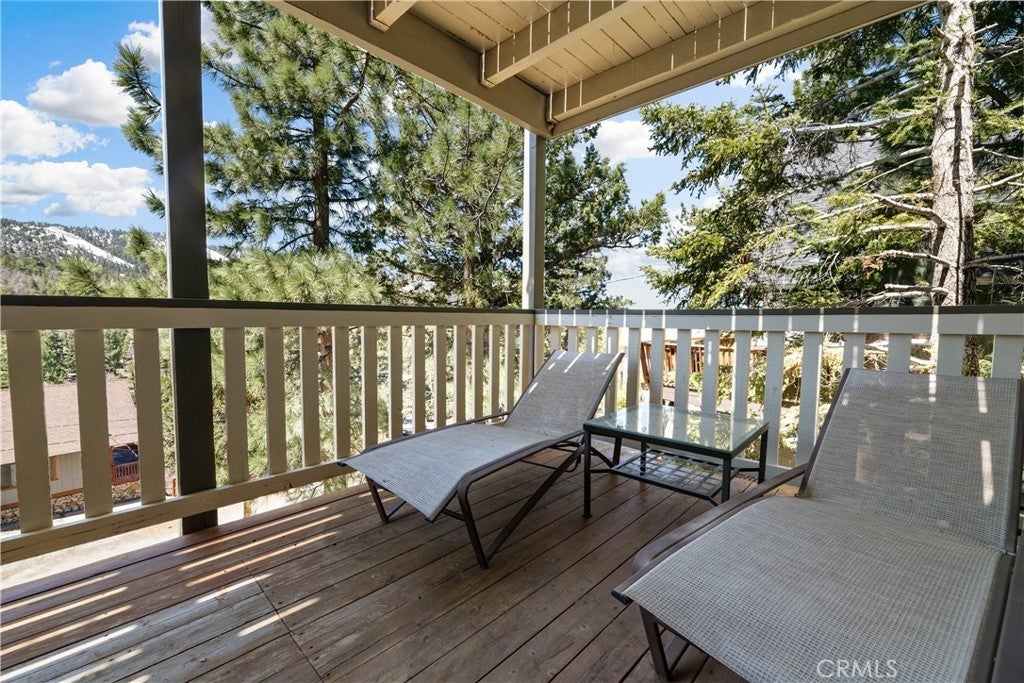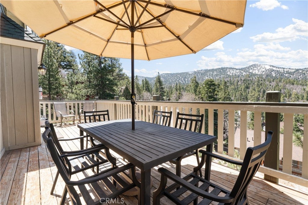 Stunning unobstructed mountain views! This home is in an amazing location nestled into the hillside in a quiet Moonridge neighborhood. With close proximity to the National Forest Trailhead and the secluded nature of this home you will have an amazing mountain experience every time you are at the home. Approximately 1.5 miles to Bear Mountain, Alpine Zoo, and Bear Mountain Golf Course. 3.5 miles to Snow Summit. The open floor plan features a spacious kitchen, vaulted ceilings, and lots of natural light. Amazing views from a majority of windows throughout the property. Sits on a large lot with lots of privacy. Enjoy the two large decks (and spa) for outdoor entertaining and panoramic mountain views. Take in the skiers on the slope, and lake view! This reverse floor plan has a beautiful rock fireplace, stainless steel appliances, and new fixtures throughout. The upstairs is freshly painted with new vinyl plank flooring. The bottom floor offers three bedrooms, two full bathrooms, laundry with your open living upstairs! Direct access to property from Canyon Crest. Driveway has recently been lengthened and has room for about 5 vehicles. Tons of storage under the deck/house.