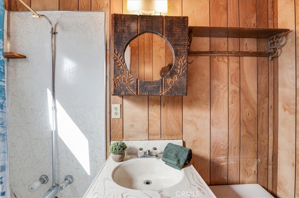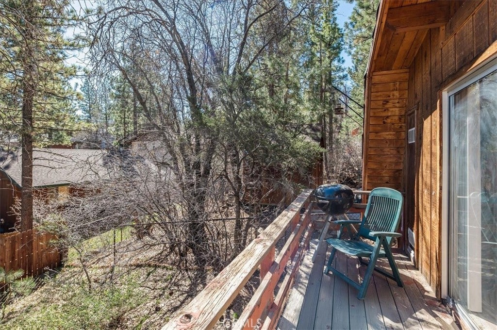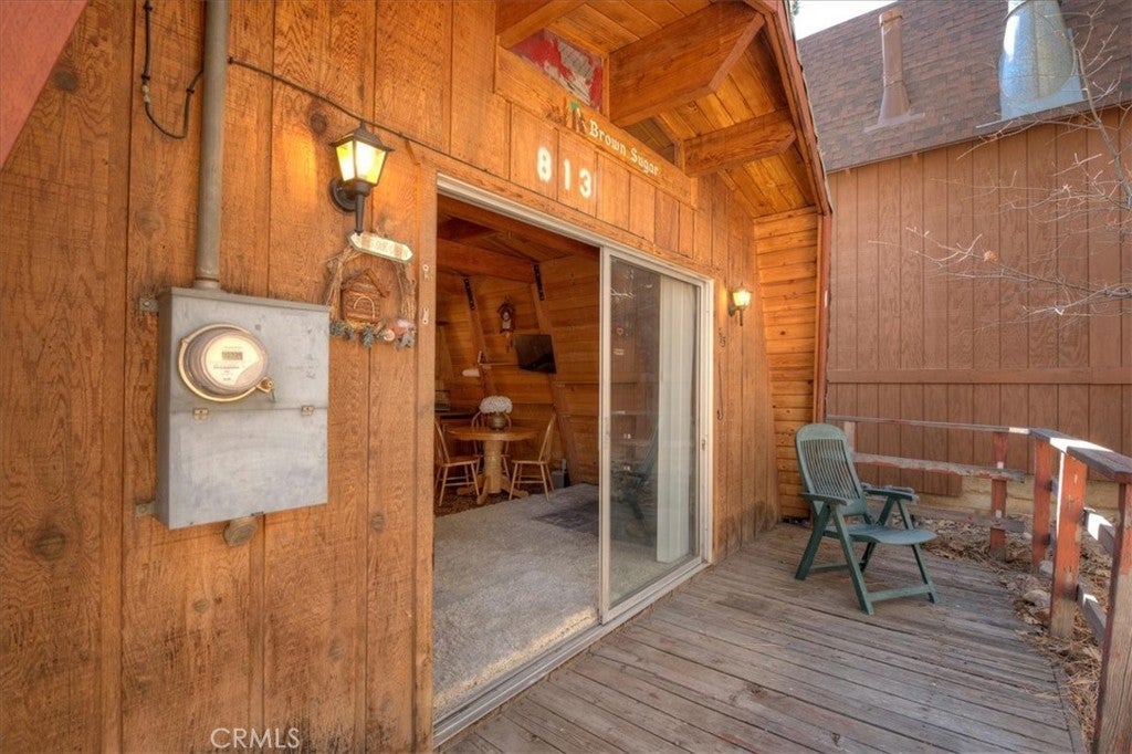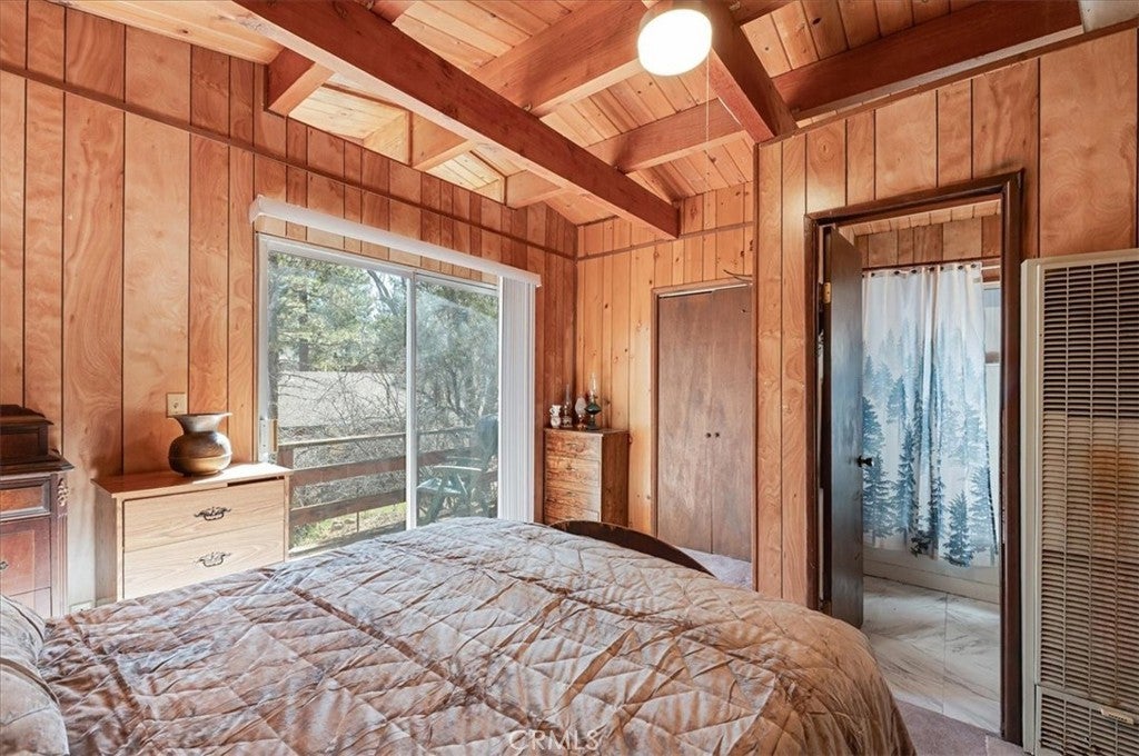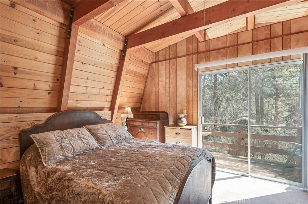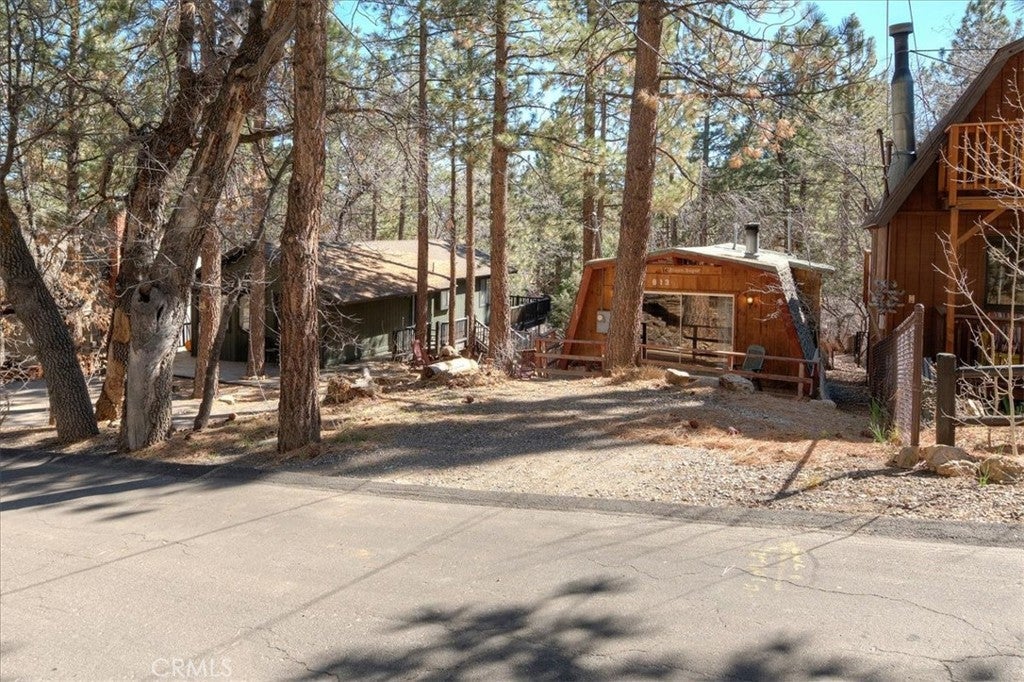 Charming vintage cabin nestled in a peaceful, wooded setting, offering the perfect opportunity for a fixer-upper or weekend retreat. This 1-bedroom, 1-bath home features exposed wood-beam ceilings, warm wood-paneled walls, and an inviting open living space filled with rustic character. The cozy living area is highlighted by a mid-century wood-burning fireplace, creating a perfect focal point for relaxing mountain evenings. The kitchen and dining area offer a functional layout with vintage charm, ready for your personal touch. The bedroom provides direct access to a private deck overlooking the natural surroundings—ideal for enjoying fresh air and tranquil views. Surrounded by mature trees, this property offers privacy and a serene atmosphere. Nine houses away from the National Forest.