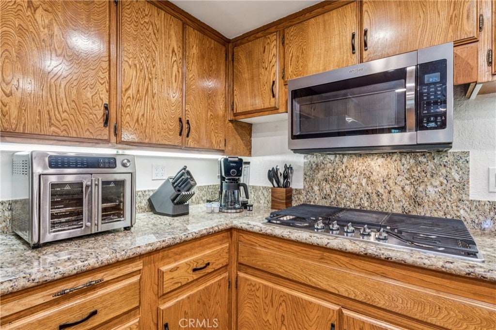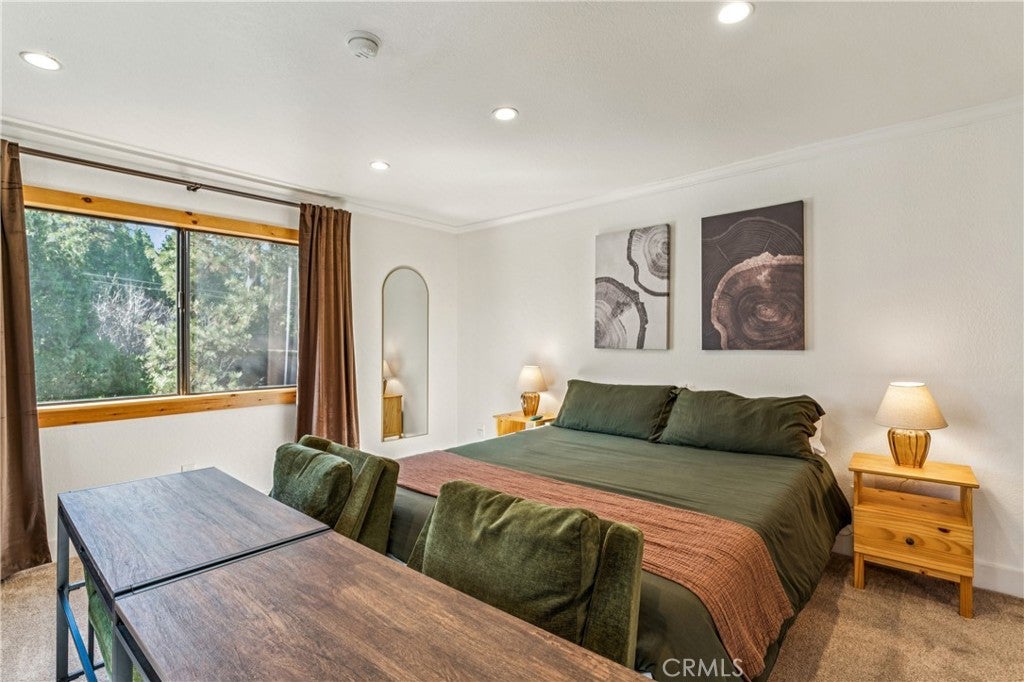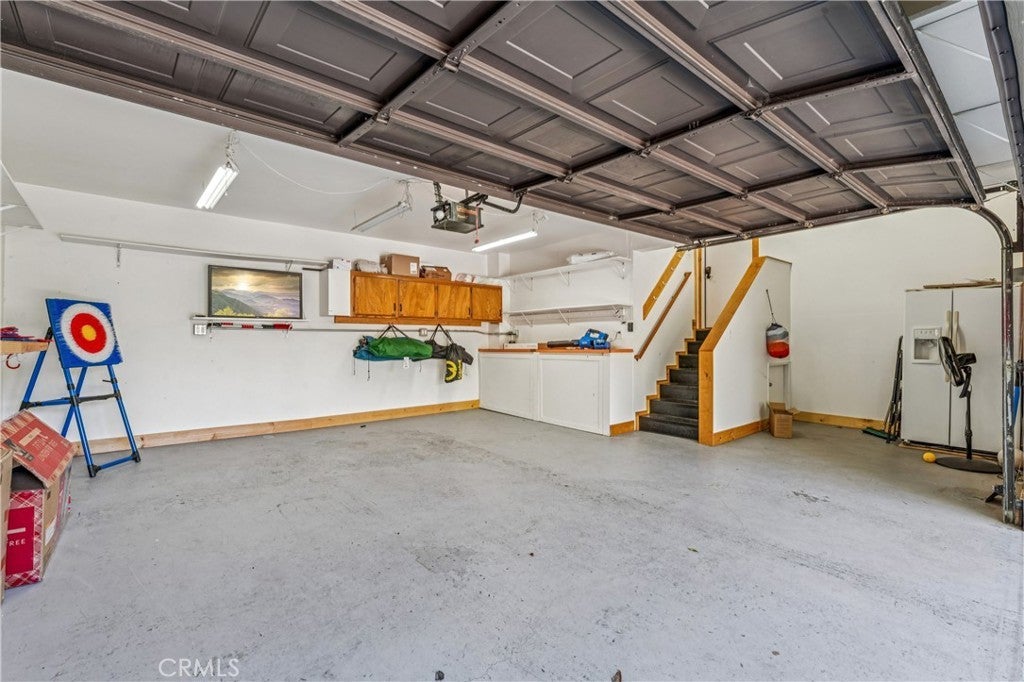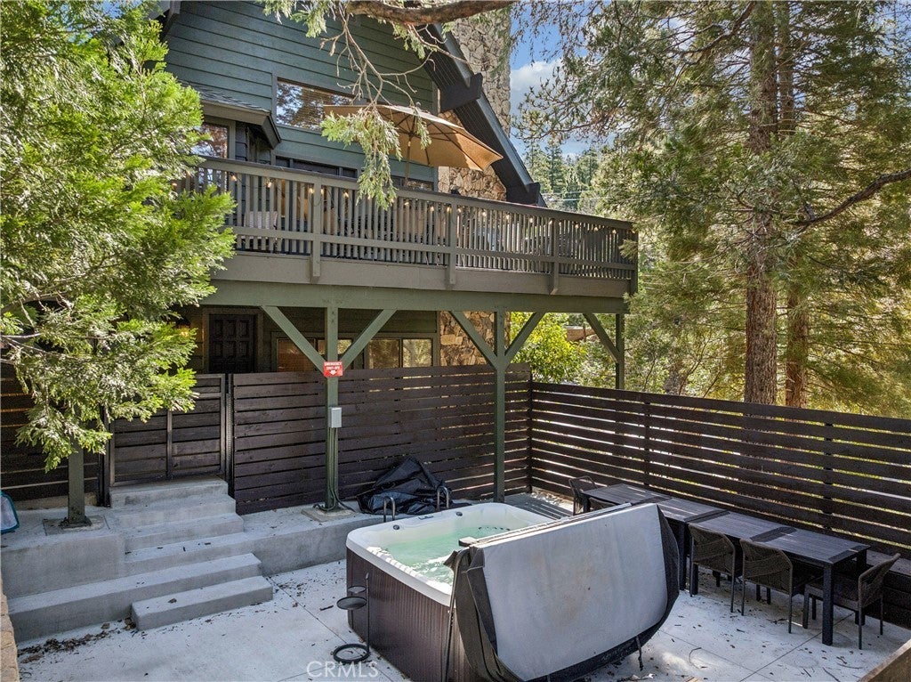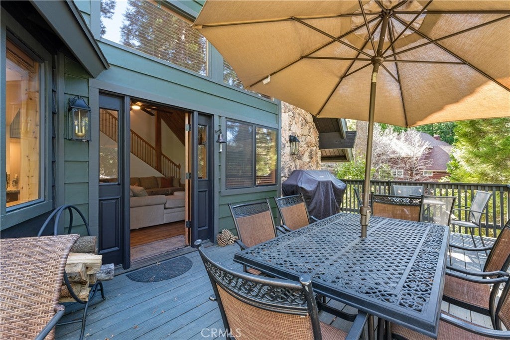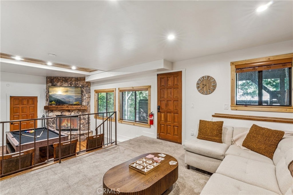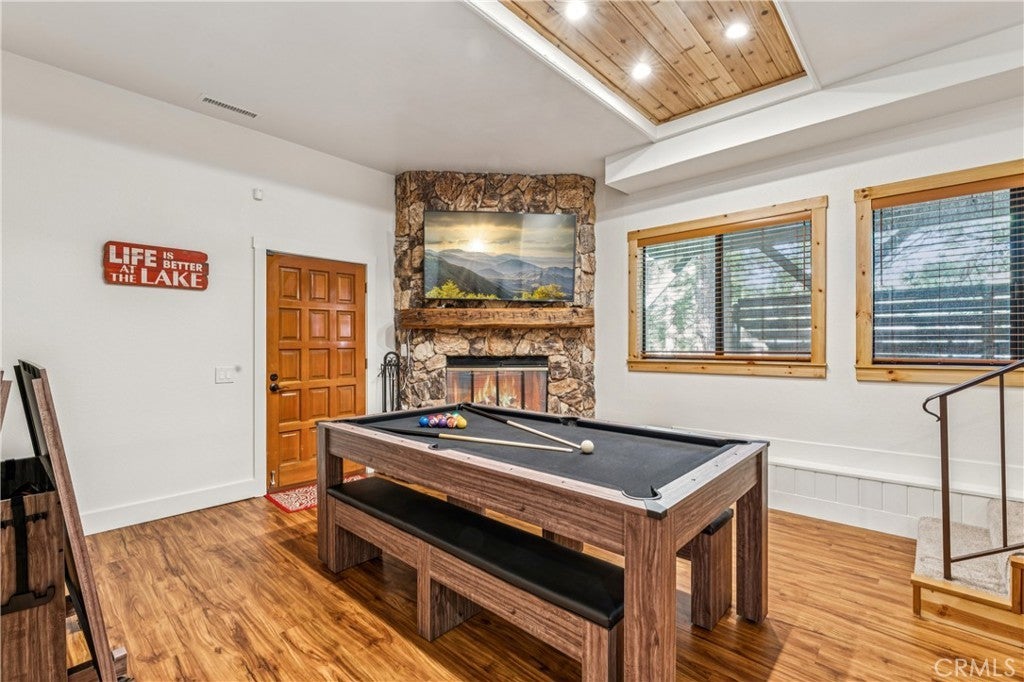 Premier 1st Tier Golf Course Mountain Home with Lake Rights!! Live the ultimate mountain lifestyle! This spectacular updated home is just a short walk to Grass Valley Lake, a quick golf cart ride to Lake Arrowhead Country Club, and includes lake rights. Updated in 2022, the home features 4 bedrooms, 3.5 bathrooms, and approximately 3,253 sq. ft., including a loft and bonus room above the garage. Vaulted wood beam ceilings and abundant natural light highlight the open kitchen, dining, and living area. The kitchen is upgraded with granite countertops and stainless-steel appliances, flowing seamlessly to the living room with a stone wood-burning fireplace and custom barn wood mantel. The dining area includes a custom bench seat and table. Two primary suites on the main and third floors feature attached bathrooms with granite countertops, soft-close cabinetry, and generous closets. The main floor includes a laundry room with washer and dryer. Entertainment options abound with two game rooms: the first-floor room has a TV, fireplace, wet bar, mini fridge, pool table, bedroom, and full bath; the bonus room above the garage. Attached two-car garage with golf cart bay, plus multiple driveways for cars, RVs, or boats. Situated on a private corner lot, the home offers three decks with patio furniture, a recently painted exterior, and a gated spa for relaxation. Sleeps 12+, with kid-friendly features including a secret passageway from the third-floor loft to the bonus room and a custom playhouse with wraparound deck. The bottom floor could serve as a separate suite with a built-in fridge, wet bar, and private entrance. Modern amenities, generous living space, and a prime location with lake rights and close proximity to the golf course make this property ideal as a permanent residence or mountain vacation retreat!