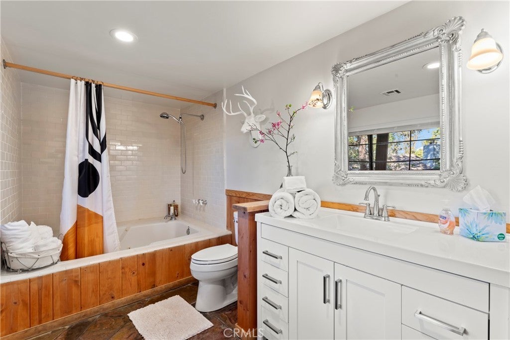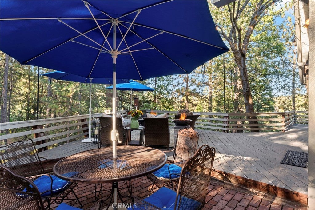 Turnkey Postcard Vintage Charmer located in Arrowhead Woods inclusive of Lake Rights with all the Bells and Whistles while simultaneously Boasting All of The Emotional Essence that the Lake Arrowhead Lifestyle has to offer including a Peek of the Lake! Main Mid-Level Features: Dutch Door Entry, Flagstone Flooring, Granite Kitchen Counters, Vintage Robert Shaw Wester Holly Stainless Steel Oven, Sportsman 4x4 Free Standing Butcher Block, 8 Foot Wood Beamed Ceilings, 3/4 Bath and Laundry Combo, Open Kitchen to Dining Area with Fireplace to Living Room with multiple access to Overflow Outdoor Entertaining Patios. Upper-Level Features: Expansive Open Clear Fir Staircase from Living Room to 3 Comfortable Cozy Bedrooms and Full Bathroom. Lowest Level Features: Spacious Primary Bedroom Ensuite with Brick Fireplace, Soaking Tub, with Access to fenced back yard area astro-turfed for the Pets. Other Features & Upgrades Include: Pex-Plumbing Conversion, Classic Steel Encasement Windows, Whole House Auto Natural Gas Generac Generator, Full Air Conditioning, Whole House Fan, Outdoor Shower, Propane Fire Pit, Monitored Security System, Multiple Cameras, Rear Storage Shed, Wood Enclosure Receptacle for Trash, Partial Sprinklers and Exterior Landscape Lighting.