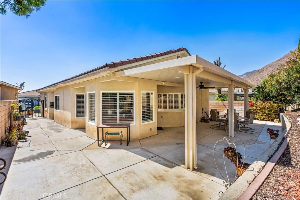 Just moments from the renowned Soboba Casino Resort and the scenic Soboba Springs Golf Course, this beautifully upgraded single-story residence offers the perfect blend of comfort, convenience, and lifestyle-driven living. Spanning approximately 1,300 sq. ft., this turnkey 2-bedroom, 2-bath home welcomes you through a private enclosed side patio entrance into a light-filled open floor plan designed for effortless everyday living. Inside, you’ll find luxury vinyl plank flooring and plantation shutters throughout, complemented by an abundance of natural light that enhances every space. The kitchen is thoughtfully appointed with stainless steel appliances, generous storage, and seamless flow into the main living areas. Both bedrooms are well-proportioned, with a spacious primary suite featuring an en-suite bath for added privacy. Step outside to a fully landscaped backyard designed for low-maintenance enjoyment, complete with an extended covered patio, ceiling fan, mature trees and shrubs, and a retaining wall that adds both dimension and privacy, while fully cemented side yards provide clean, functional outdoor space. Whether you’re seeking a full-time residence, investment or a lock-and-leave option, this home delivers refined, easy living in a prime location where entertainment, golf, and relaxation are all just minutes away.
