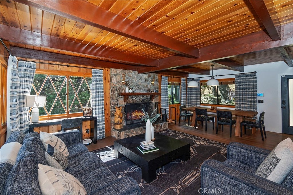 Rustic character meets modern polish in this beautifully updated Lake Arrowhead home with full lake rights. Set directly across from the Lake Arrowhead Country Club and minutes from National Forest trails, this property puts boating, fishing, swimming, hiking, and easy commuter access all within reach. The main level welcomes you with an open layout anchored by a striking stone fireplace in the living room, flowing into a generous dining area built for gathering. The upgraded kitchen pairs high-end appliances with smart design—equally suited to weeknight dinners and weekend entertaining. A well-appointed, main-level bedroom and full bath round out this floor with added flexibility for guests. Upstairs, the primary suite is a genuine retreat: vaulted beamed ceilings, a second stone fireplace, a sitting area, and a private deck overlooking the mountain air. A second bedroom and impeccably finished bathroom share this level with the primary bedroom. Downstairs, the finished lower level is an entertainer’s dream. Wraparound couches, custom artwork, and tasteful décor create a lounge-ready atmosphere, while a mounted 72-inch television with state-of-the-art surround sound turns movie nights and game days into an experience. It’s the kind of space guests never want to leave. Practical details haven’t been overlooked —a two-car garage, ample guest parking, air conditioning, and a tankless water heater keep the home running efficiently year-round. Tastefully maintained and thoughtfully upgraded, this is Lake Arrowhead living at its best—lake privileges and furnishings included and the memories are yours to make.