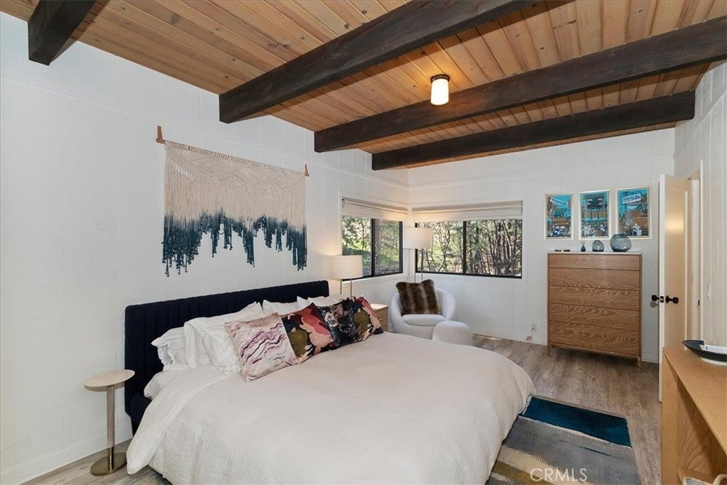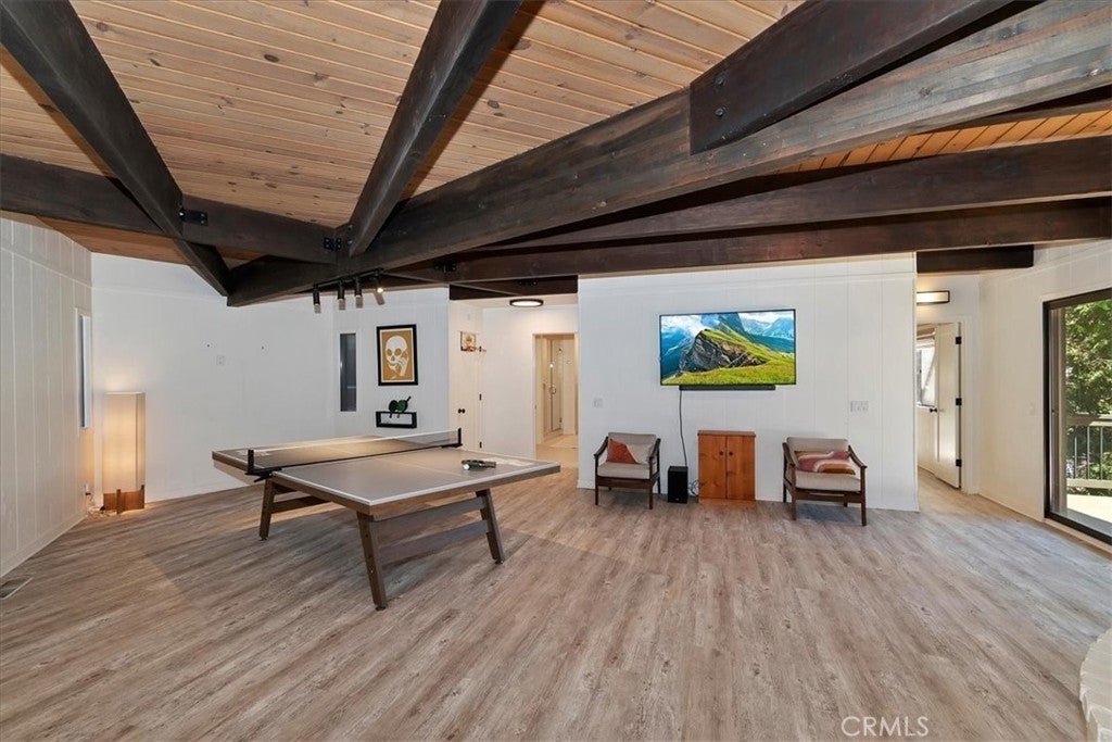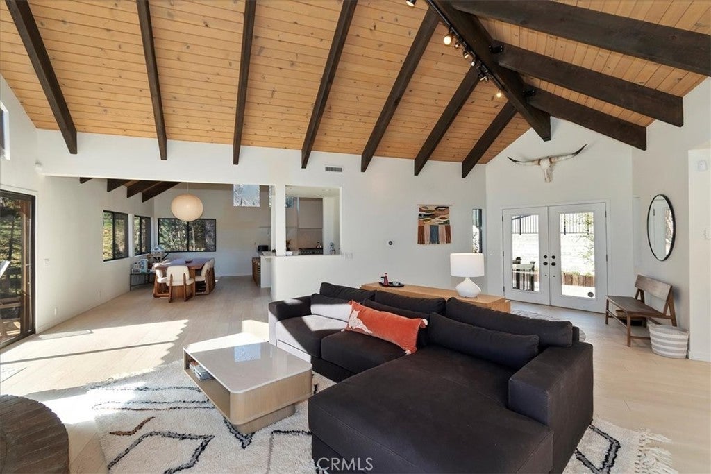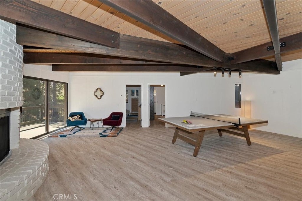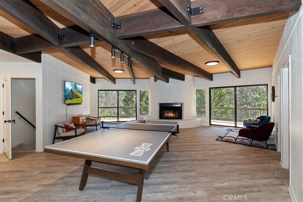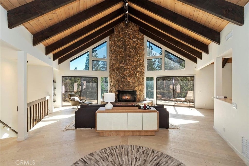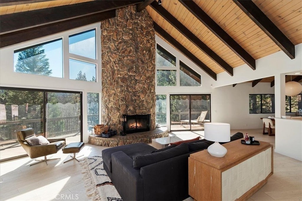 Tucked away at the end of a quiet Riviera cul-de-sac, this resort-style modern cabin offers a rare blend of privacy, luxury, and recreation, complete with lake rights and premier golf course frontage. Privately gated with no HOA, this exceptional property enjoys a serene setting overlooking both the 10th green and 11th tee box near the iconic Arrowhead Monument. Surrounded by towering trees and peaceful streets ideal for leisurely strolls, the location is as desirable as it is tranquil. Thoughtfully remodeled from top to bottom in recent years, the expansive 6+ bedroom home showcases elevated finishes throughout, including updated fixtures, drywall, paint, doors, flooring, kitchen, and bathrooms. A nearly level entry leads into a warm and inviting interior highlighted by soaring beamed ceilings, engineered hardwood floors, and plush wool carpeting. At the heart of the living room, a grand wood-burning fireplace creates a stunning focal point while framing sweeping views of the fairways through dramatic floor-to-ceiling windows that flood the home with natural light.The gourmet kitchen is designed for both everyday living and entertaining, featuring crisp white cabinetry, Caesarstone countertops, premium BlueStar appliances, a walk-in pantry, and a convenient wet bar—all seamlessly open to the main living area. Step outside onto the expansive wraparound deck to take in the picturesque surroundings of lush fairways, mature trees, and rolling hills.The versatile floor plan offers exceptional flexibility, with a main-level bedroom that can serve as a primary suite, complete with ample closet space and a spacious full bath. The lower level is designed for entertainment and relaxation, featuring a large game room with a second wood-burning fireplace, two additional remodeled suites, and a dedicated game room space that could easily convert to another bedroom. An oversized laundry room with a Murphy bed adds even more functionality for hosting guests. Completing the home are two more bedrooms and a newly added theater room, outfitted with luxury recliners and a comfortable sectional for the ultimate movie night experience. With a private golf cart path providing direct access to the course and a portable generator for peace of mind, this one-of-a-kind Lake Arrowhead retreat truly has it all—luxury, comfort, and the perfect setting to gather, entertain, and unwind.