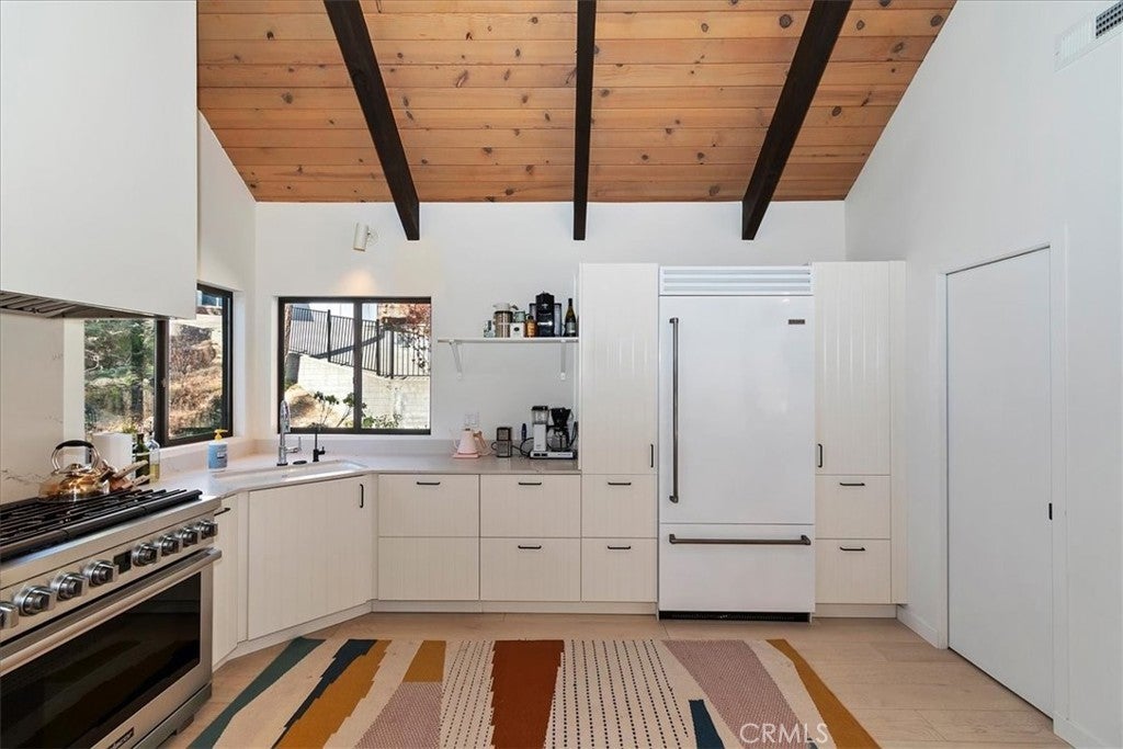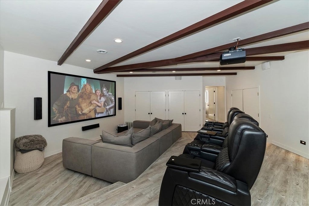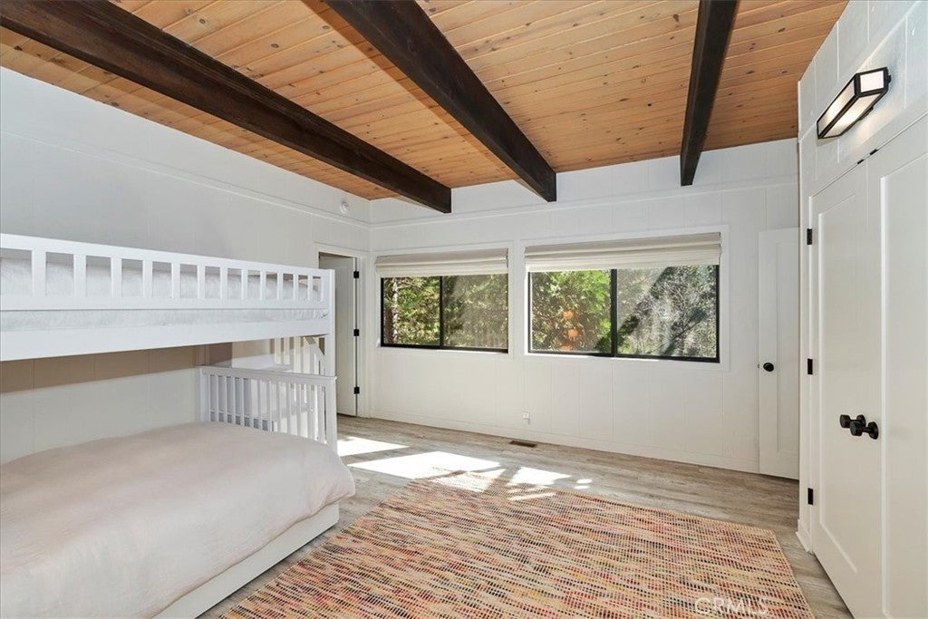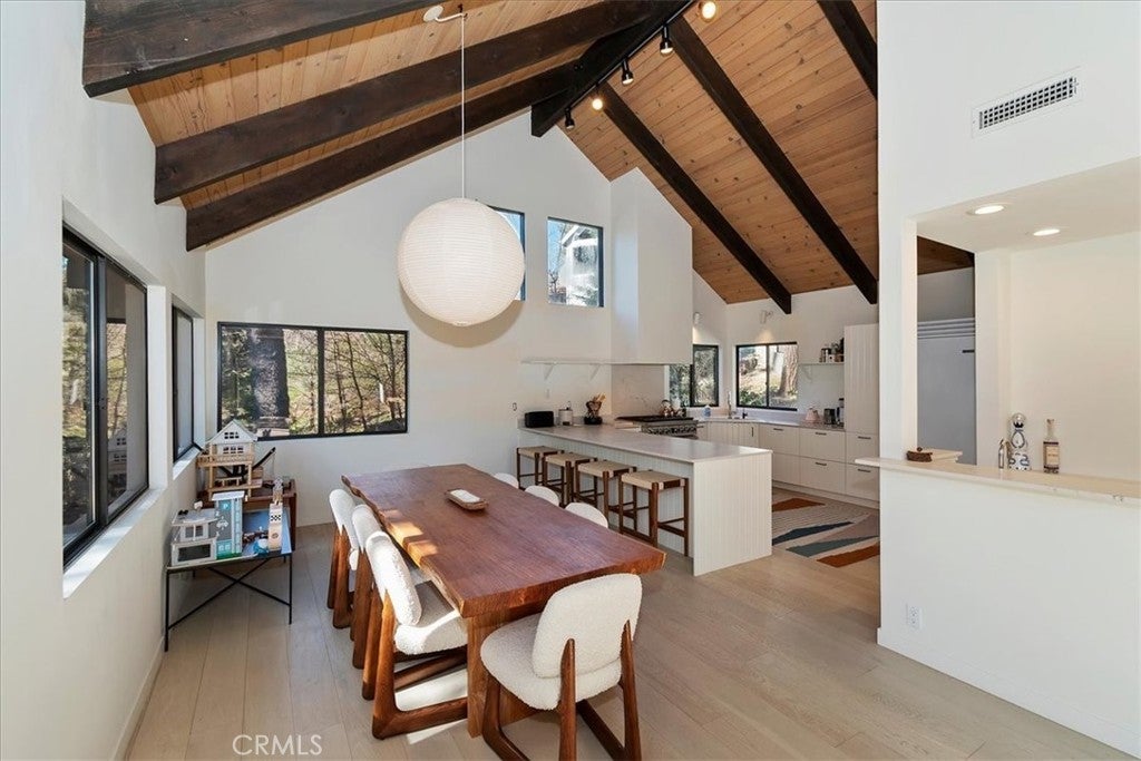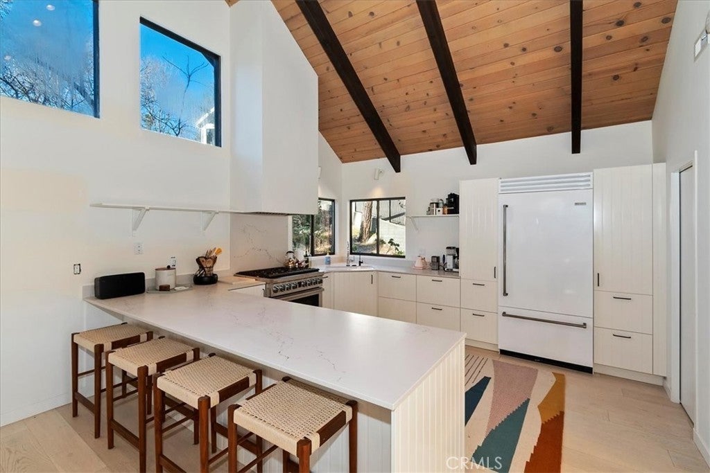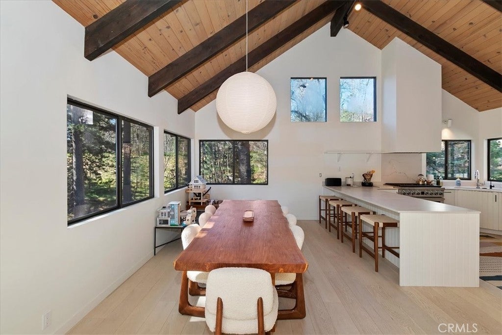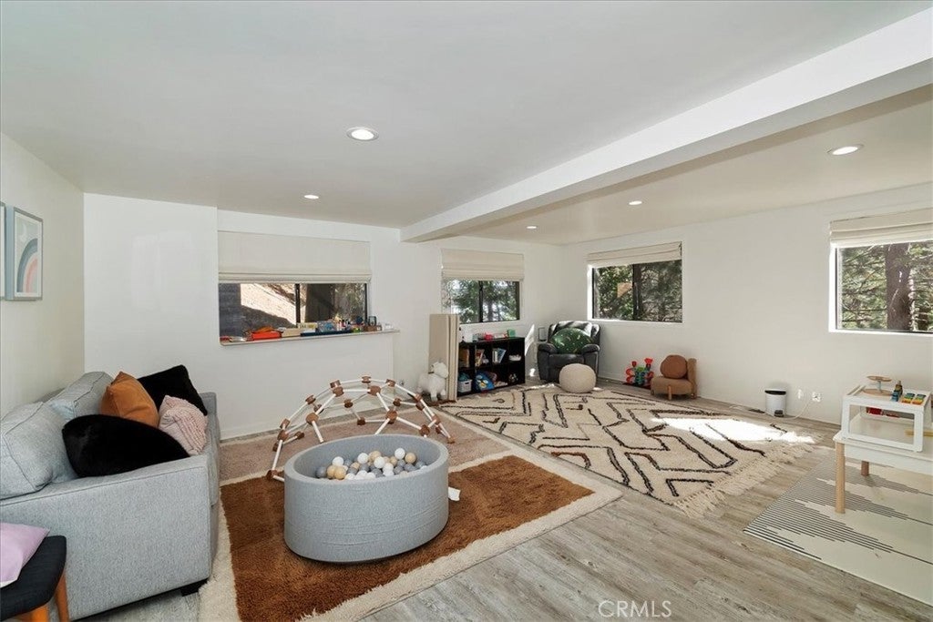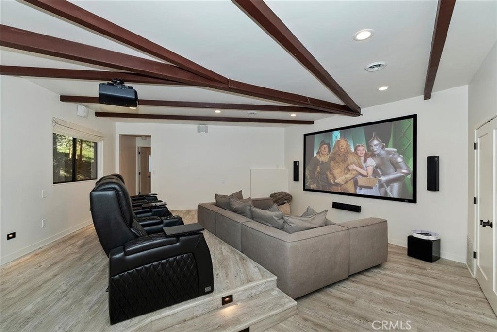 Tucked away at the end of a quiet Riviera cul-de-sac, this resort-style modern cabin offers a rare blend of privacy, luxury, and recreation, complete with lake rights and premier golf course frontage. Privately gated with no HOA, this exceptional property enjoys a serene setting overlooking both the 10th green and 11th tee box near the iconic Arrowhead Monument. Surrounded by towering trees and peaceful streets ideal for leisurely strolls, the location is as desirable as it is tranquil. Thoughtfully remodeled from top to bottom in recent years, the expansive 6+ bedroom home showcases elevated finishes throughout, including updated fixtures, drywall, paint, doors, flooring, kitchen, and bathrooms. A nearly level entry leads into a warm and inviting interior highlighted by soaring beamed ceilings, engineered hardwood floors, and plush wool carpeting. At the heart of the living room, a grand wood-burning fireplace creates a stunning focal point while framing sweeping views of the fairways through dramatic floor-to-ceiling windows that flood the home with natural light.The gourmet kitchen is designed for both everyday living and entertaining, featuring crisp white cabinetry, Caesarstone countertops, premium BlueStar appliances, a walk-in pantry, and a convenient wet bar—all seamlessly open to the main living area. Step outside onto the expansive wraparound deck to take in the picturesque surroundings of lush fairways, mature trees, and rolling hills.The versatile floor plan offers exceptional flexibility, with a main-level bedroom that can serve as a primary suite, complete with ample closet space and a spacious full bath. The lower level is designed for entertainment and relaxation, featuring a large game room with a second wood-burning fireplace, two additional remodeled suites, and a dedicated game room space that could easily convert to another bedroom. An oversized laundry room with a Murphy bed adds even more functionality for hosting guests. Completing the home are two more bedrooms and a newly added theater room, outfitted with luxury recliners and a comfortable sectional for the ultimate movie night experience. With a private golf cart path providing direct access to the course and a portable generator for peace of mind, this one-of-a-kind Lake Arrowhead retreat truly has it all—luxury, comfort, and the perfect setting to gather, entertain, and unwind.