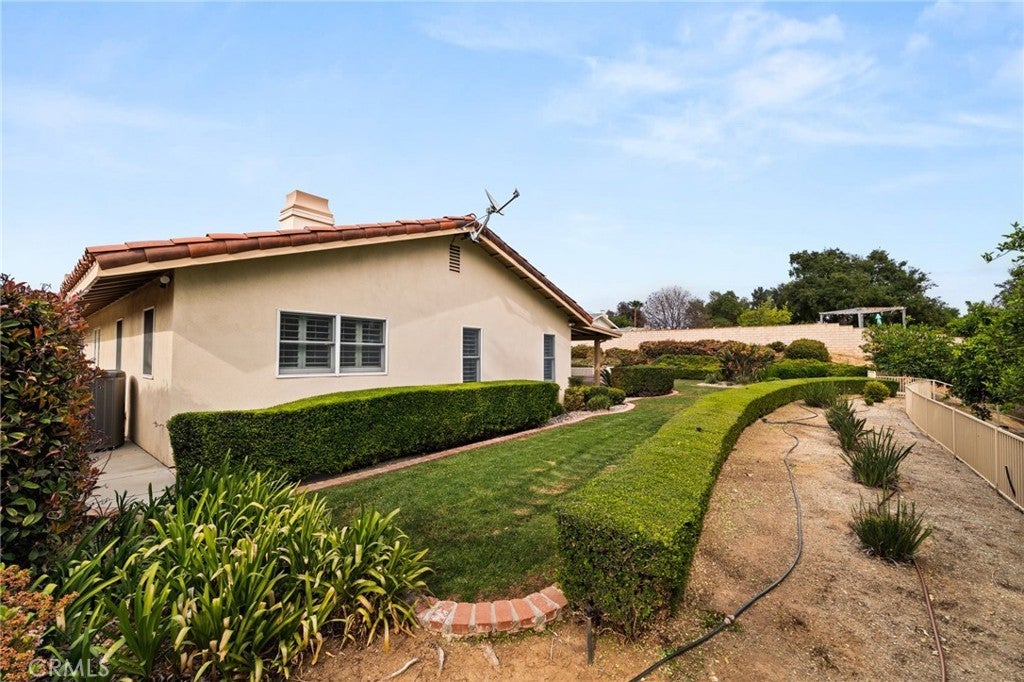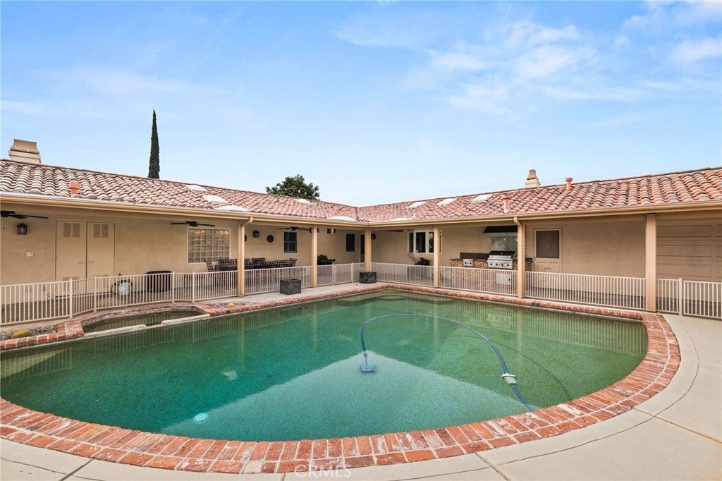 Turnkey 4 bedroom 3 bathroom single story pool home in South Redlands with water shares, minutes from Redlands Country Club. This ranch home has been highly upgraded. You enter either through the front door into the foyer, or via the attached garage directly into the renovated kitchen. There is an oversized island with bar stool seating, stainless appliances, tremendous storage space, and a large pantry. This kitchen opens directly into a comfortable family room. Formal dining is adjacent, and wraps through to the loving room. Both the living and family room have their own fireplaces. The home has wood look tile flooring, complimented by brand new carpets. Heading back towards the bedrooms, there is a 3/4 bath with a walk in shower just off the back door - perfect for rinsing off after a dip in the pool. The three front bedrooms have an additional bathroom with a large walk in shower as well. Heading to the back of the house, you’ll find a sizable primary suite. It features a fireplace, and its own entertainment center with built in surround sound. A walk in closet and oversized bathroom round it out. Head out the sliding glass door to the covered patio adjacent to the pool and spa. This wrap around patio leads you to the outdoor kitchen. There is lawn towards the back of the yard, and number of producing citrus trees. The home also features an upgraded Lennox HVAC system, and double pane windows throughout. The garage has excellent built ins, and features a single garage door on the back that opens to the yard for great accessibility. Excellent Redlands schools.