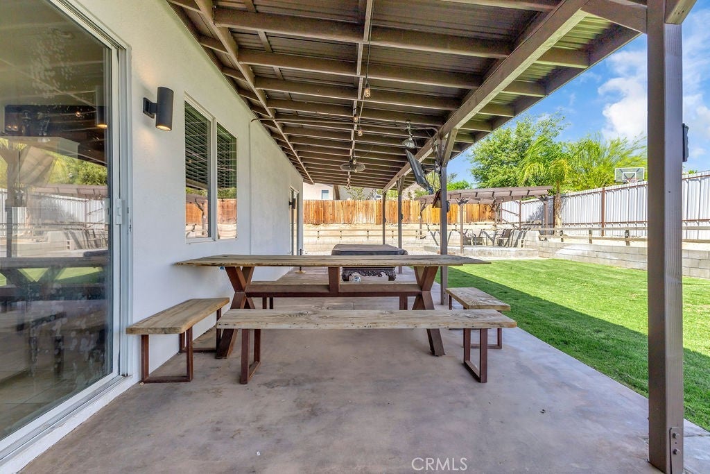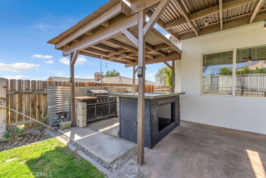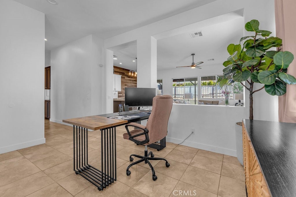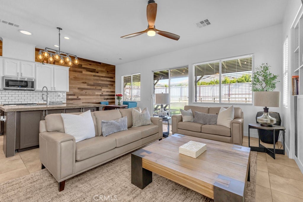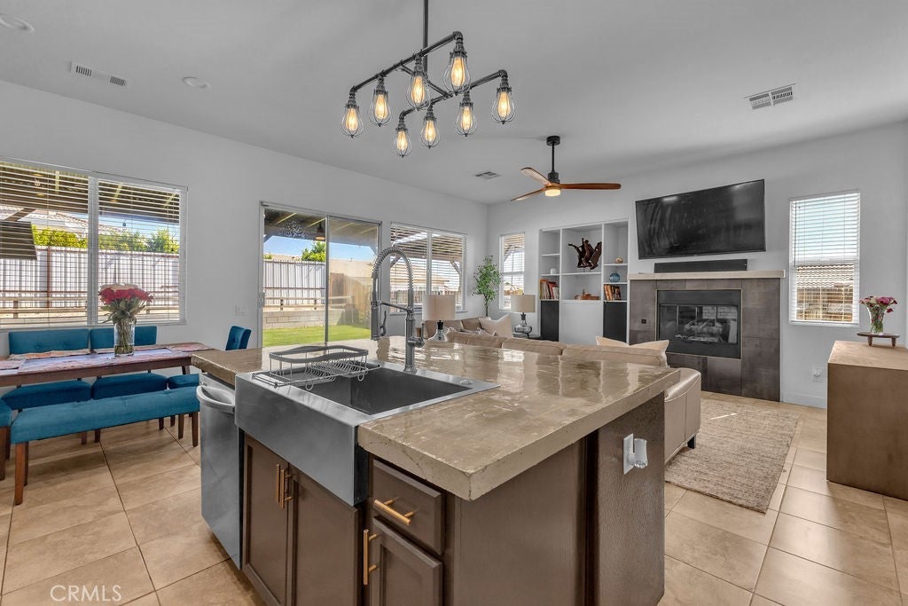 Single-Story 5 bedroom home! This thoughtfully updated home presents a clean, modern interior with a low maintenance desert setting, offering a comfortable balance of style and practicality. The front exterior is defined by a covered entry, and drought conscious landscaping accented with mature palms and flowering plants, creating an inviting first impression with minimal upkeep. Inside, the layout opens into a bright, connected living area where large windows bring in natural light and maintain a visual connection to the backyard. The kitchen serves as a central gathering point with a generous island, farmhouse style sink, updated fixtures, a stylish mix of cabinetry, and all tied together by a stunning wood accent wall, adding warmth and texture. The adjacent dining space flows easily into the living room, where a fireplace and built in shelving create a comfortable focal point without overwhelming the space. A separate office area positioned just off the main living space offers flexibility for remote work, hobbies, or additional lounge use while still feeling integrated with the home’s overall flow. The primary suite continues the updated aesthetic with a remodeled bath featuring a large walk in shower, dual vanities, and refined finishes that feel current without being overstated. Secondary bedrooms are well proportioned with clean lines, neutral tones, and consistent flooring throughout, reinforcing the cohesive interior design. The backyard is designed for function and casual entertaining, highlighted by a large covered patio that extends the living space outdoors, complete with overhead structure, mounted screens, and ample room for seating and recreation. A built in outdoor cooking area and bar setup create a natural gathering point, while the surrounding yard offers an open space suited for everyday use. Overall, the property delivers a move in ready experience with meaningful updates, practical layout choices, and outdoor amenities that support both relaxed living and entertaining.