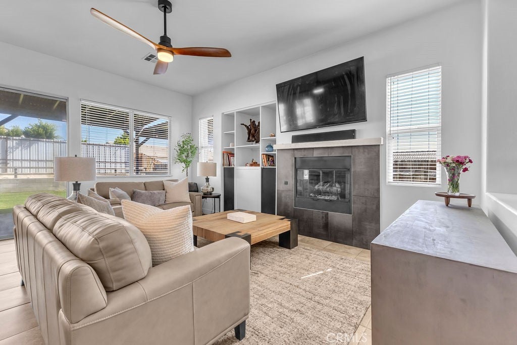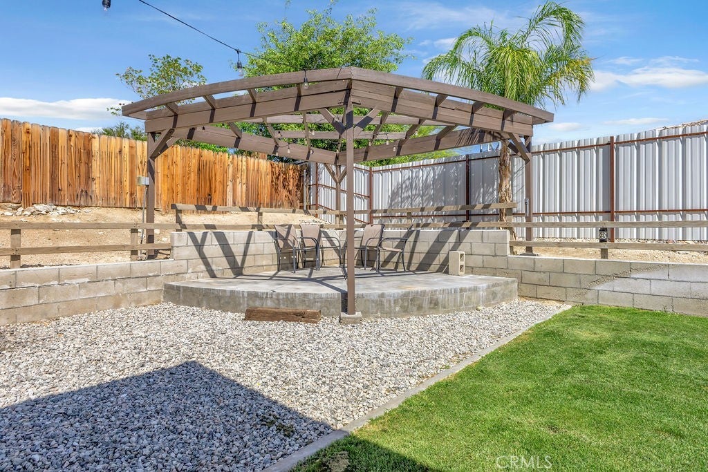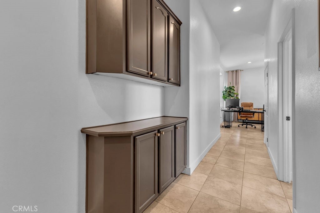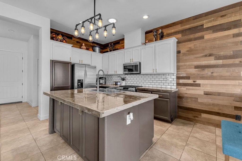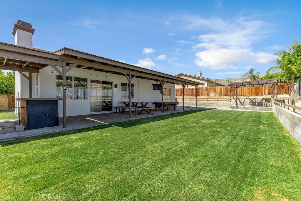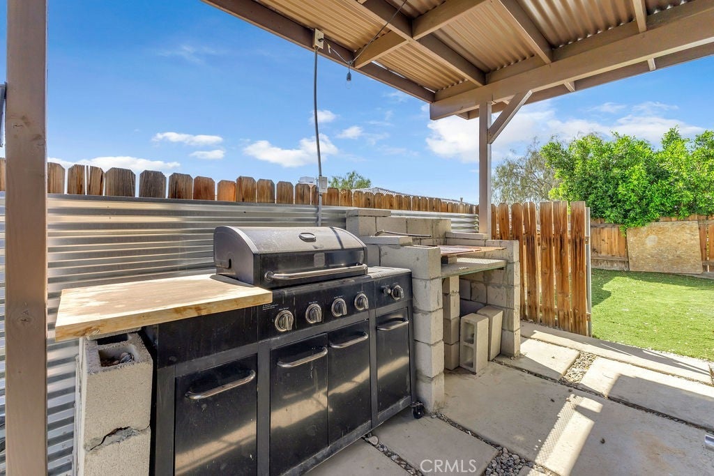 Single-Story 5 bedroom home! This thoughtfully updated home presents a clean, modern interior with a low maintenance desert setting, offering a comfortable balance of style and practicality. The front exterior is defined by a covered entry, and drought conscious landscaping accented with mature palms and flowering plants, creating an inviting first impression with minimal upkeep. Inside, the layout opens into a bright, connected living area where large windows bring in natural light and maintain a visual connection to the backyard. The kitchen serves as a central gathering point with a generous island, farmhouse style sink, updated fixtures, a stylish mix of cabinetry, and all tied together by a stunning wood accent wall, adding warmth and texture. The adjacent dining space flows easily into the living room, where a fireplace and built in shelving create a comfortable focal point without overwhelming the space. A separate office area positioned just off the main living space offers flexibility for remote work, hobbies, or additional lounge use while still feeling integrated with the home’s overall flow. The primary suite continues the updated aesthetic with a remodeled bath featuring a large walk in shower, dual vanities, and refined finishes that feel current without being overstated. Secondary bedrooms are well proportioned with clean lines, neutral tones, and consistent flooring throughout, reinforcing the cohesive interior design. The backyard is designed for function and casual entertaining, highlighted by a large covered patio that extends the living space outdoors, complete with overhead structure, mounted screens, and ample room for seating and recreation. A built in outdoor cooking area and bar setup create a natural gathering point, while the surrounding yard offers an open space suited for everyday use. Overall, the property delivers a move in ready experience with meaningful updates, practical layout choices, and outdoor amenities that support both relaxed living and entertaining.