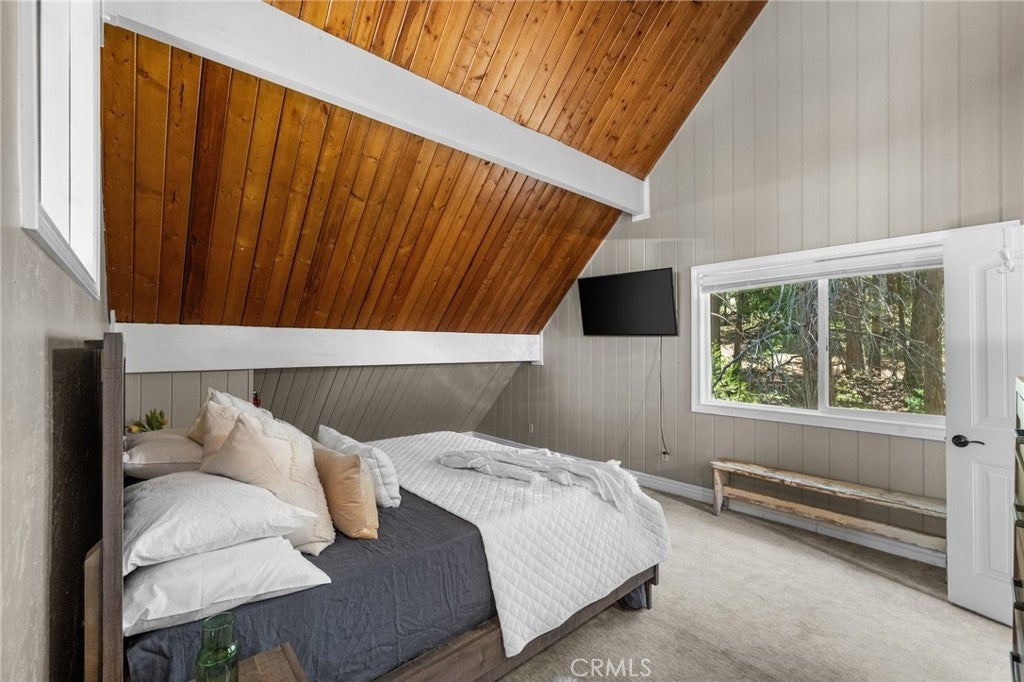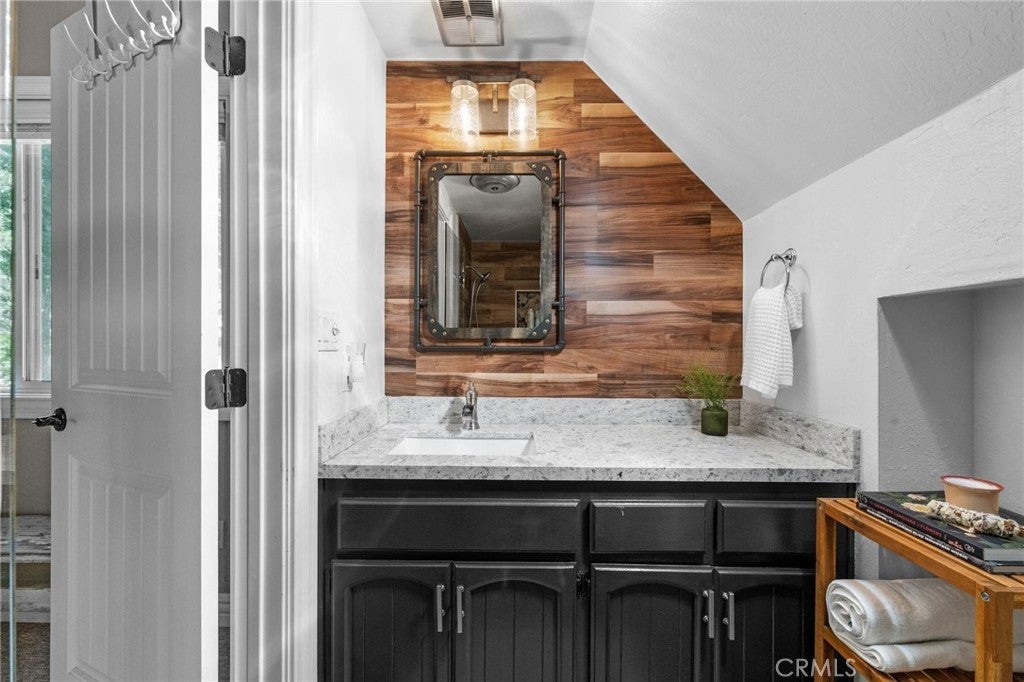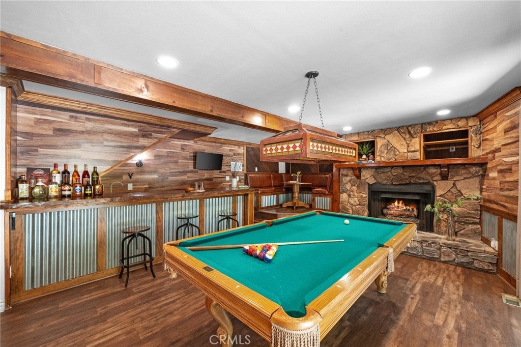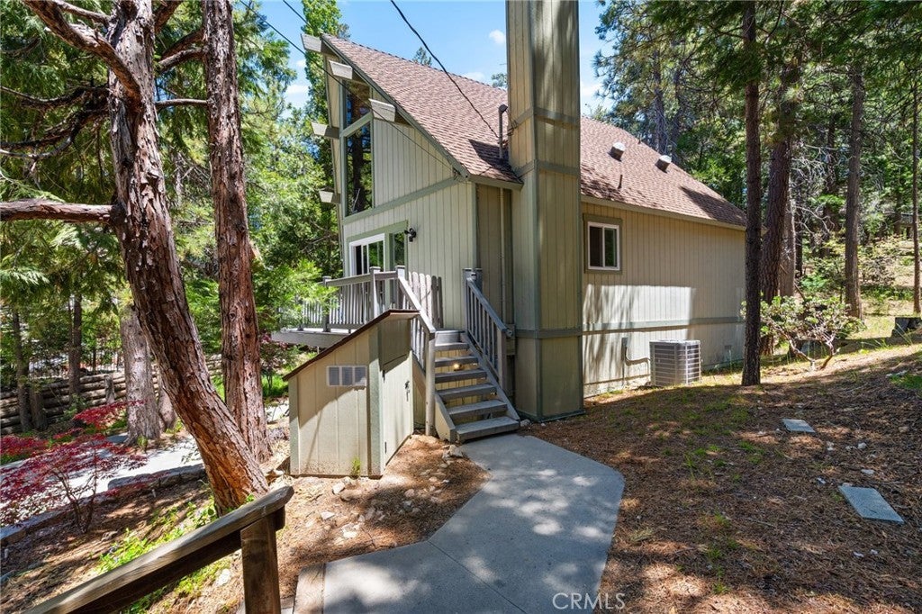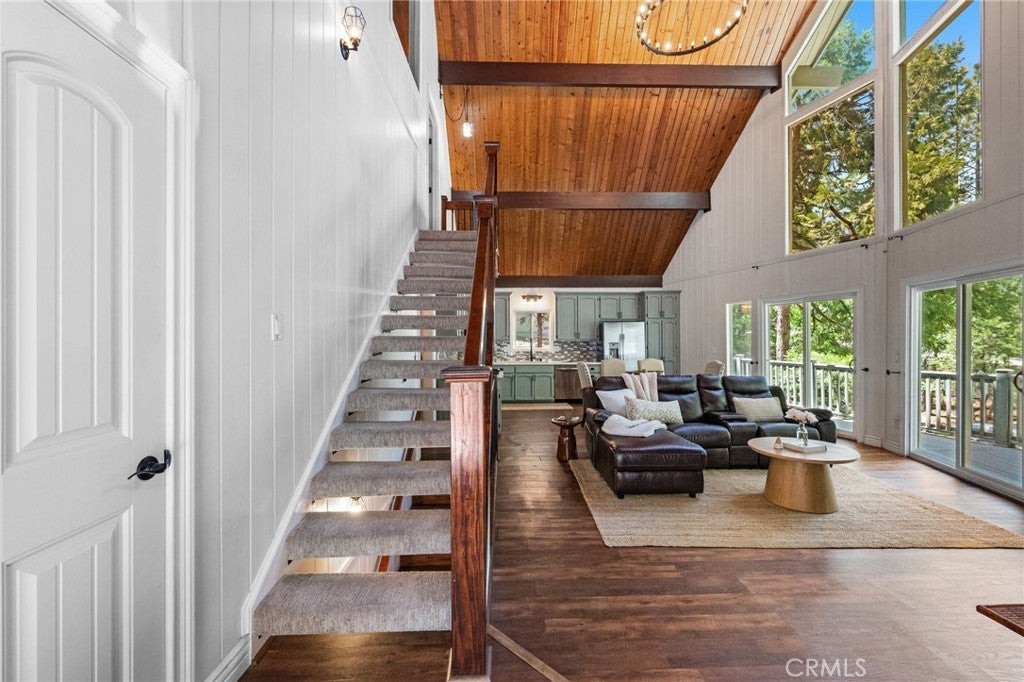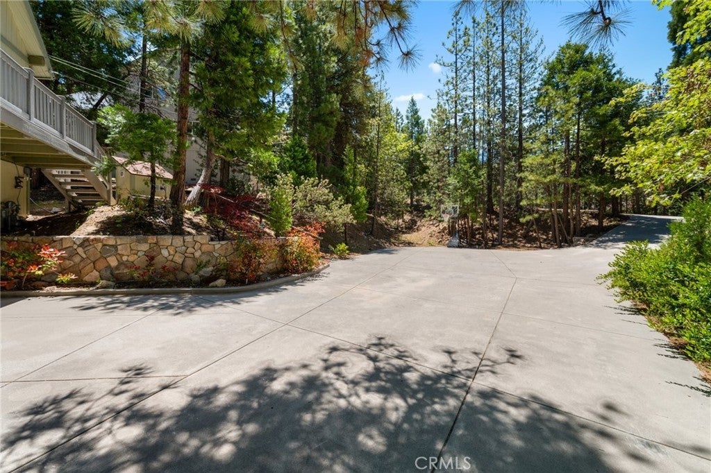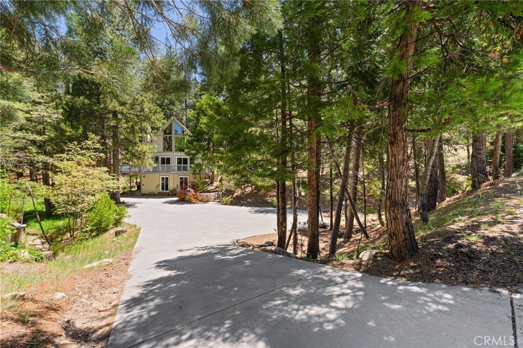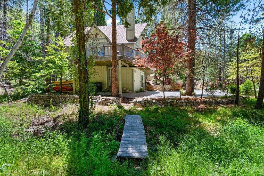 Welcome to your dream getaway in beautiful Lake Arrowhead. Situated on nearly 1/3 acre of lush, private land, this beautifully renovated prow-style home offers the perfect blend of modern comfort and classic mountain character—plus lake rights! Tucked into a serene setting with lush landscaping and a seasonal stream, the home features a spacious wrap-around deck ideal for entertaining or soaking in the peaceful surroundings. Inside, the open-concept living and kitchen area is filled with natural light, highlighted by soaring beam ceilings and a stunning stone fireplace that creates a warm and inviting atmosphere. The expansive primary suite is set on its own private upper level for added comfort. On the lower level, a custom-designed bonus space complete with a built-in wet bar, cozy nook seating, pool table and a second stone fireplace that adds a rustic touch to the entertainment area. A generous laundry room is already plumbed and sized for a potential third bathroom, and there’s abundant storage throughout the home. With a massive concrete driveway offering parking for 6 to 8 vehicles—plenty of room for guests, or even a boat—and easy year-round access to main roads, this home is as practical as it is picturesque. Whether you're looking for a full-time residence, vacation escape, or investment opportunity, this Lake Arrowhead property delivers comfort, charm, and room to relax.