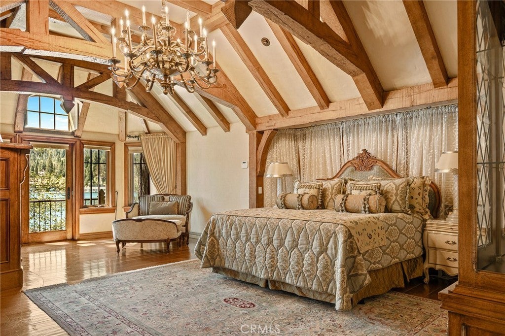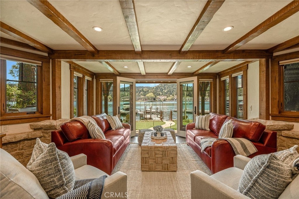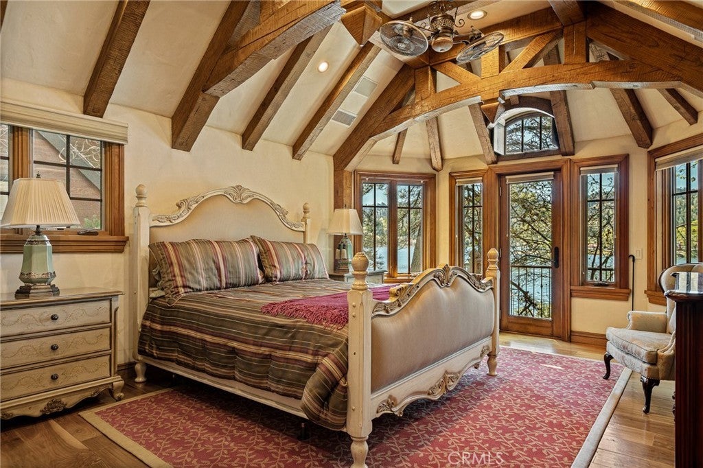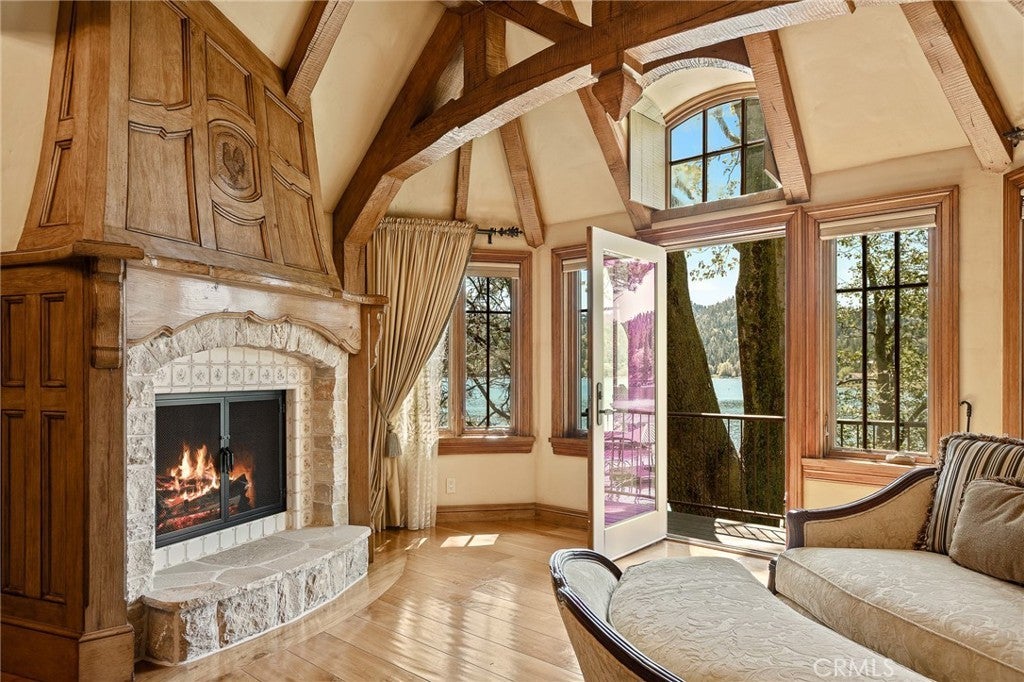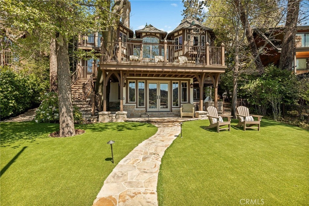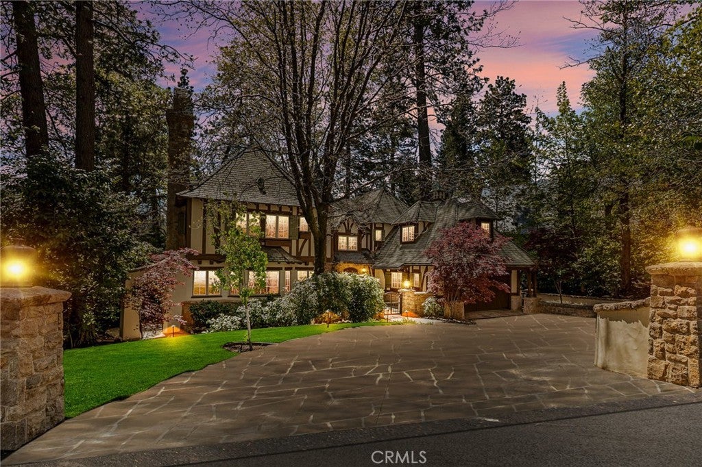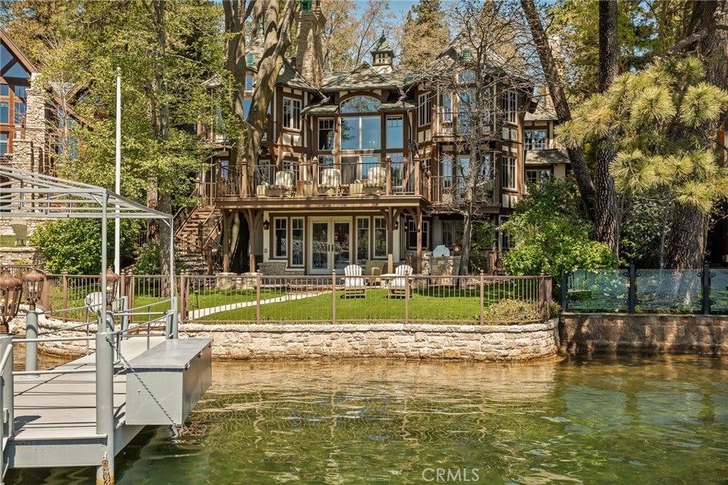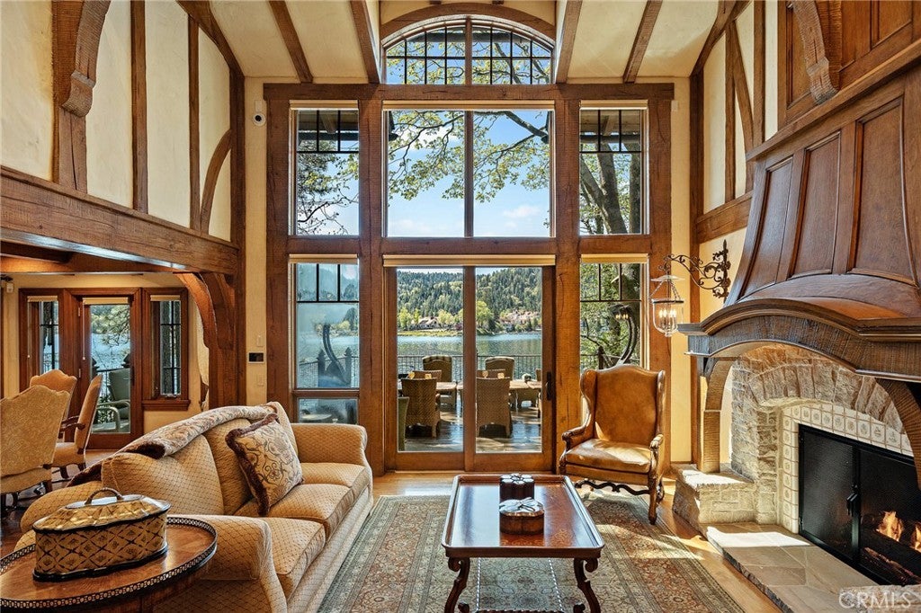Set directly on the lake with two private boat docks, this fully reimagined English Tudor estate is one of the most distinctive and irreplaceable properties in Lake Arrowhead. Extensively redesigned inside and out by noted architect David Abbott, with a full-scale construction remodel completed between 2004–2006, the home is a true expression of old-world European craftsmanship—not a reinterpretation, but a fully realized architectural statement brought to life with enduring quality and intention. Every detail has been thoughtfully executed, blending timeless design with modern comfort. Positioned behind the gated entry of the prestigious Point Hamiltair community, with a dramatic stone approach and directly across from the Lake Arrowhead Village, the home unfolds with a true sense of arrival—reminiscent of a Cotswolds manor. Inside, exposed timber beams, hand-chiseled woodwork, custom wrought iron, and layered artisan finishes create a warm, richly detailed interior. The residence has been extensively renovated and upgraded throughout. Custom cabinetry, handmade doors, and one-of-a-kind custom woodwork crafted on-site reflect a level of care and craftsmanship rarely seen. Fireplaces feature hand-painted tile by Nancy Grace, complemented by hand-carved mantels that anchor each living space. The primary suite is designed as a private retreat, featuring a statement chandelier, hand-painted mosaic tile, steam shower, and spa-quality finishes. Architectural enhancements—including added dormers and custom built-ins—elevate both livability and design. Modern systems are fully integrated, including Control4 smart home automation, a Lutron lighting system, surround sound, a whole-house generator, and a commercial-grade elevator. Major infrastructure improvements such as a synthetic slate roof, comprehensive drainage system, and a recently rebuilt seawall by Kiwi Dock ensure long-term durability and peace of mind. Outdoor living is equally refined, with flagstone hardscape, artificial turf, custom railings, and seamless access to the lake and docks. This is a rare opportunity to own a true legacy estate—where premier lakefront positioning, architectural significance, and uncompromising craftsmanship converge in a way that is nearly impossible to replicate.