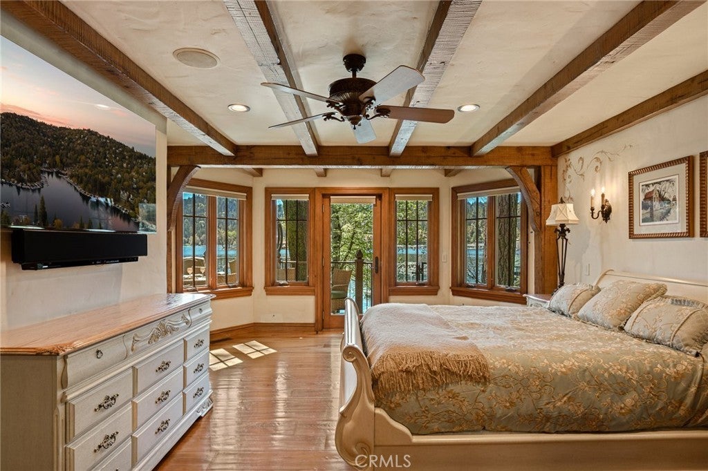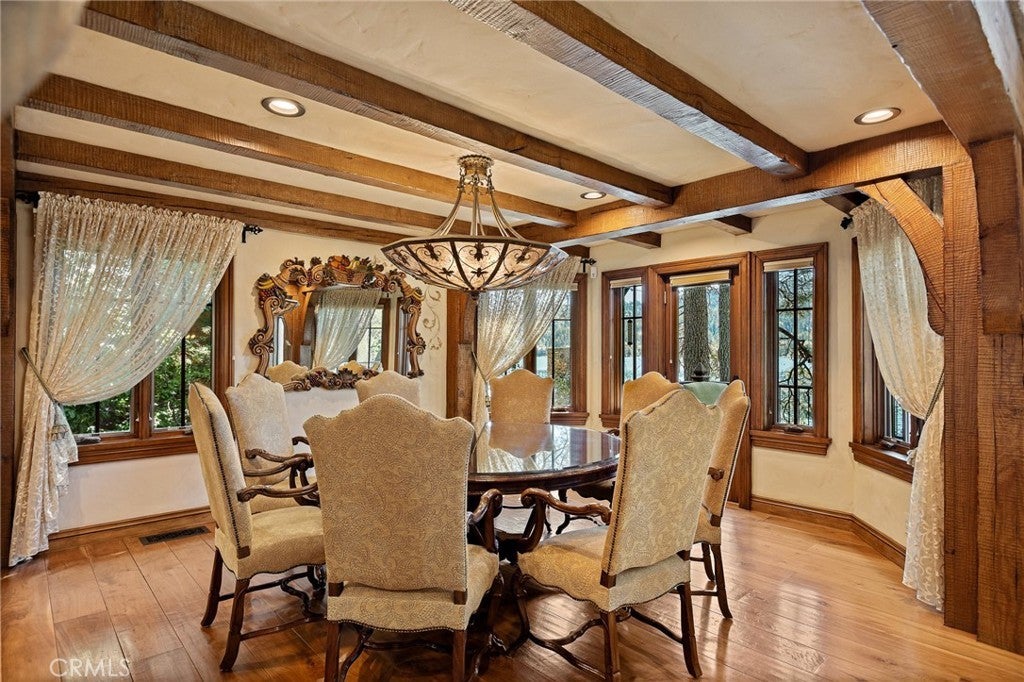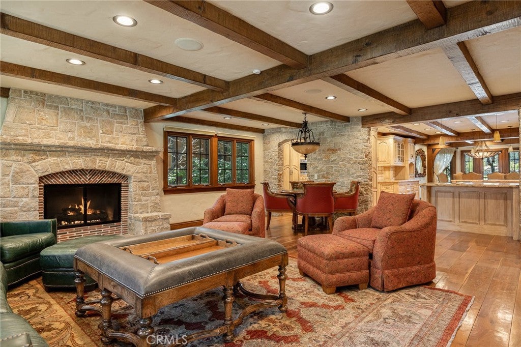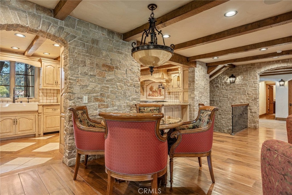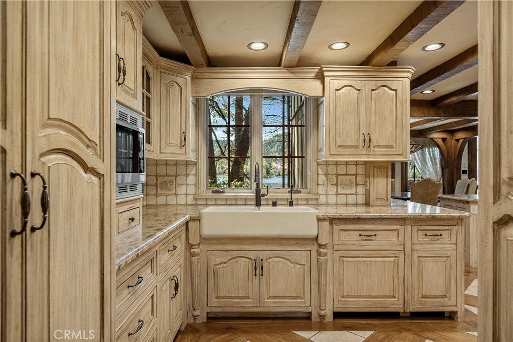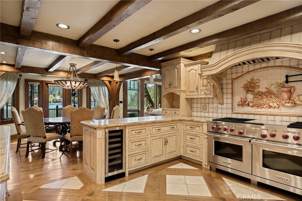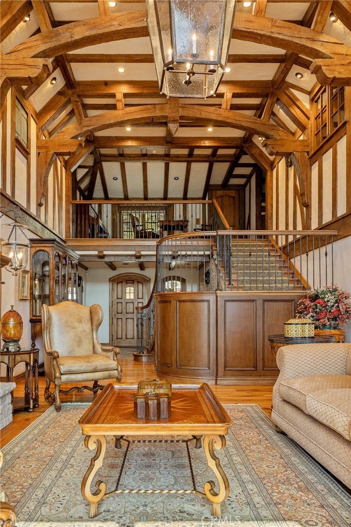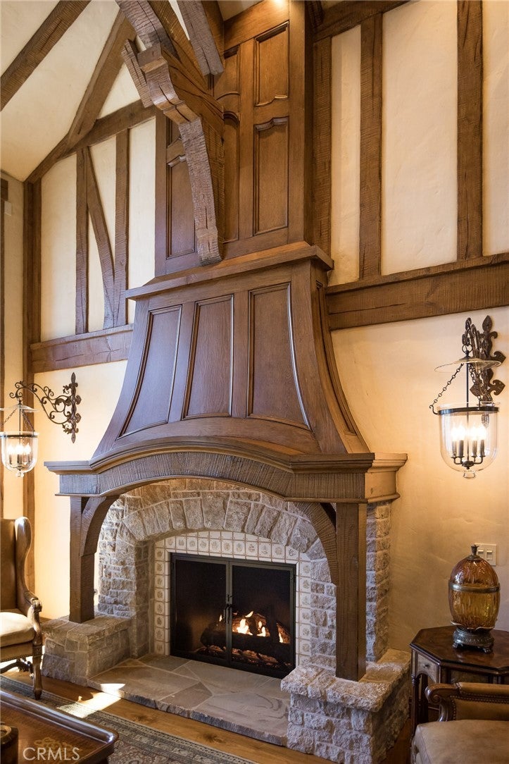 Set directly on the lake with two private boat docks, this fully reimagined English Tudor estate is one of the most distinctive and irreplaceable properties in Lake Arrowhead. Extensively redesigned inside and out by noted architect David Abbott, with a full-scale construction remodel completed between 2004–2006, the home is a true expression of old-world European craftsmanship—not a reinterpretation, but a fully realized architectural statement brought to life with enduring quality and intention. Every detail has been thoughtfully executed, blending timeless design with modern comfort. Positioned behind the gated entry of the prestigious Point Hamiltair community, with a dramatic stone approach and directly across from the Lake Arrowhead Village, the home unfolds with a true sense of arrival—reminiscent of a Cotswolds manor. Inside, exposed timber beams, hand-chiseled woodwork, custom wrought iron, and layered artisan finishes create a warm, richly detailed interior. The residence has been extensively renovated and upgraded throughout. Custom cabinetry, handmade doors, and one-of-a-kind custom woodwork crafted on-site reflect a level of care and craftsmanship rarely seen. Fireplaces feature hand-painted tile by Nancy Grace, complemented by hand-carved mantels that anchor each living space. The primary suite is designed as a private retreat, featuring a statement chandelier, hand-painted mosaic tile, steam shower, and spa-quality finishes. Architectural enhancements—including added dormers and custom built-ins—elevate both livability and design. Modern systems are fully integrated, including Control4 smart home automation, a Lutron lighting system, surround sound, a whole-house generator, and a commercial-grade elevator. Major infrastructure improvements such as a synthetic slate roof, comprehensive drainage system, and a recently rebuilt seawall by Kiwi Dock ensure long-term durability and peace of mind. Outdoor living is equally refined, with flagstone hardscape, artificial turf, custom railings, and seamless access to the lake and docks. This is a rare opportunity to own a true legacy estate—where premier lakefront positioning, architectural significance, and uncompromising craftsmanship converge in a way that is nearly impossible to replicate.