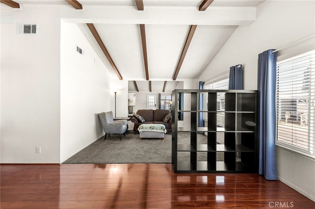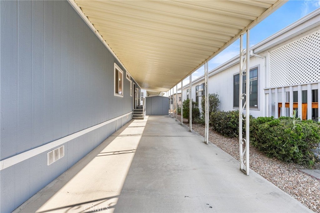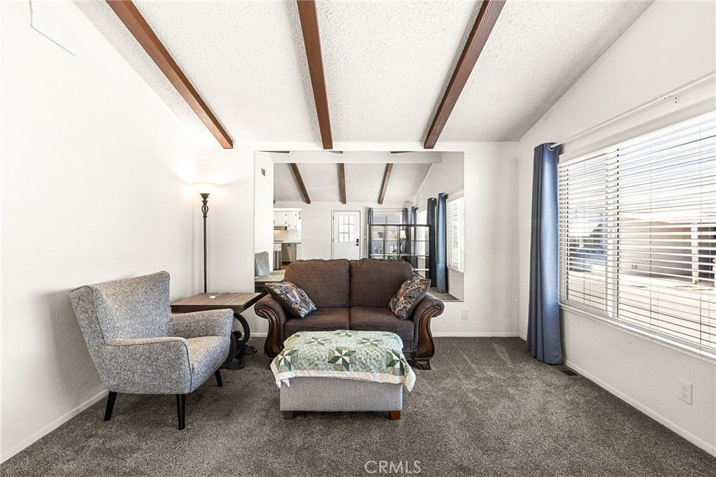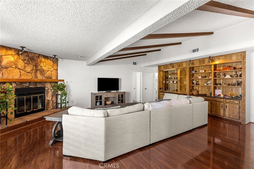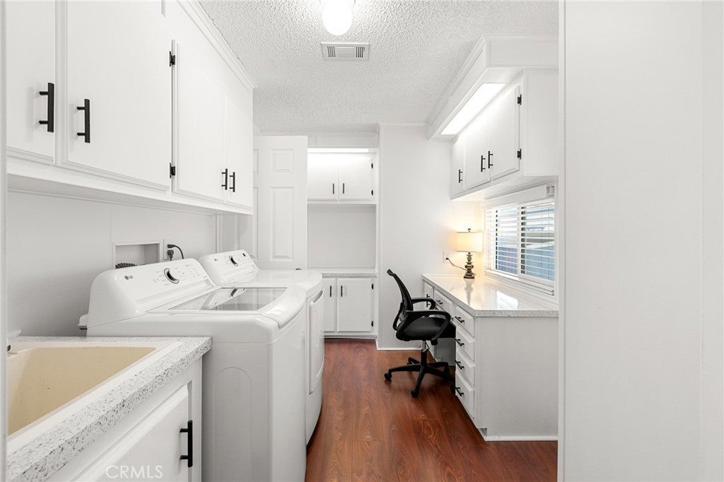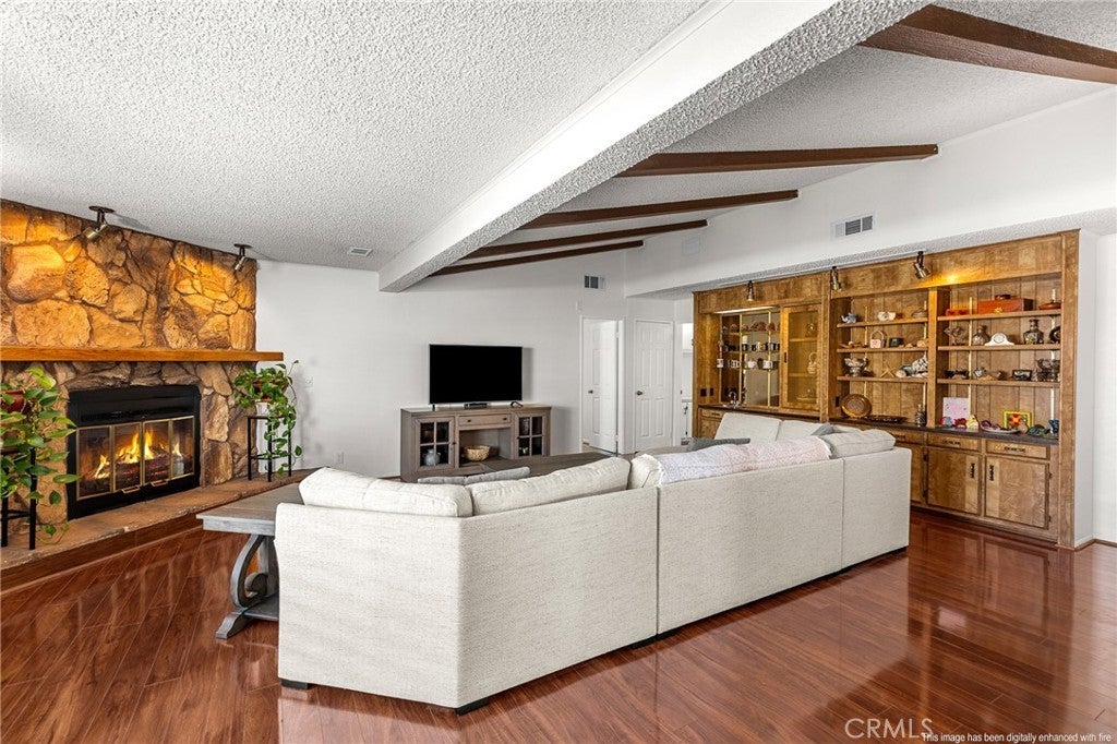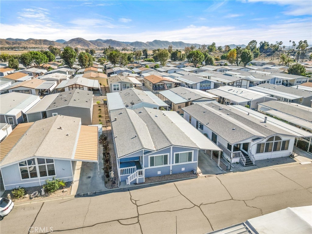 Welcome to The Lakes at Hemet West, an Active 55+ community! This well maintained TRIPLE-WIDE home offers space, character, and thoughtful upgrades throughout. Step inside to cathedral ceilings with exposed wood beams, a tile entry, and rich dark wood laminate flooring. The layout features both a formal living room and a separate family room with a wood-burning fireplace, custom rock surround, raised hearth, and wood mantle, perfect for relaxing or entertaining. The kitchen is filled with natural light and includes laminate countertops, tile backsplash, breakfast nook, pantry, and updated black hardware. A built-in hutch anchors the dining area, while the family room offers a built-in bar with sink, cabinetry, lighting, and outlets. This home offers 2 bedrooms and 2 full baths. The primary suite features a walk-in closet, dual sinks, vanity area, separate tub and shower, and linen storage. Additional highlights include mirrored closet doors, a dedicated office space with built-in desk and cabinetry, and an indoor laundry room with ample storage. Recent upgrades include dual-pane windows, updated electrical breakers, new support bracing, blinds, and newer carpet in the formal living room. All appliances are included, including washer and dryer. Outside, enjoy a covered carport and storage shed. Community amenities include Golf, pool, spa, pickleball, horseshoes, clubhouse, library, and so much more offering an active and welcoming lifestyle. Schedule a tour today!