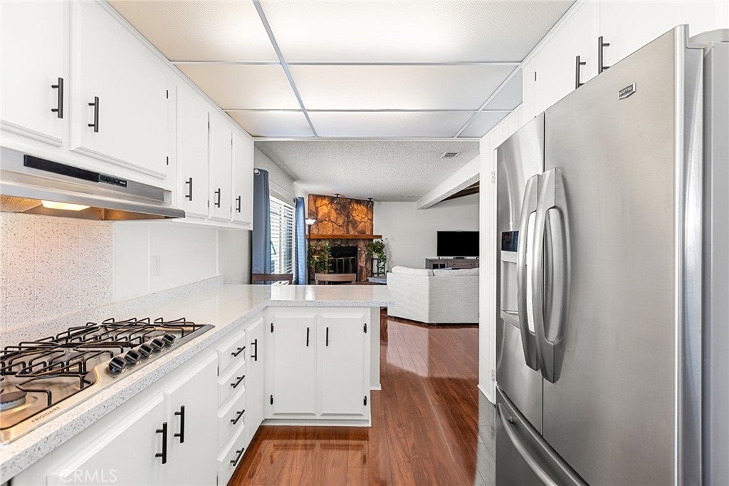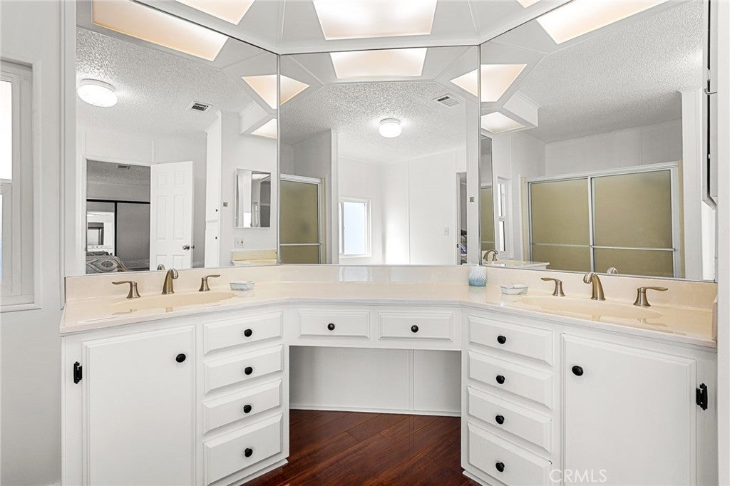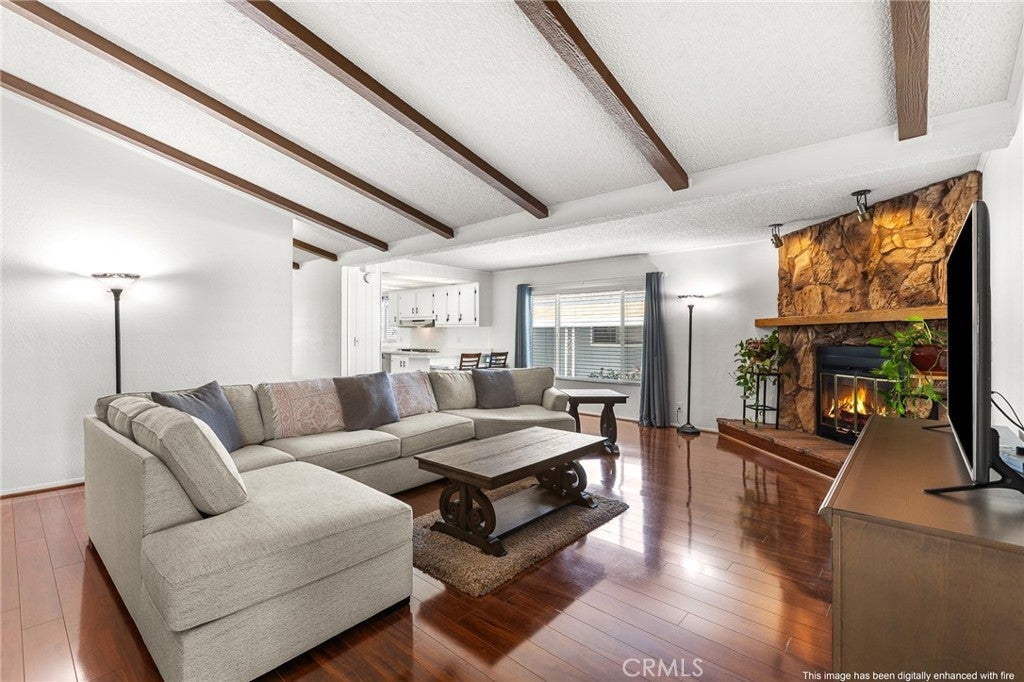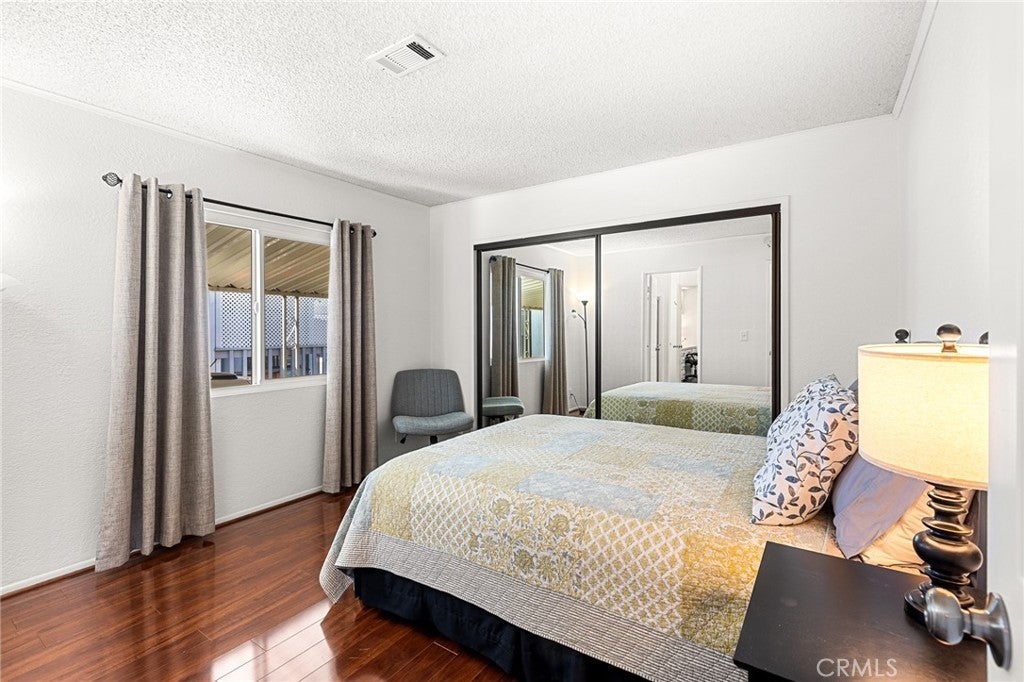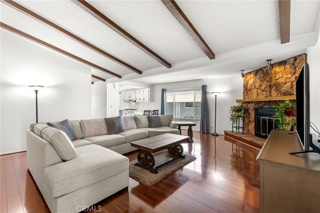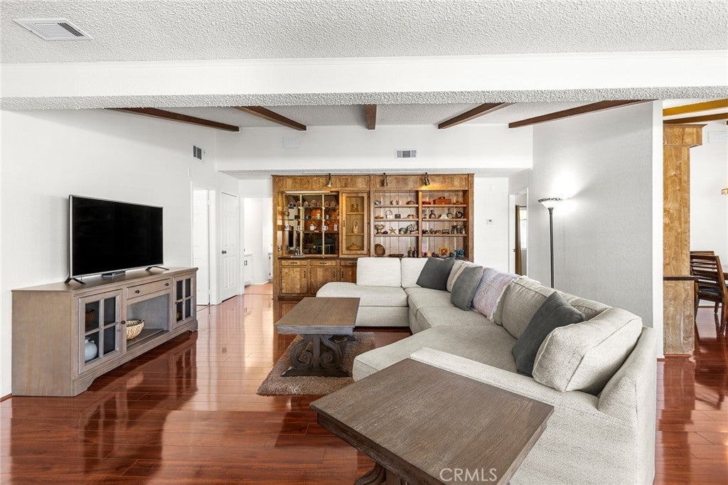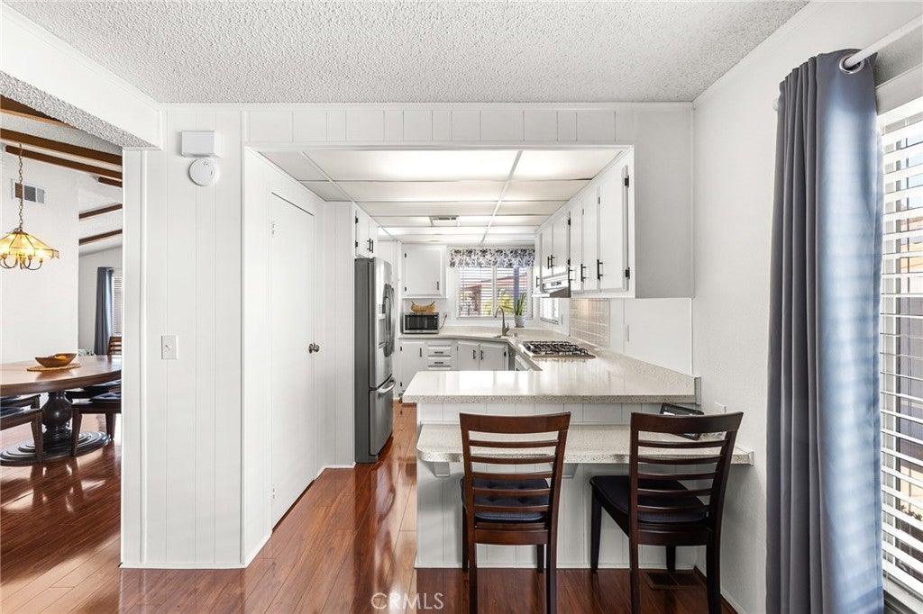 Welcome to The Lakes at Hemet West, an Active 55+ community! This well maintained TRIPLE-WIDE home offers space, character, and thoughtful upgrades throughout. Step inside to cathedral ceilings with exposed wood beams, a tile entry, and rich dark wood laminate flooring. The layout features both a formal living room and a separate family room with a wood-burning fireplace, custom rock surround, raised hearth, and wood mantle, perfect for relaxing or entertaining. The kitchen is filled with natural light and includes laminate countertops, tile backsplash, breakfast nook, pantry, and updated black hardware. A built-in hutch anchors the dining area, while the family room offers a built-in bar with sink, cabinetry, lighting, and outlets. This home offers 2 bedrooms and 2 full baths. The primary suite features a walk-in closet, dual sinks, vanity area, separate tub and shower, and linen storage. Additional highlights include mirrored closet doors, a dedicated office space with built-in desk and cabinetry, and an indoor laundry room with ample storage. Recent upgrades include dual-pane windows, updated electrical breakers, new support bracing, blinds, and newer carpet in the formal living room. All appliances are included, including washer and dryer. Outside, enjoy a covered carport and storage shed. Community amenities include Golf, pool, spa, pickleball, horseshoes, clubhouse, library, and so much more offering an active and welcoming lifestyle. Schedule a tour today!