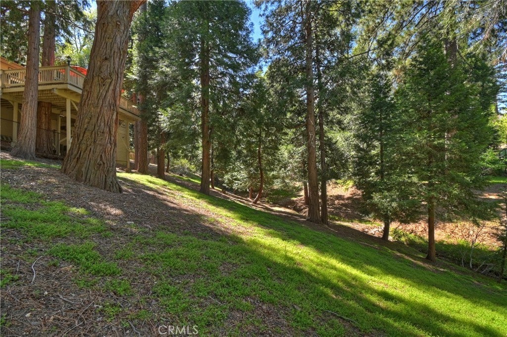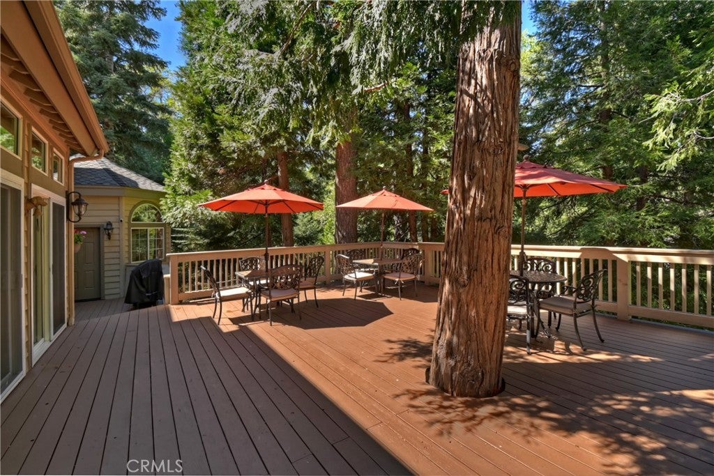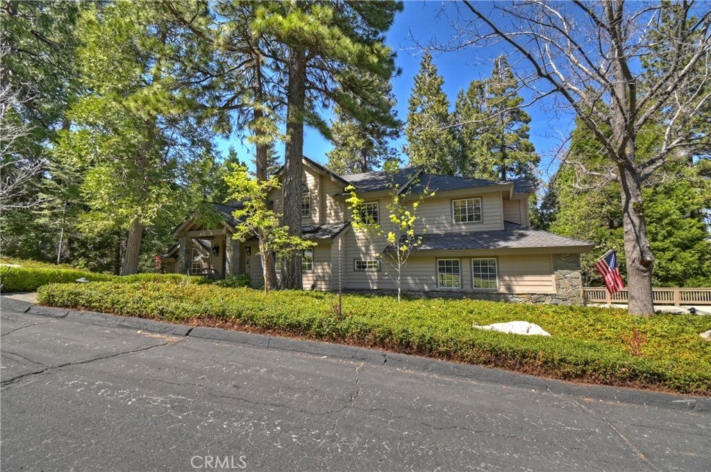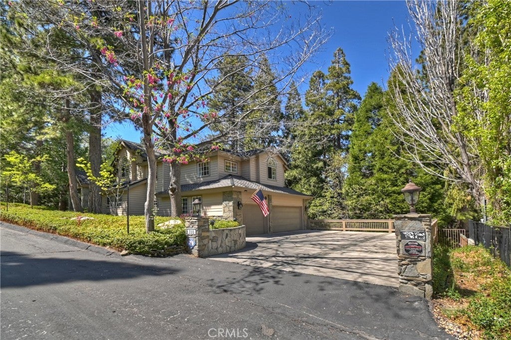 Lovely home in the gated community of Cedar Ridge Estates on nearly an acre of land!!! Spacious home with 3699 sq. ft. featuring 4 bedrooms and 3 baths with a flexible layout. The property is nicely landscaped and fully fenced, with a level driveway providing easy access from the street to the 3-car garage. Did we mention the ample off-street parking! Stone accents showcase the pillars and walkways taking you to the covered front porch. Big and open from the moment you step inside. The main level includes a formal living room with gas fireplace along with a bedroom that works well as a guest room or private office. The upgraded kitchen is designed for both everyday use and entertaining. Features include quartz countertops, a large island with secondary sink, walk-in pantry, custom soft-close cabinetry, two ovens and a 5-burner gas range. Large, sunny window over the sink. A long breakfast bar connects the kitchen and family room featuring a wood-burning fireplace with direct access to rear deck. A formal dining room sits just off the kitchen and also opens to the deck. An open, light-filled staircase leads to the upper level with two guest bedrooms, a full bath, and the spacious primary suite. The large guest room has a built-in desk w/bookcases; the closet is currently set up as an art studio, offering great light and shelving to conveniently store your supplies. The primary bedroom includes a large walk-in closet and the dual-sided gas fireplace is shared with the bathroom. Luxury bath features a jetted soaking tub, walk-in shower, double sinks and lighted vanity mirrors!! It’s a place of comfort for sure. Outdoor spaces are a highlight with the large deck overlooking a natural forest and seasonal stream…… complete with accent lighting for evening use. Easy to gather without feeling crowded. If natural light is important, this home has multiple skylights. Additional enhancements include 2 A/C’s, 2 FAU’s, whole house self-activated gas generator, central vacuum system… yes it works….. small fenced dog run. Built-ins and cabinets in garage. Well maintained showing pride of ownership. This area is truly a step outside the norm. A gated community with large stately homes on private lots with lush green landscaping along with a mature mountain forest ~ close to the lake and minutes to historic Lake Arrowhead Village, yet a sense of privacy and serenity exists here. Boat slip in MBM #4 Slip 7 and boat available for additional costs.
