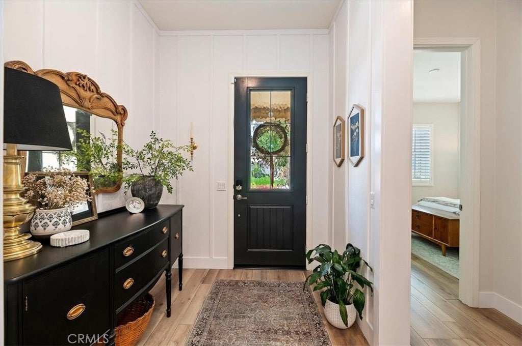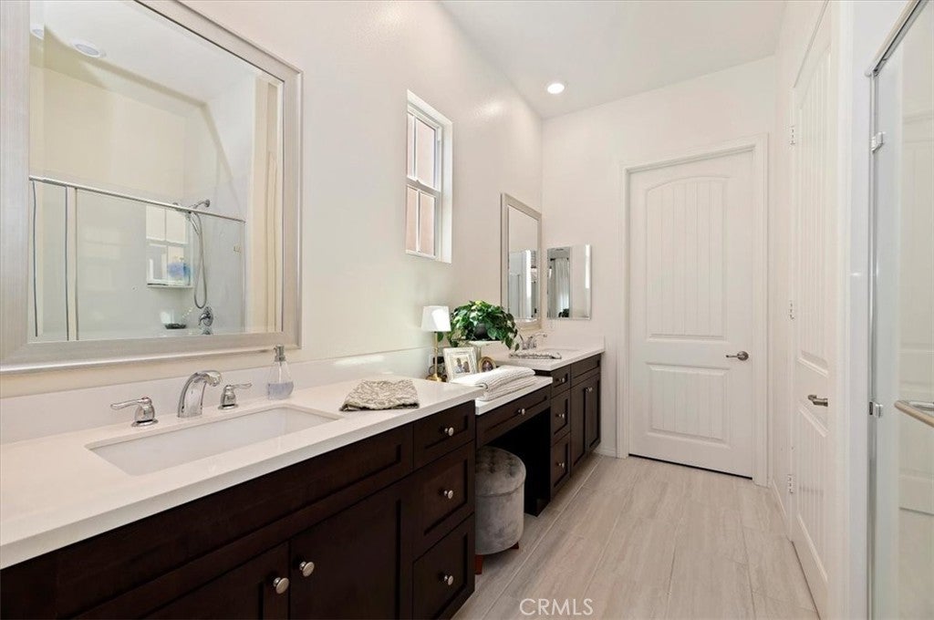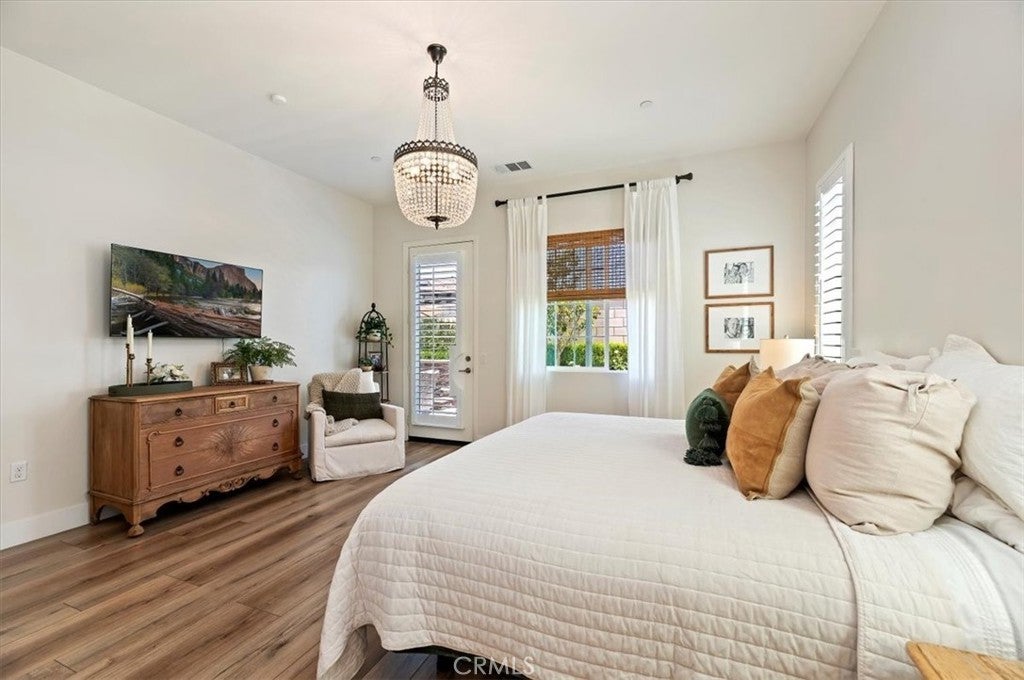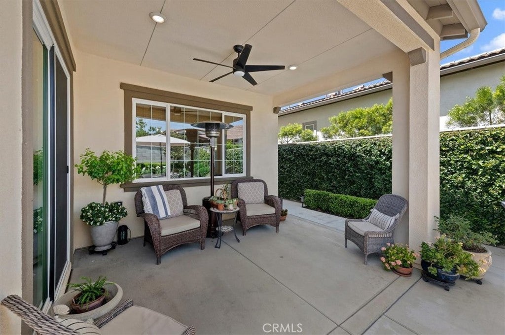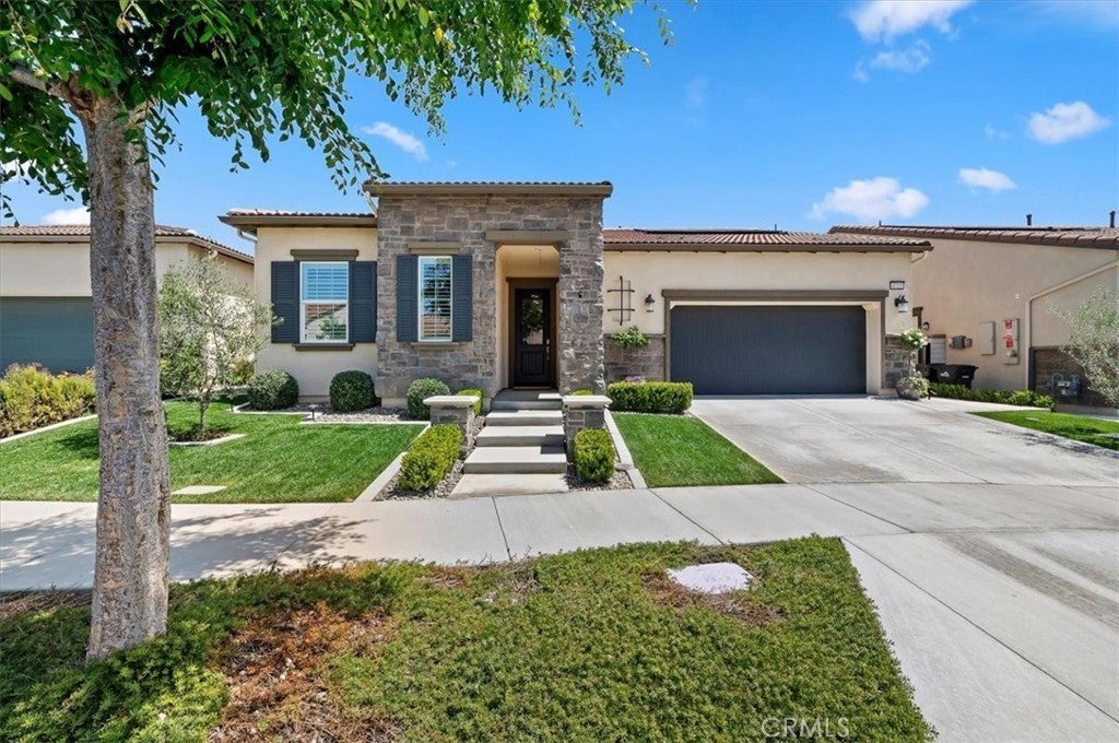 Welcome to the gated Esperanza 55+ Active Adult Community—one of the most desirable communities in Ontario Ranch. This exceptional single-story residence, the highly sought-after Modena model, is a true gem that presents beautifully and offers a seamless blend of style, comfort, and thoughtful design. Offering 2 bedrooms, 2 bathrooms, and a versatile flex room with the potential to serve as a third bedroom, home office, or den, this home provides both functionality and flexibility to fit your lifestyle. From the moment you step inside, the attention to detail is unmistakable. Elegant laminate flooring, upgraded baseboards and casing, plantation shutters, and refined designer finishes create a bright, modern aesthetic throughout. The kitchen is tastefully appointed with quartz countertops and a full marble backsplash, while decorative wall molding in the entryway and bath adds a distinctive custom touch. Every inch of this home has been carefully curated and impeccably maintained, creating a space that feels polished and complete. Step outside to a professionally landscaped front and backyard designed for both relaxation and enjoyment. A tranquil fountain enhances the setting, offering a peaceful backdrop for morning coffee or quiet evenings at home. The garage continues the home’s elevated feel, featuring epoxy flooring and suspended storage racks for a clean, organized environment. Residents enjoy exclusive access to the La Jolla Club, where resort-style amenities include a pool, bar area, outdoor kitchen, fire pits, fitness center, pickleball courts, and a dog park—perfect for an active and social lifestyle. Ideally located within walking distance to The Station at Eastvale and the Goodman Center, with convenient access to 99 Ranch Market, the 60 and 15 freeways, and just a short drive to Ontario Mills for shopping, dining, and entertainment. This is a rare opportunity to own a pristine, turn-key home in a premier 55+ community.