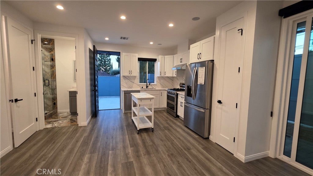 New 2025 Luxury 3BD/3BA Detached Home | Solar | EV | Walk to Granada Hills Charter Be the first to live in this newly completed 2025 detached residence offering privacy, efficiency, and elevated design in one of Porter Ranch’s most desirable residential pockets. Built to the maximum 1,200 sq ft allowable size, this two-story 3 bdr, 3 ba home was constructed with the intention of long-term comfort, not short-term rental standards. Tucked behind and thoughtfully offset from the primary residence, the home offers meaningful separation while maintaining the security of an established neighborhood. It features its own address and private mailbox, separate gas and electrical meters, and a dedicated solar system tied exclusively to the home for direct energy benefit. A large automatic sliding gate opens to approximately 480 sq ft of secured hardscape along the side of the property, creating a rare flexible outdoor environment. The space accommodates two side-by-side private parking spots with a Level 2 EV charger, yet can easily function as an extended patio for outdoor dining, play space, or evening relaxation. A separate front patio entry enhances the sense of arrival and privacy. Inside, 9 ft ceilings and an open-concept layout create an airy feel. The kitchen blends clean design with everyday function, featuring a gas range, refrigerator with water connection, dishwasher, custom soft-close cabinetry, Corian countertops with seamless matching backsplash, built-in pantry shelving, under-stair storage, and a custom rolling prep island. All three bathrooms are finished with floor-to-ceiling large format tile, Corian vanities, fog-resistant mirrors with adjustable lighting, and rain plus handheld shower systems, creating a refined, spa-inspired atmosphere. Upstairs, the primary suite includes a walk-in closet and dual-sink vanity, while two additional bedrooms provide flexible space for children, guests, or a home office. In-unit laundry is conveniently located just outside the bedrooms. Technology is fully integrated, including a professionally installed 7.1 Definitive Technology surround sound system with Dolby Atmos infrastructure and expansion capability, whole-home audio, multiple Cat6 ethernet ports, and Wi-Fi 6 access points for seamless connectivity. Located approximately five minutes on foot from Granada Hills Charter and just minutes from the 118 fwy, The Vineyards at Porter Ranch, Costco, and Northridge Mall