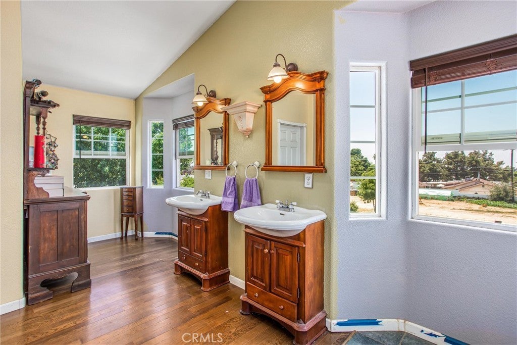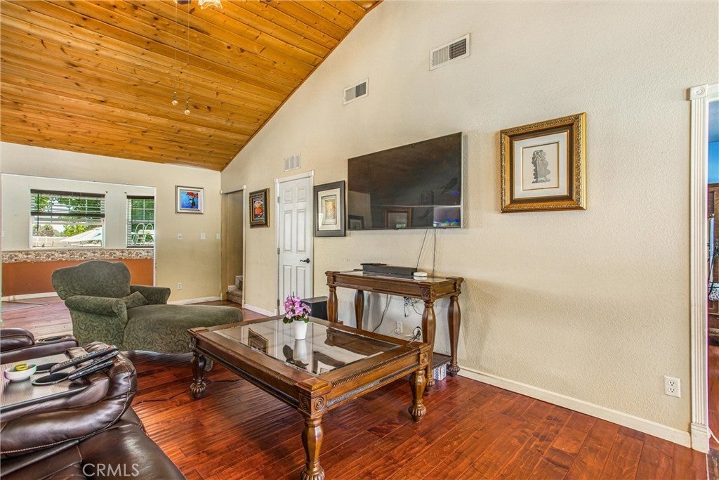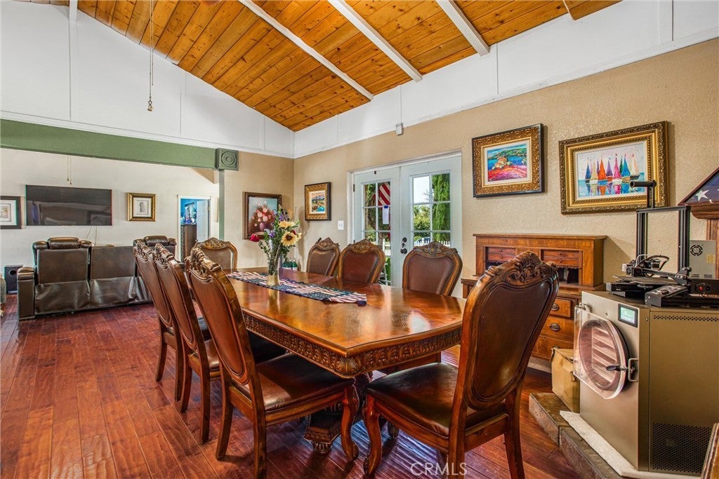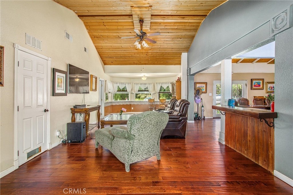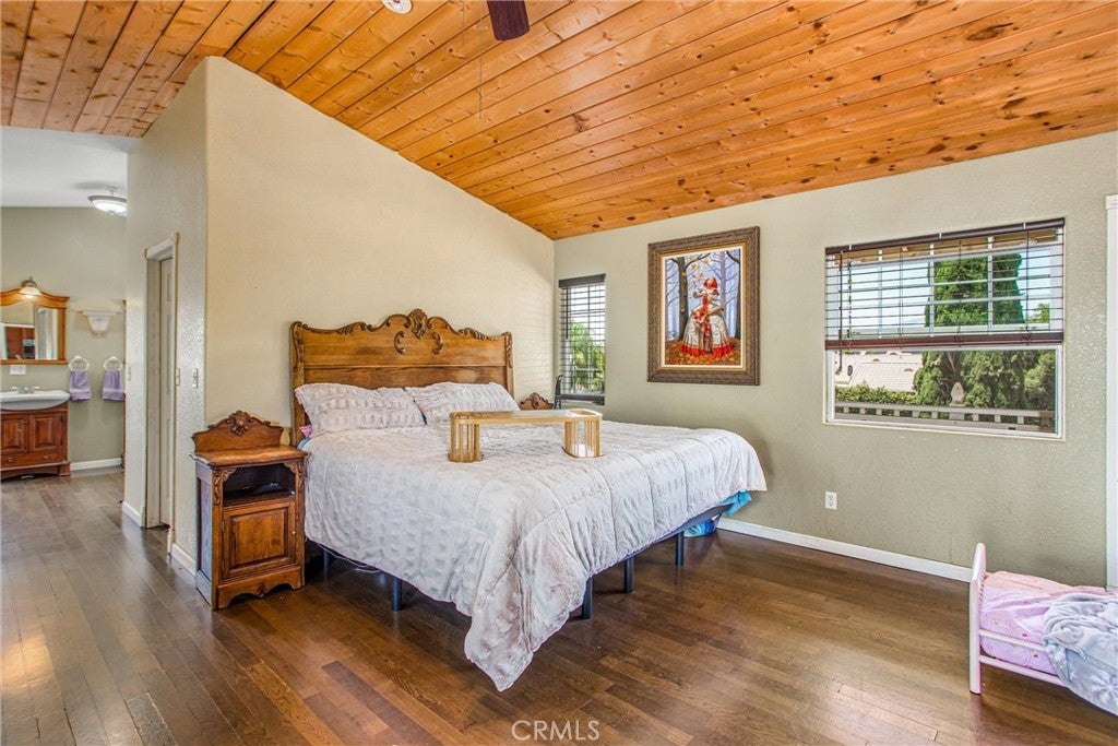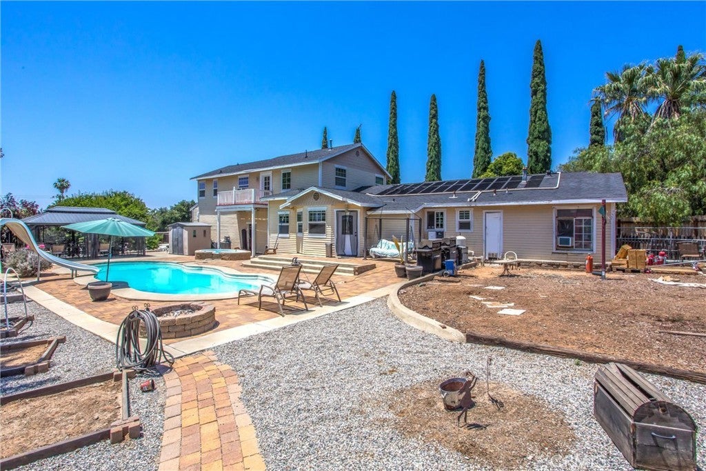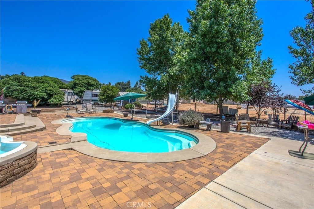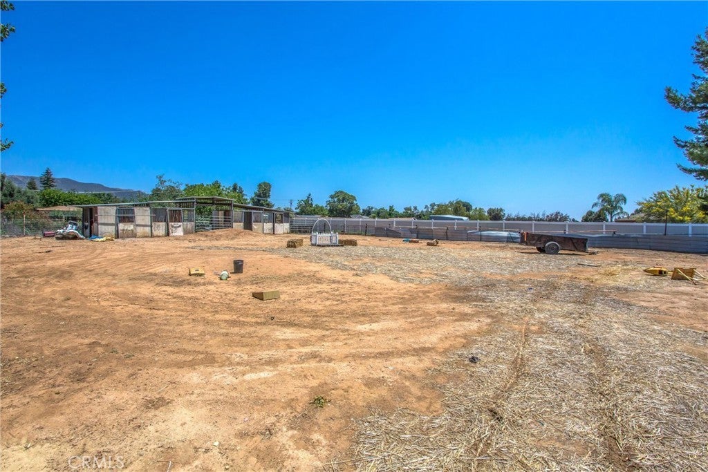 Great Opportunity to own nearly one acre of flat land, horse property with a 4-stall barn, includes open pen. With great street appeal, this home is Close to shopping, schools, open walking and horse trails. Circular driveway. Open floor plan with vaulted ceilings. Kitchen includes Viking Stove and Double ovens, also a new Rain reverse osmosis water filtration system for the kitchen only. Private Master suite upstairs with a sitting room, master bath with slate floors, water on demand hot water system and two separate walk-in closets. Enjoy sunrise and sunsets from the two balconies. Private en-suite with tub and shower bedroom downstairs, great for parent. Two additional private bedrooms that have a remodeled bathroom, shower only. Indoor laundry, that leads to the three-car garage. Please check with the City of Calimesa for a possible ADU on property. Sun Porch or Office area that leads out to the pool with a new freestanding patio/pergola and several fruit trees. Eight raised planters for gardening. Fencing around property. RV Parking with clean out that can hold up to three RVs.