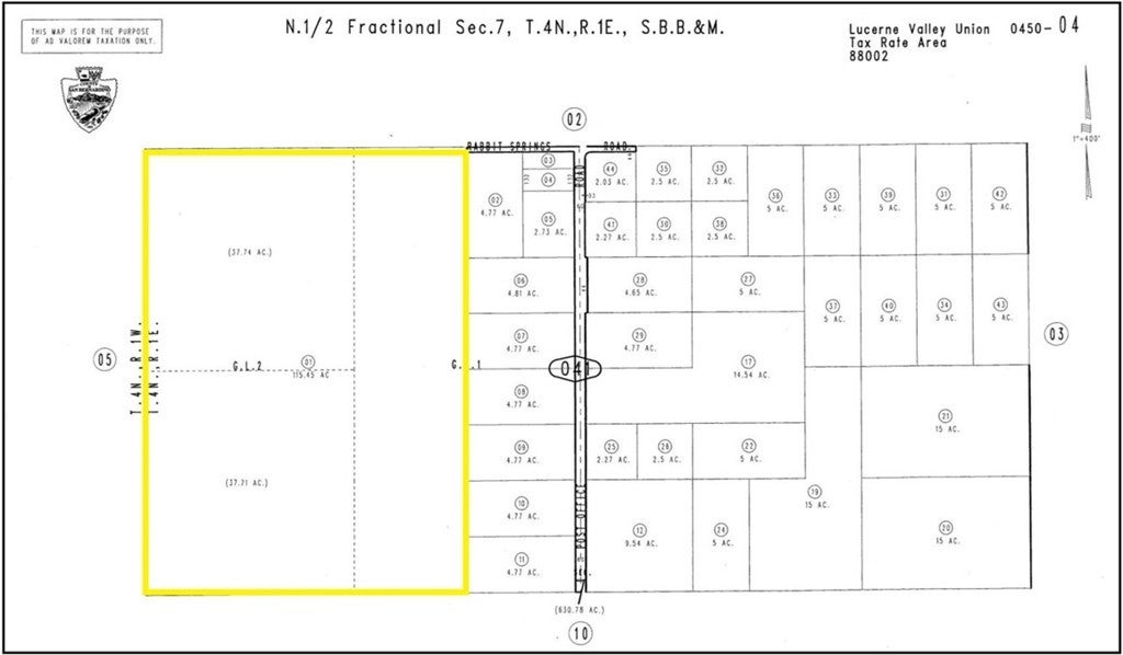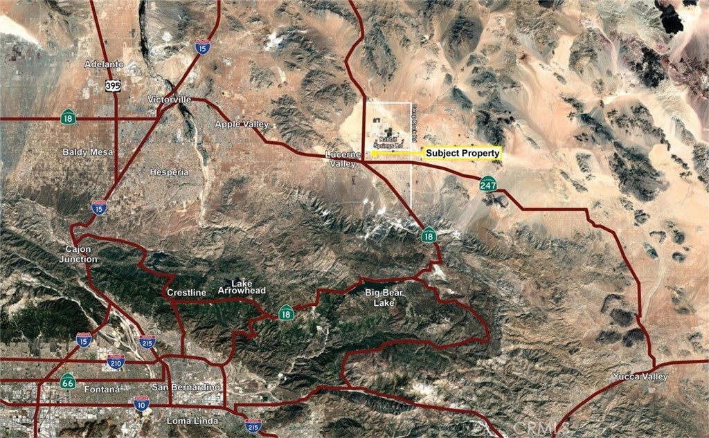 The offering consists of approximately 115.45 acres of land located in Lucerne Valley in San Bernardino County. The property itself is entirely flat with dessert terrain and has roughly 1,900 feet of frontage on Rabbit Springs Road. The site is about a mile from Highway 247 / Barstow Road which leads into Barstow to the north and about 2 miles from Highway 18 which leads into Victorville and Hesperia to the west and Big Bear to the southeast. Additionally, the property is directly nearby Lucerne Valley High School and the Rancho Lucerne Master Plan. Water service in Lucerne Valley is provided by Golden State Water Company and power is provided by Southern California Edison. The property is under the zoning jurisdiction of San Bernardino County and is zoned LV/RL (Lucerne Valley/Rural Living) which allows for a maximum residential density of 1 dwelling unit / 2.5 acres along with other ancillary uses. This is consistent with it’s land use designation is the General Plan. Buyer to confirm.