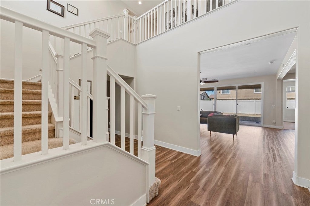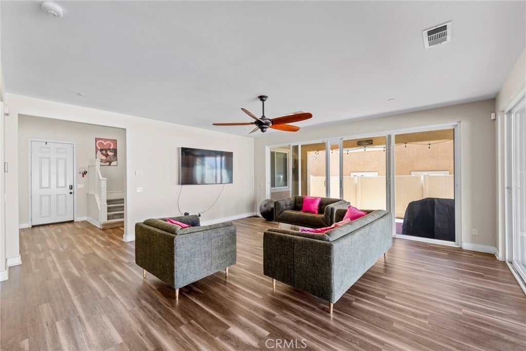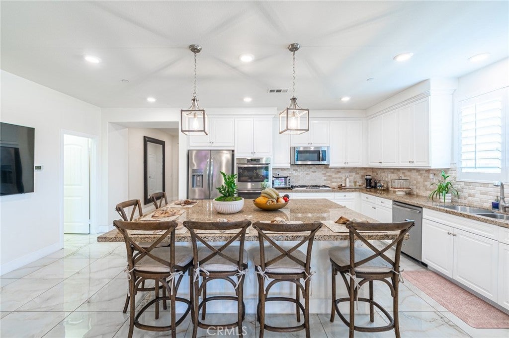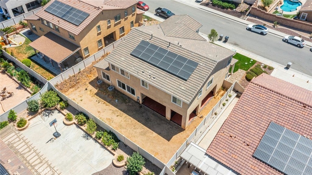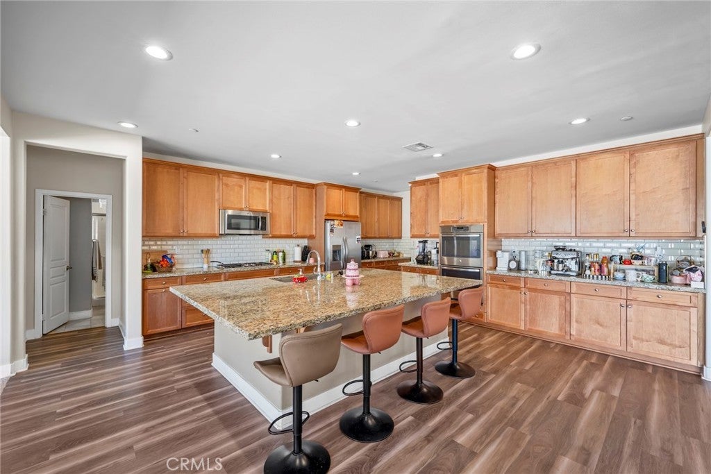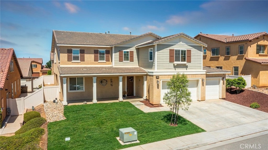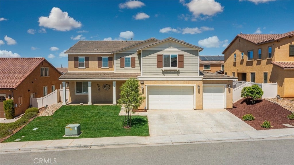 This expansive two-story home offers approximately 3,753 square feet of thoughtfully designed living space, including 6 bedrooms and 4 full bathrooms, making it ideal for growing families or multi-generational living. The layout features a spacious living area, a formal dining room, and a gourmet kitchen complete with an oversized granite island, double ovens, walk-in pantry, and ample cabinetry. Throughout the home, you'll find elegant finishes like dark wood-style laminate flooring downstairs, plush carpeting upstairs, and granite countertops in kitchens and baths. In addition to having a gorgeous interior layout, by stepping outside you'll find a beautifully maintained backyard with a wraparound concrete patio, ideal for relaxing, hosting, or gardening. solar lease to be transfer to new buyer at close of escrow