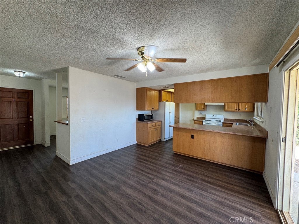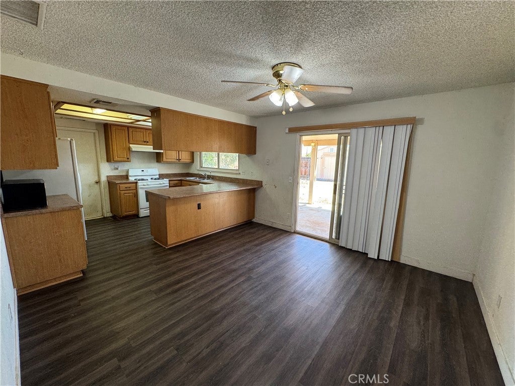 Welcome to this charming 3-bedroom, 2-bath home nestled in a beautiful neighborhood. The property features a secure gated entrance, a two-car garage, and a long driveway, providing both privacy and convenience. Inside, elegant vinyl flooring flows seamlessly throughout the home, creating a modern and inviting atmosphere. The spacious living room boasts a cozy fireplace and a large front-facing window, filling the space with natural light. Adjacent to the living and dining area, the kitchen offers ample countertop and cabinet space, fluorescent lighting, and a lovely view overlooking the backyard—perfect for everyday living and entertaining. The three generously sized bedrooms provide plenty of space for family or guests. Additional highlights include a two-car garage, a relaxing covered patio ideal for gatherings, and a storage shed for tools and equipment. The side yard connects to an expansive open area, offering endless potential for pets, gardening, or creating your own backyard retreat. This home also features a small solar system for added energy efficiency. Don’t miss the opportunity to make this warm and welcoming home yours!