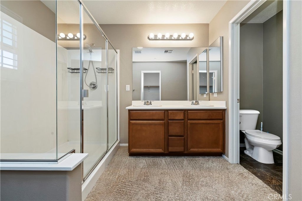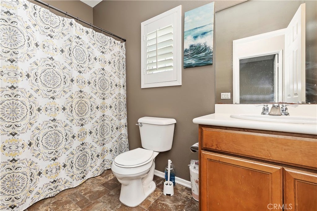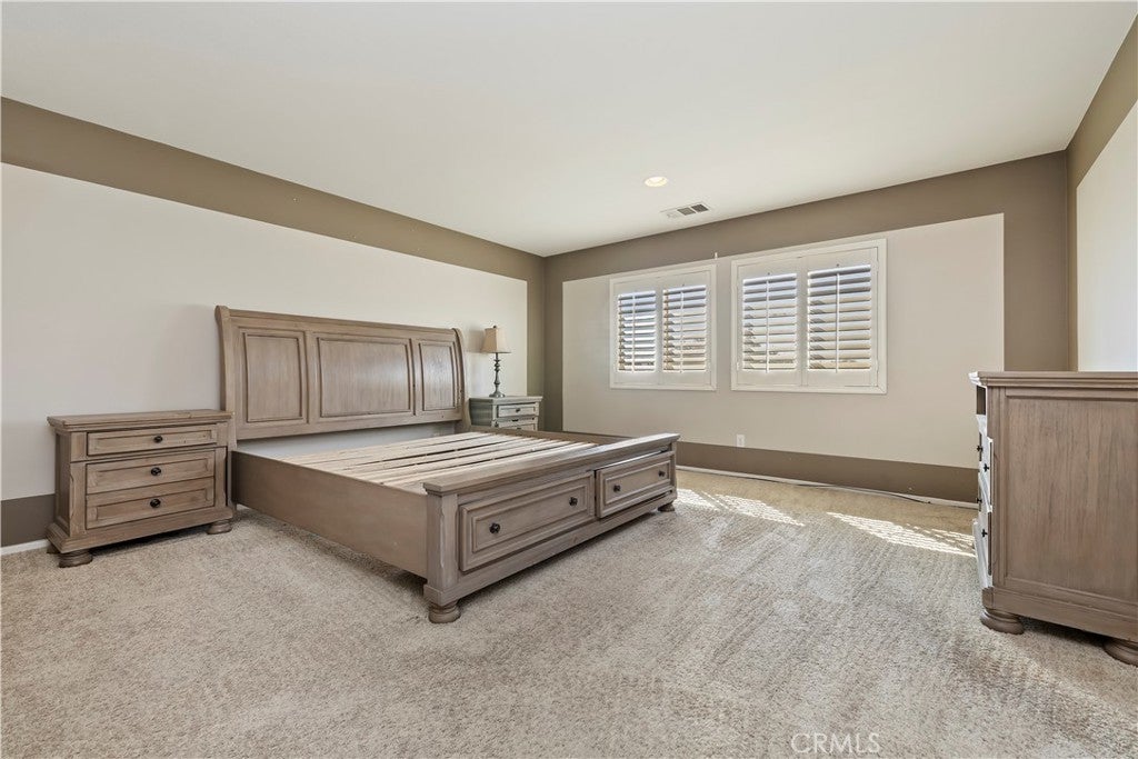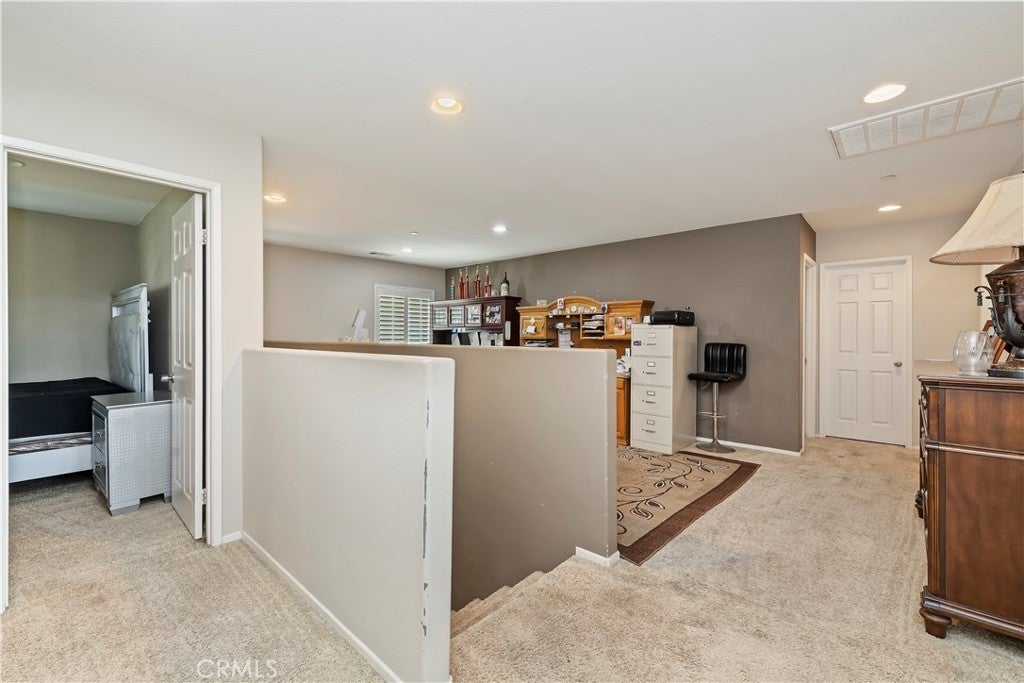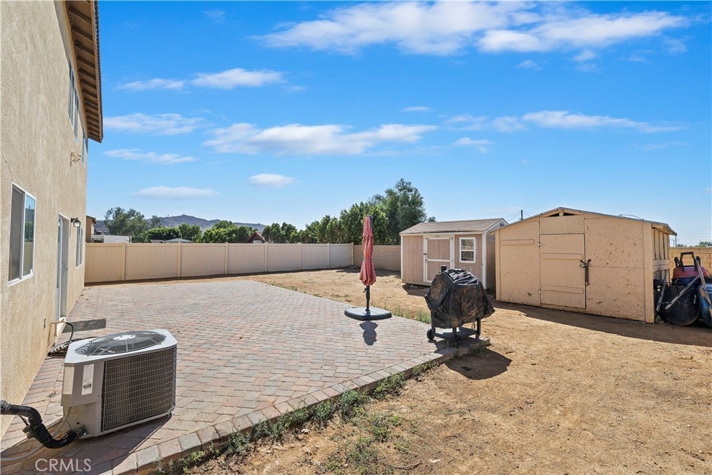 Welcome to this spacious 5-bedroom, 2.5-bath home. The interior features designer custom paint, plantation shutters, and recessed lighting throughout. The main floor offers 9-foot ceilings, an oversized family room, open kitchen with dining area, and a private bedroom with full bath. Upstairs includes a versatile loft, laundry room, and three secondary bedrooms—two with walk-in closets. The primary suite boasts a large walk-in closet, dual sinks, and a relaxing retreat atmosphere. The backyard is complete with a paver patio, block wall enclosure, and unobstructed mountain views with no neighbors on one side. Additional builder upgrades include ceiling fan kits, sprinkler systems, a fumigation system, and a tankless water heater. Conveniently located near new parks, schools, and freeway access and no HOA.
