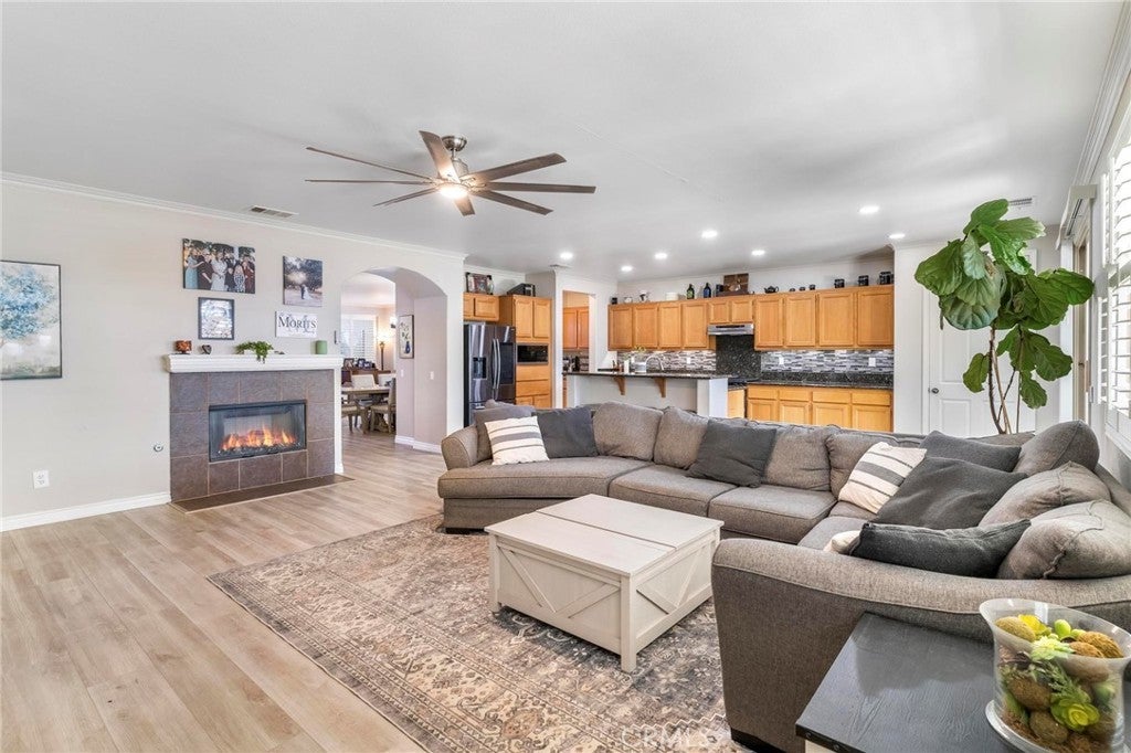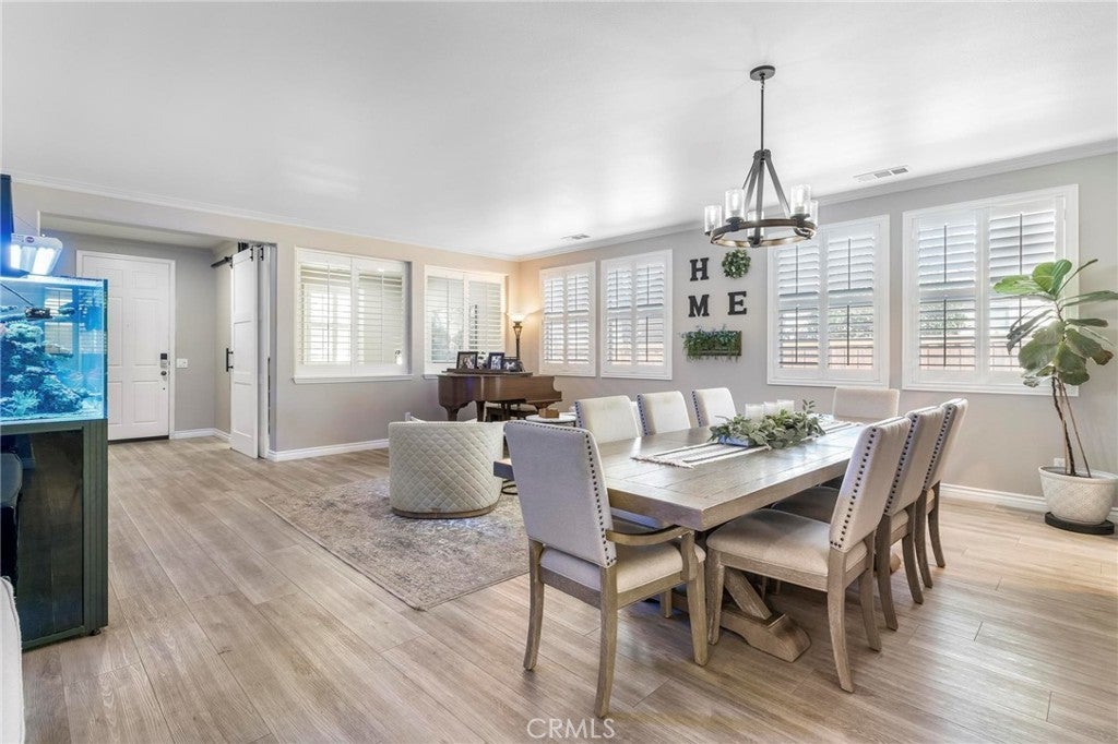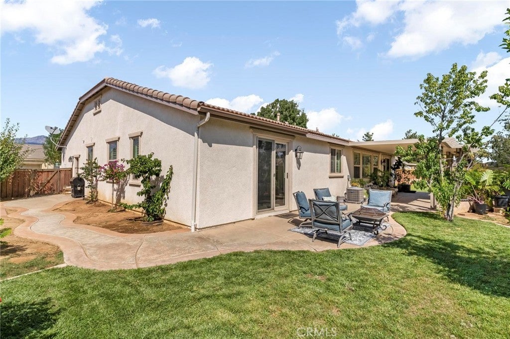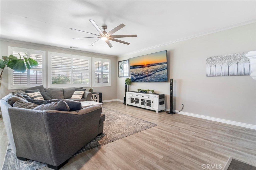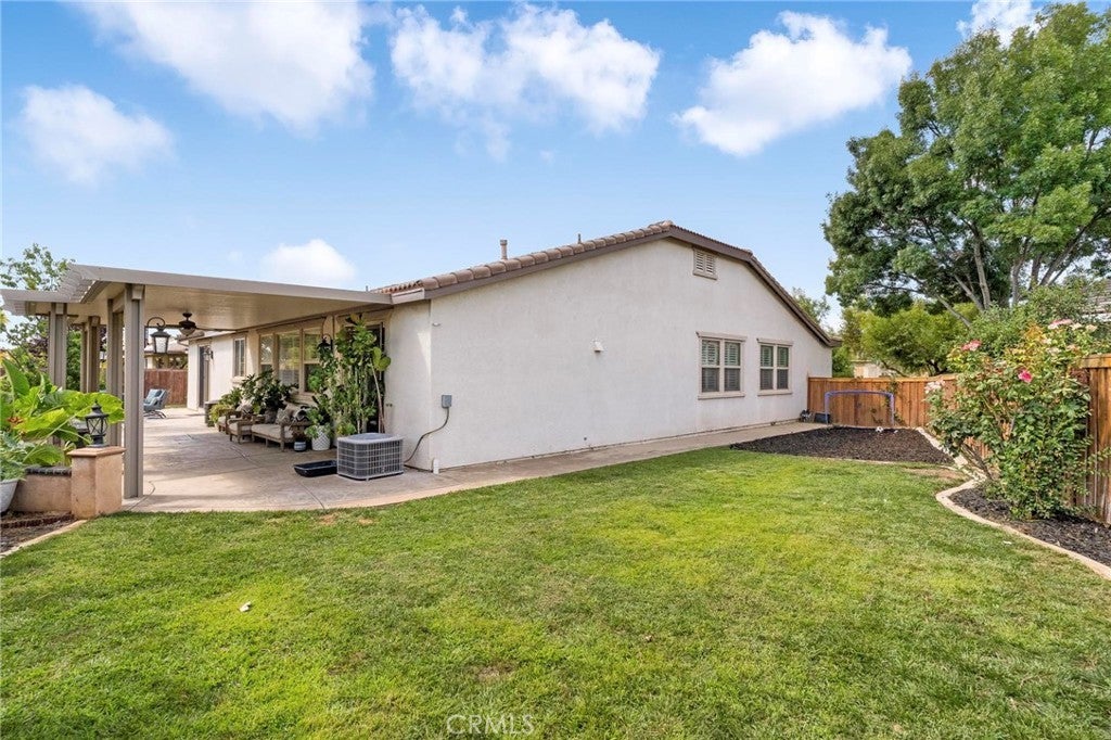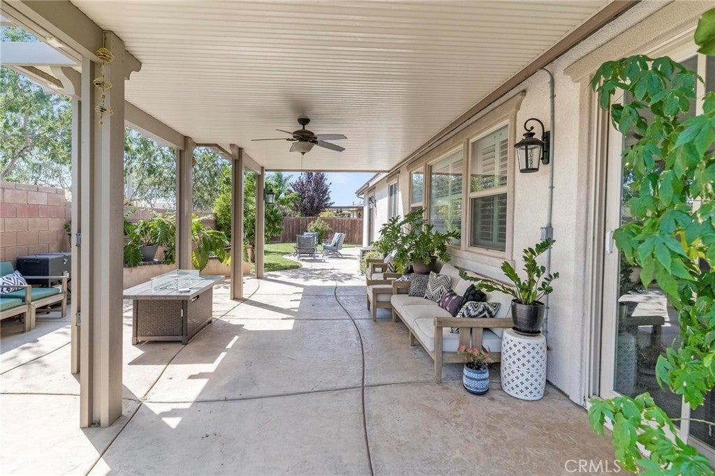 Beautifully upgraded single-story home offering 4 bedrooms, 3 bathrooms, plus an office that can easily serve as a 5th bedroom. From the moment you walk in, you’ll notice the vaulted ceilings, laminate flooring throughout, dual-pane windows, and custom shutters that bring in natural light and style. The spacious floor plan includes a large living area with sliding glass doors leading to the backyard, a kitchen with a double oven and ample storage, and a convenient indoor laundry room. The primary suite is a retreat of its own with direct patio access, a huge walk-in closet, and abundant storage. This home also features a 3-car garage with RV potential, providing plenty of parking and flexibility for toys or work vehicles. The backyard is designed for both enjoyment and function with a covered patio, two peach trees, one plum tree, and multiple citrus trees, all surrounded by colorful flowers in the front and back. Located in the desirable Sundance Community Association, this property offers a low HOA and a 1.8% tax rate, plus no solar—so no payment to absorb. A rare combination of upgrades, functionality, and outdoor charm in a well-maintained community—ready to welcome its next owner.