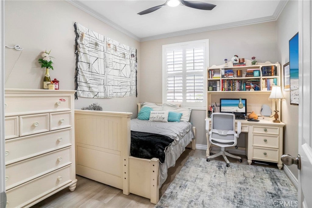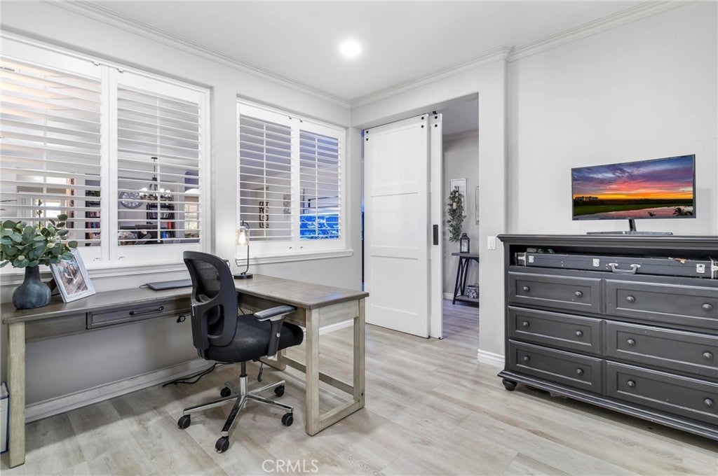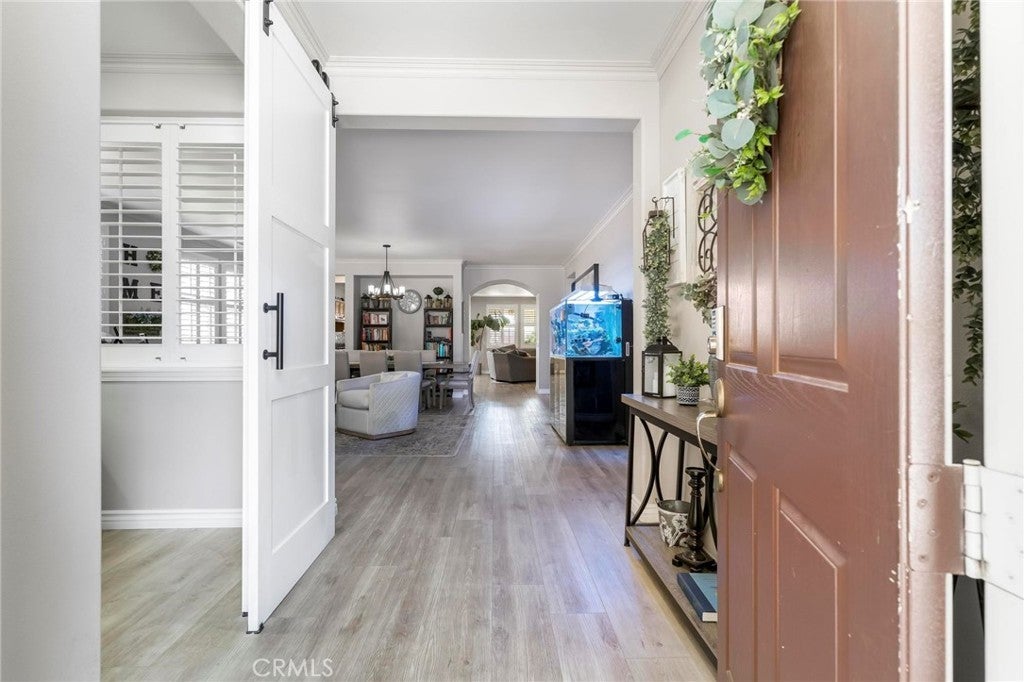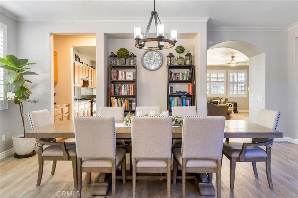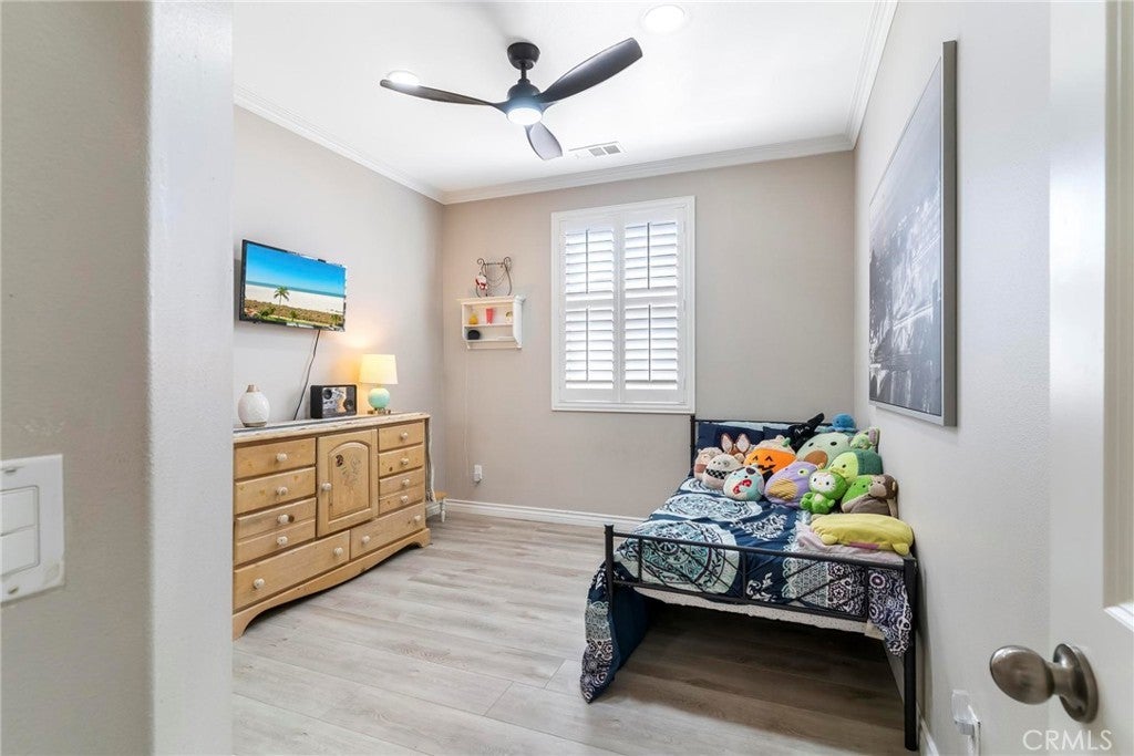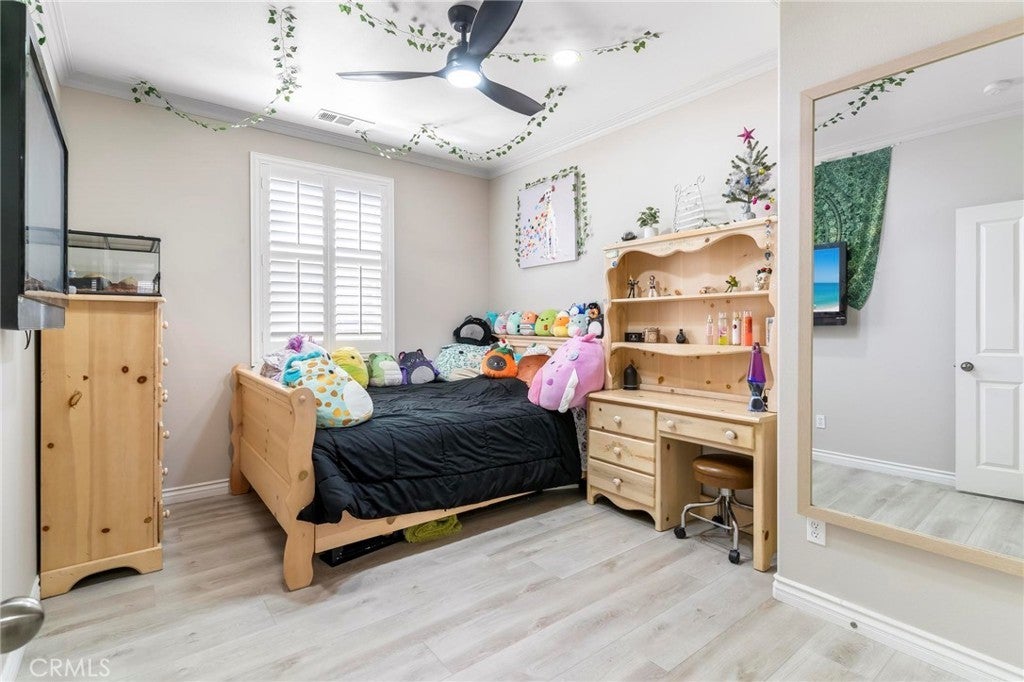 Beautifully upgraded single-story home offering 4 bedrooms, 3 bathrooms, plus an office that can easily serve as a 5th bedroom. From the moment you walk in, you’ll notice the vaulted ceilings, laminate flooring throughout, dual-pane windows, and custom shutters that bring in natural light and style. The spacious floor plan includes a large living area with sliding glass doors leading to the backyard, a kitchen with a double oven and ample storage, and a convenient indoor laundry room. The primary suite is a retreat of its own with direct patio access, a huge walk-in closet, and abundant storage. This home also features a 3-car garage with RV potential, providing plenty of parking and flexibility for toys or work vehicles. The backyard is designed for both enjoyment and function with a covered patio, two peach trees, one plum tree, and multiple citrus trees, all surrounded by colorful flowers in the front and back. Located in the desirable Sundance Community Association, this property offers a low HOA and a 1.8% tax rate, plus no solar—so no payment to absorb. A rare combination of upgrades, functionality, and outdoor charm in a well-maintained community—ready to welcome its next owner.