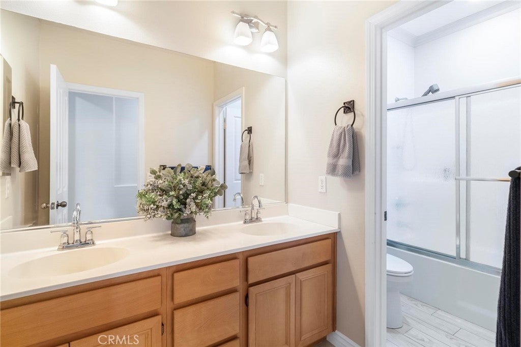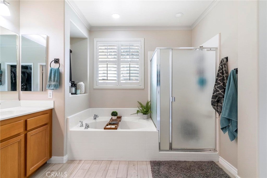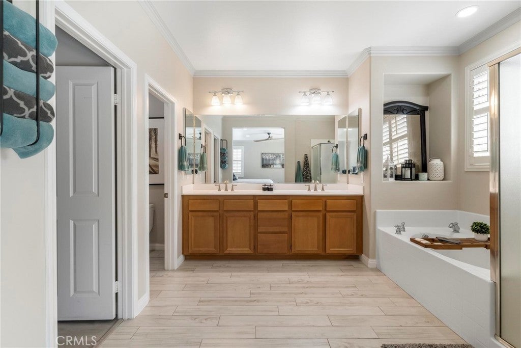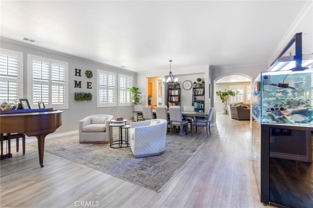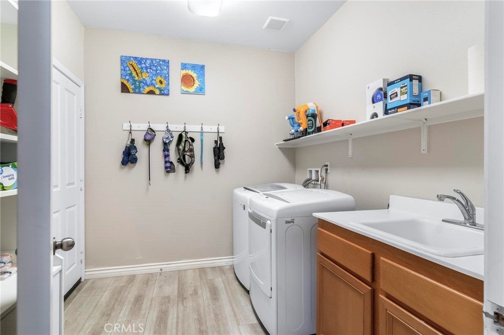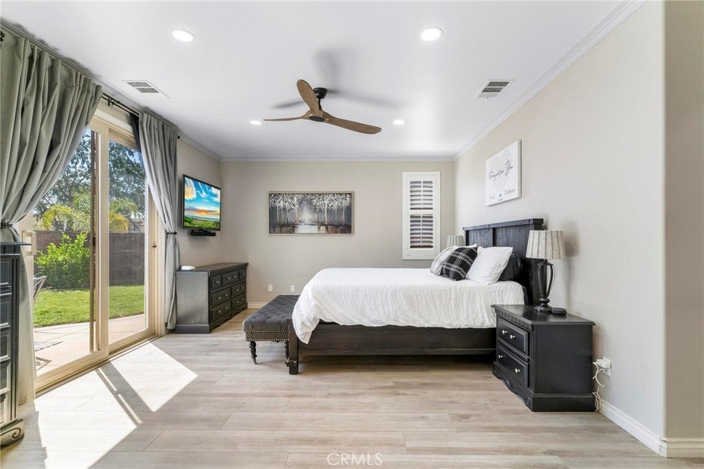 Beautifully upgraded single-story home offering 4 bedrooms, 3 bathrooms, plus an office that can easily serve as a 5th bedroom. From the moment you walk in, you’ll notice the vaulted ceilings, laminate flooring throughout, dual-pane windows, and custom shutters that bring in natural light and style. The spacious floor plan includes a large living area with sliding glass doors leading to the backyard, a kitchen with a double oven and ample storage, and a convenient indoor laundry room. The primary suite is a retreat of its own with direct patio access, a huge walk-in closet, and abundant storage. This home also features a 3-car garage with RV potential, providing plenty of parking and flexibility for toys or work vehicles. The backyard is designed for both enjoyment and function with a covered patio, two peach trees, one plum tree, and multiple citrus trees, all surrounded by colorful flowers in the front and back. Located in the desirable Sundance Community Association, this property offers a low HOA and a 1.8% tax rate, plus no solar—so no payment to absorb. A rare combination of upgrades, functionality, and outdoor charm in a well-maintained community—ready to welcome its next owner.