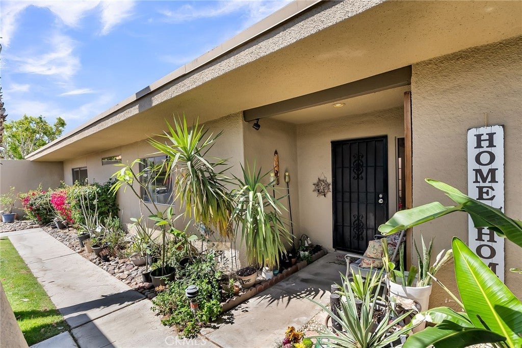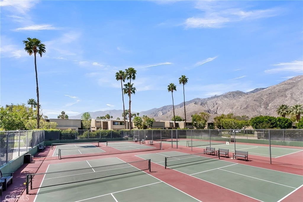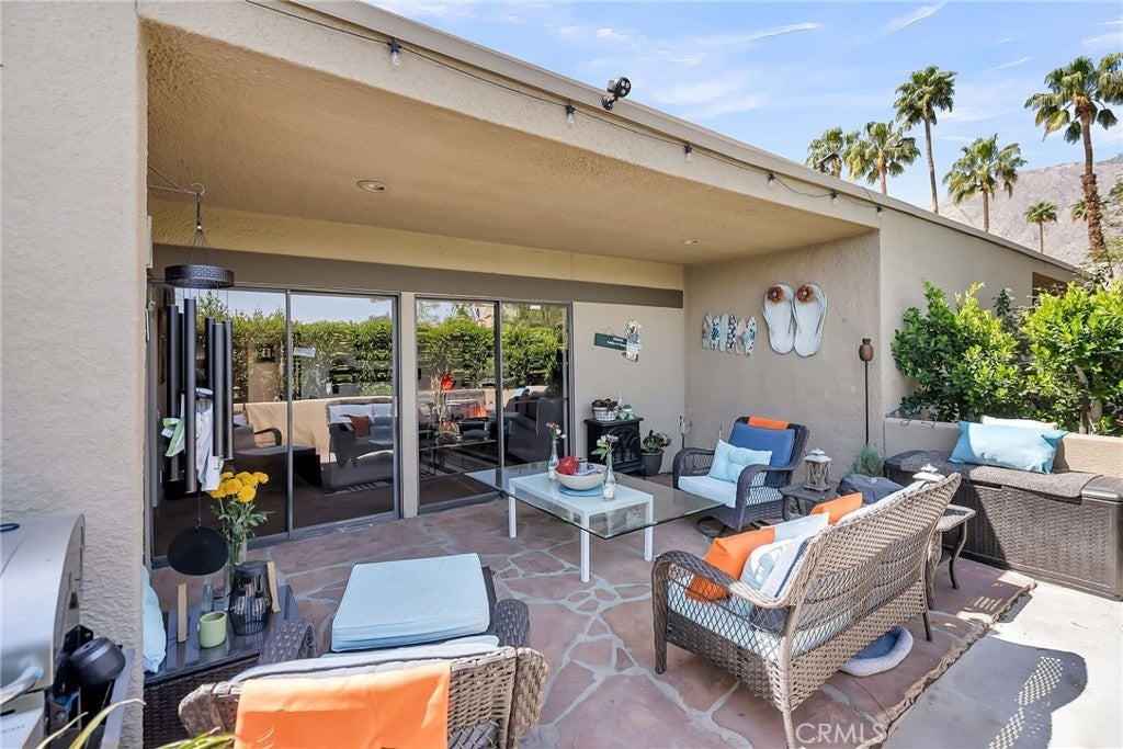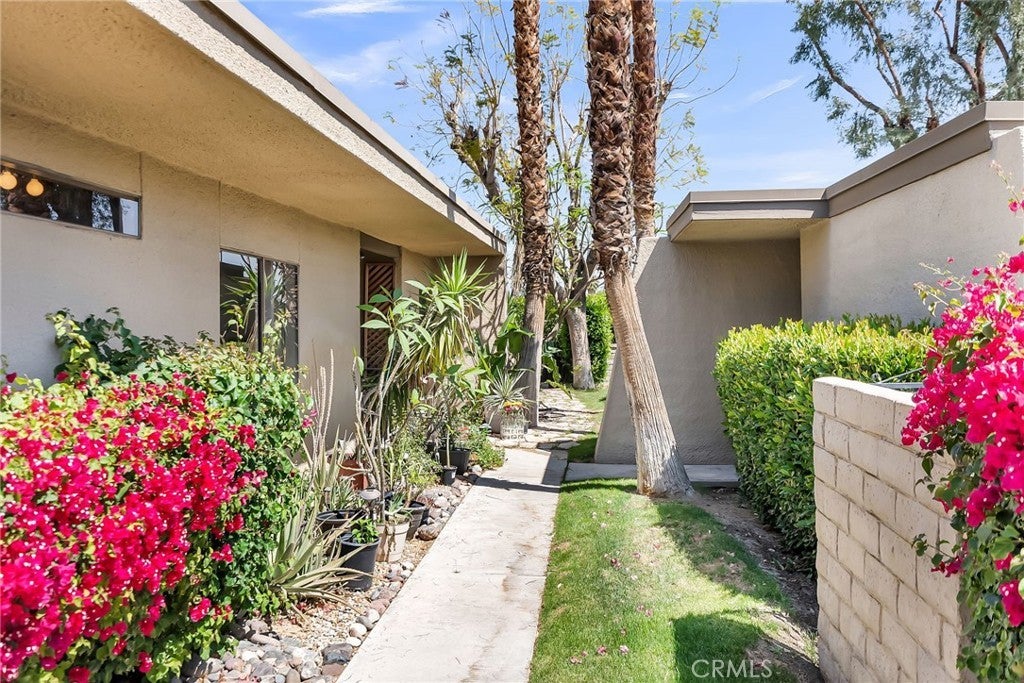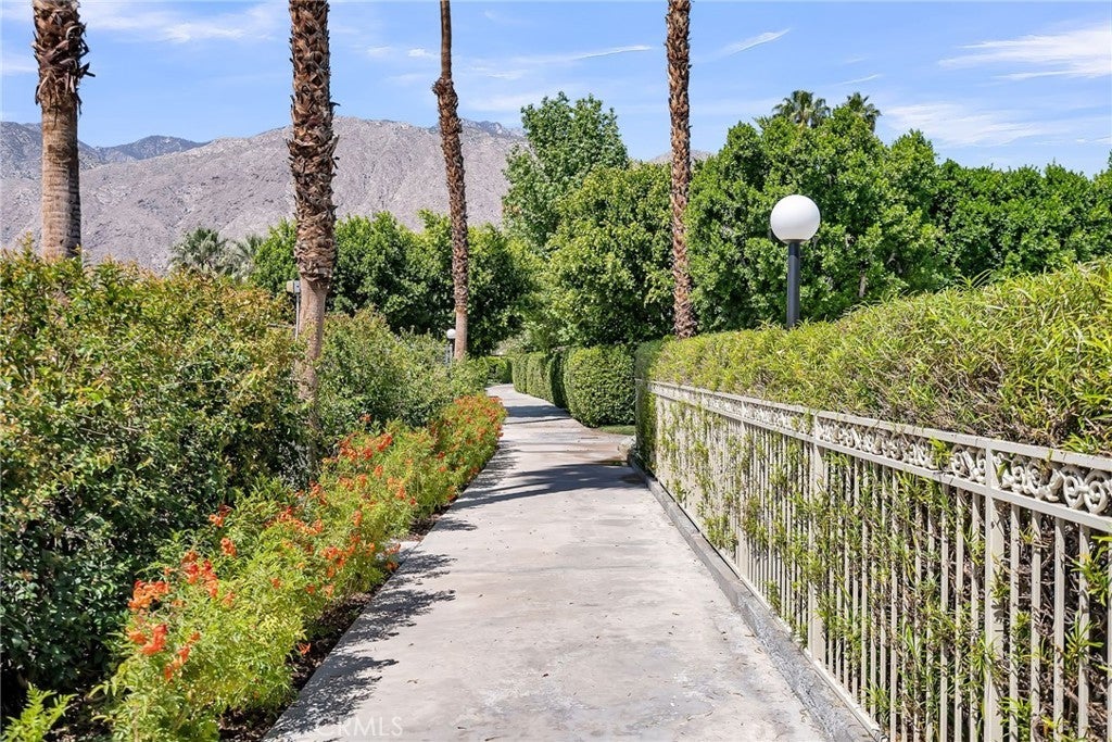 Welcome to the Rose Garden in Downtown Palm Springs! This 3 bedroom, 2 bathroom condominium on FEE LAND is centrally located on the North side of the community. The unit has a private entry way. Upon entering the natural light from the atrium brightens the entire home. The large living room provides ample space for guests or for comfort. The kitchen includes new dishwasher, stone counter tops, and plenty of cabinetry for storage. Leaving the kitchen you enter the dining room. Views of the mountains through the multiple glass sliding doors are simply amazing! Enjoy those peaceful desert nights while you relax in your private back patio. Stone floors throughout the home and even lead through the back patio as well. The guest bedrooms are great sized with one also leading to the central atrium. The primary suite also provides beautiful views. The Rose Garden offers a community pool directly across from this unit. Close by is also multiple pickleball courts. Just minutes from Palm Canyon, this community truly exemplifies the Palm Springs Lifestyle.