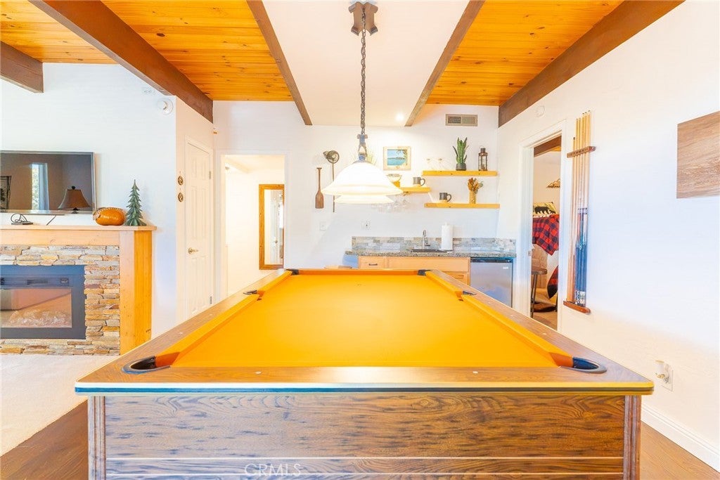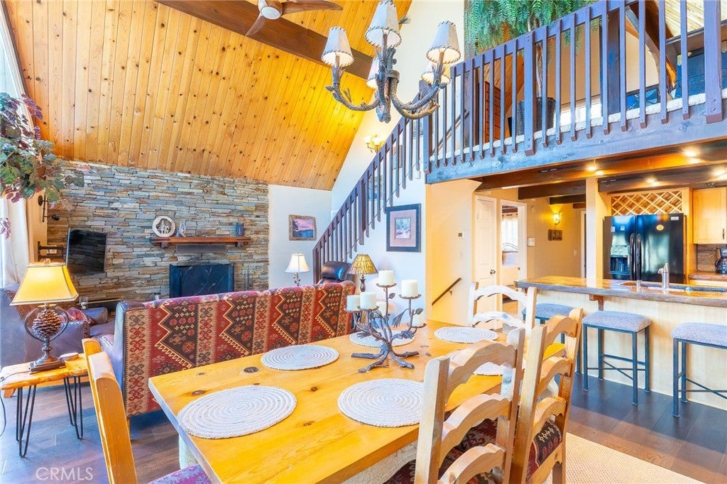 Welcome to your beautiful Lake Arrowhead home with lake rights and stunning mountain views! This move-in ready mountain retreat offers a nearly level entry from parking and an inviting open layout with vaulted ceilings and floor-to-ceiling windows leading to a spacious scenic deck. The main floor includes a primary suite, an upgraded bath, kitchen, and a guest bedroom. Upstairs, a versatile loft with closet can serve as a 4th bedroom or office. The lower level features a family room with fireplace, wet bar, pool table, guest bedroom, full bath, laundry room, and private deck. Upgrades include:Newer stone fireplace and added lower fireplace, added primary bath and whole house fan, resurfaced driveway with new retaining wall & extra parking, newer windows and sliding doors, newer flooring on main level and lower level, newer interior paint, newer front door. Comes completely furnished—ready for year-round living or weekend getaways! Don’t miss this Lake Arrowhead gem with lake right and every comfort already in place. Main road: Grass Valley is snow plowed.