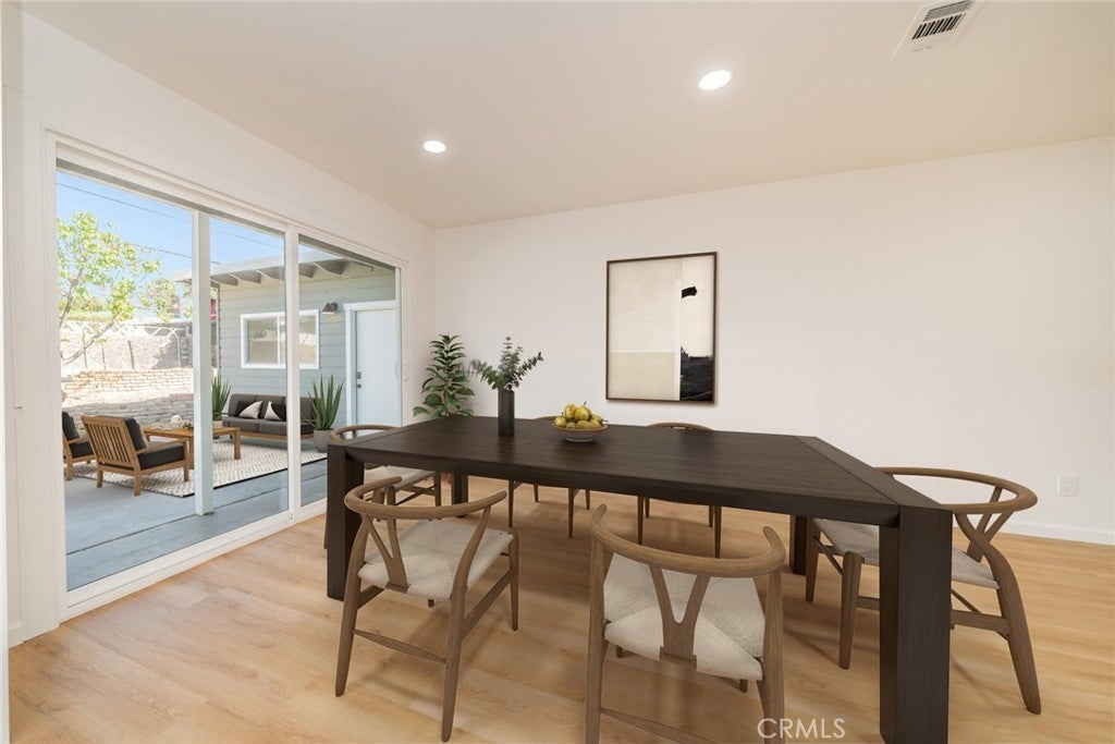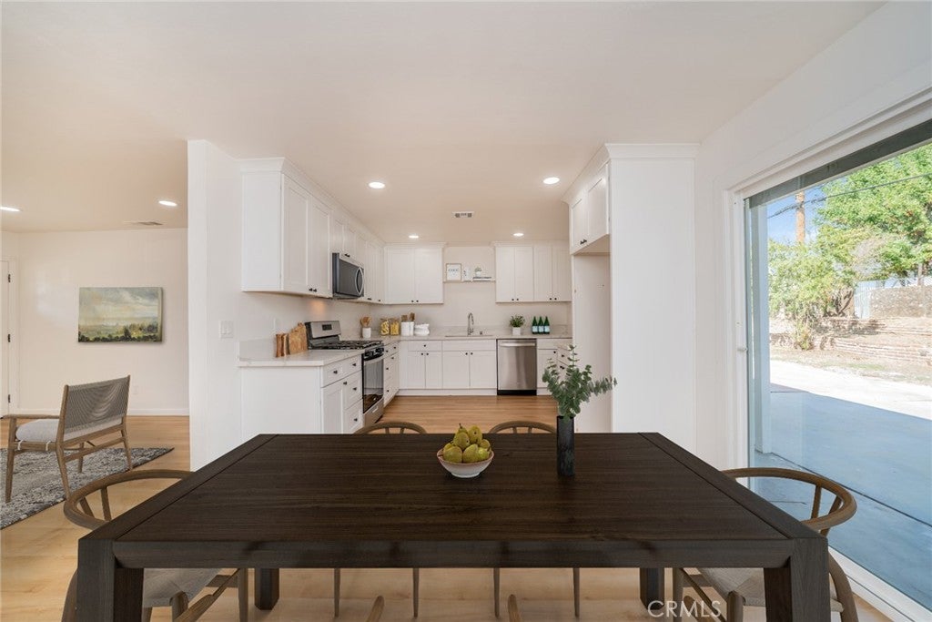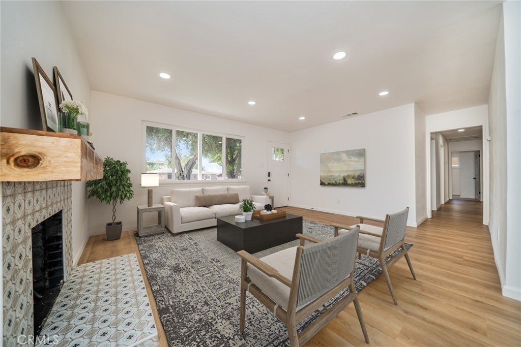 Stylishly Remodeled and move-In Ready! Discover the perfect blend of modern design and everyday comfort in this beautifully renovated single-story home located in North San Bernardino. Featuring 4 bedrooms and 2 updated bathrooms, this home has been thoughtfully refreshed from top to bottom with today’s most sought-after finishes. A lush new lawn and vibrant landscaping create standout curb appeal. Inside, a bright and open floor plan welcomes you with recessed lighting, modern tile and wood-laminate flooring, and designer touches throughout. The spacious living room showcases a striking tiled fireplace and expansive windows that fill the space with natural light. The open dining area flows into a fully remodeled kitchen complete with white shaker cabinetry, quartz countertops, and new stainless steel appliances—ideal for everyday meals and effortless entertaining. All four bedrooms are generously sized and feature ceiling fans and ample closet space. The hall bathroom includes sleek, modern finishes and a stylish shower/tub combo, while the primary suite offers its own private bath with a step-in shower and contemporary upgrades. Step outside to a spacious backyard designed for gatherings, gardening, or quiet relaxation. A detached bonus room—already equipped with gas, hot and cold water, and drainage—presents incredible potential for an ADU, home office, studio, outdoor kitchen, or home-based business setup. Additional upgrades include a new HVAC system, new water heater, new windows and doors, and a convenient indoor laundry area. Close to schools, shopping, and dining, this turnkey property delivers modern style, thoughtful improvements, and an unbeatable location. Don’t miss your chance to view this exceptional North San Bernardino home—schedule your private showing today! *To help visualize this home’s floor plan and to highlight its potential, virtual furnishings may have been added to photos found in this listing.