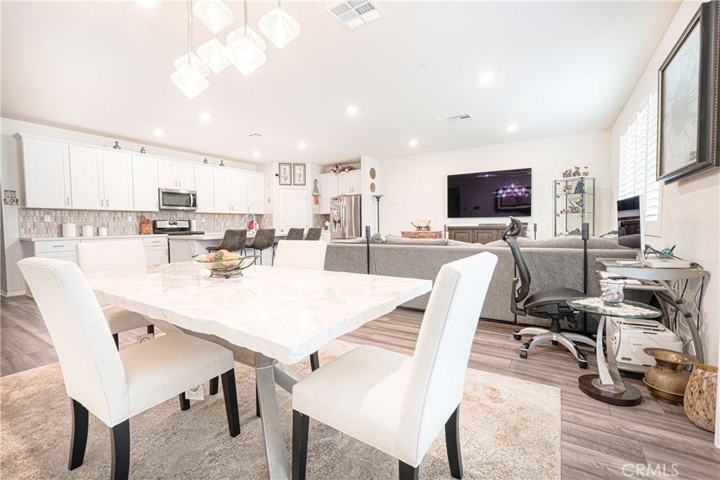 Step into this stunning, nearly new single-story home nestled on a desirable corner lot in the vibrant community of Moreno Valley. Featuring 4 bedrooms and 2 baths, and approximately 1,905 sq ft of living space. From the moment you enter, you’ll appreciate the open-concept layout, highlighted by recessed lighting and stylish track lighting in the dining area. The chef’s kitchen boasts a generous island, L-shaped custom cabinetry with white-washed glass doors, a walk-in pantry, and top-tier appliances. Retreat to the master suite, where you will find a spacious walk-in closet with custom built-ins, blackout blinds behind plantation shutters, and a ceiling fan create an inviting sanctuary. Both baths feature dual sinks and built-in heaters for a spa-like experience. Outside, the landscaped low-maintenance yard features turf, gravel, and palm trees for curb appeal. The backyard is an entertainer’s dream with a covered patio, hardscape, and optional spa area—ideal for relaxing or hosting guests. Efficiency meets comfort with a fully paid-off solar panel system, and tankless water heater. The attached two-car garage includes custom cabinetry and upper storage racks. Located in a well-established neighborhood, this home offers modern upgrades, smart design and a move-in ready lifestyle.