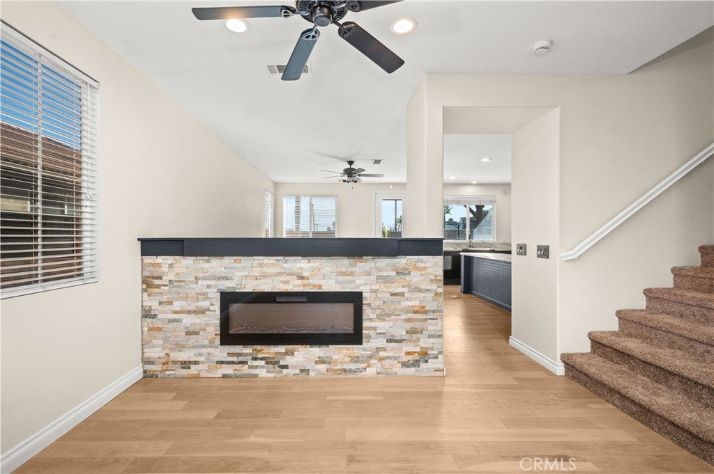 Welcome to this spacious beautifully updated two-story home featuring 4 bedrooms and 3 full bathrooms, ideally located in a desirable Lake Elsinore neighborhood. The entire home has been freshly painted inside and outside offering a bright and modern feel throughout. Stepping through the front door into the formal living room there is a built-in electric fireplace and an entertainment center which is perfect for relaxation or entertaining guests. Continuing into the open-concept dining area is a wine cooler and a remodeled kitchen featuring new stainless-steel appliances, a large island, and ample storage cabinets. The first floor offers a private bedroom with an adjoining full bath which is ideal for guests or for a home office. A staircase from the living room leads to the second-floor loft which is ideal for a family room, a study, or a media area. The laundry room is conveniently located upstairs near all bedrooms. To the right of the loft are two bedrooms featuring ample closet space and a shared full bathroom. To the left of the loft is the primary suite which offers a peaceful retreat with a sitting area, a walk-in closet, and a luxurious ensuite bathroom featuring dual sinks, a soaking tub, and a separate shower. Stepping out on to the private balcony to the left is a beautiful lake view and to the right is the view of the mountain ranges and valley. The front yard is meticulously landscaped with water-efficient plants, dwarf palm trees, roses, and privacy shrubs. A spacious two-car garage comes equipped with a water filtration system providing clean filtered water throughout the home. The large backyard with a pergola, outdoor seating area, lush green lawn, a tall palm tree, and an avocado tree is perfect for entertainment. This house is located just minutes from the lake, hiking, and biking trails. This is a MOVE-IN READY home. Don't miss your chance to make it yours. Schedule a visit today! Buyer(s) and the selling agent(s) are to do their due diligence to ascertain the accuracy of the information provided.