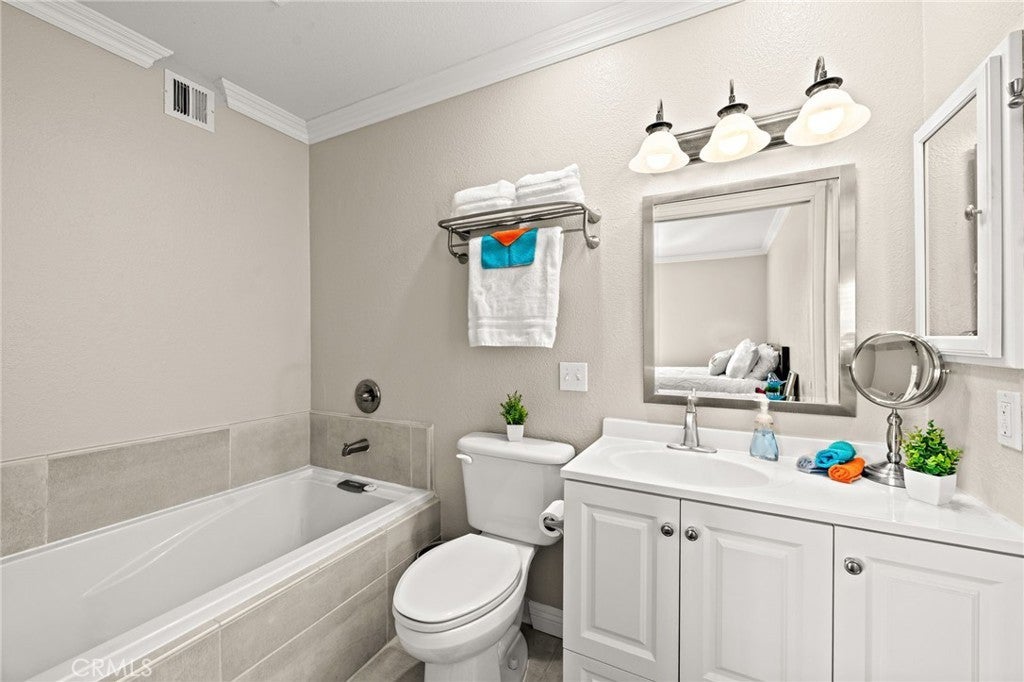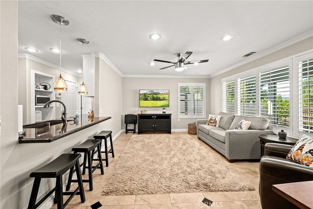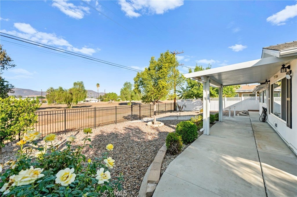 Honey stop the car! Your search ends here. Attention seniors—enjoy low taxes and low HOA in this beautifully upgraded golf course view home. This spacious residence features a formal living room, family room, dining area, and a versatile bonus room with slate tile flooring and custom French doors—ideal for an office or craft space. The open, flowing layout is perfect for entertaining. Interior highlights include beautiful wood flooring, crown molding, recessed lighting, plantation shutters, four ceiling fans, newer dual-pane windows, 5” baseboards, paneled interior doors, and custom front and back doors with security screens. The kitchen is a cook’s dream with beveled-edge granite countertops, white shaker cabinets with pull-out drawers, a spacious pantry, built-in granite desk, upgraded appliances, designer sink and faucet, and 18” ceramic tile flooring. The kitchen opens to the formal dining and family rooms, creating a seamless space for gatherings. Both bedrooms are generously sized. The primary suite (approx. 12’ x 14.3’) offers a wall-to-wall closet and an upgraded ensuite bath with a garden tub. The hall bath features a step-in shower with ceramic tile surround, new fixtures, and modern vanities. The light and bright living room (approx. 14’ x 14.6’) is enhanced by a charming barn door. The large indoor laundry room includes white shaker cabinets, 18” tile flooring, a mud sink, and backyard access. The home is painted throughout in a neutral designer color palette. Outside, enjoy beautiful curb appeal with low-maintenance landscaping, decorative concrete borders, stone accents, stamped concrete, and a covered front porch. The fully fenced backyard offers privacy and stunning golf course views with an Alumawood patio cover, fenced side yard perfect for pets, 6’ x 10’ shed, rain gutters, vinyl fencing, and wrought-iron rear fencing to maximize the views. This home combines comfort, style, and breathtaking surroundings. Hurry—this one won’t last!