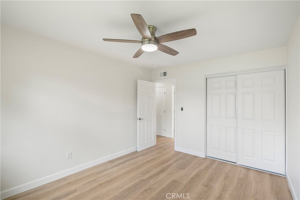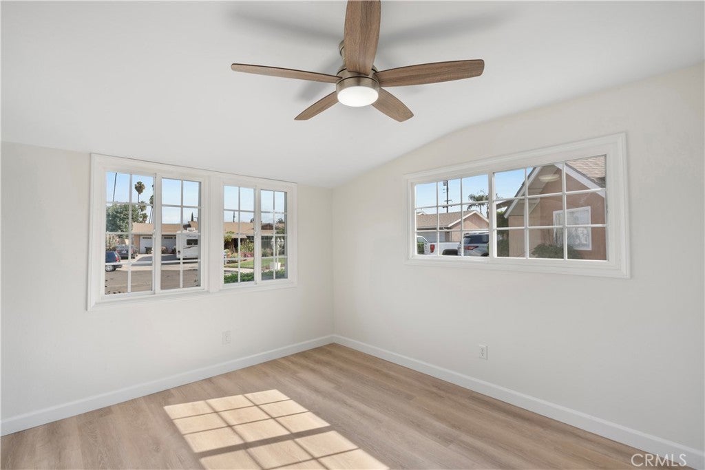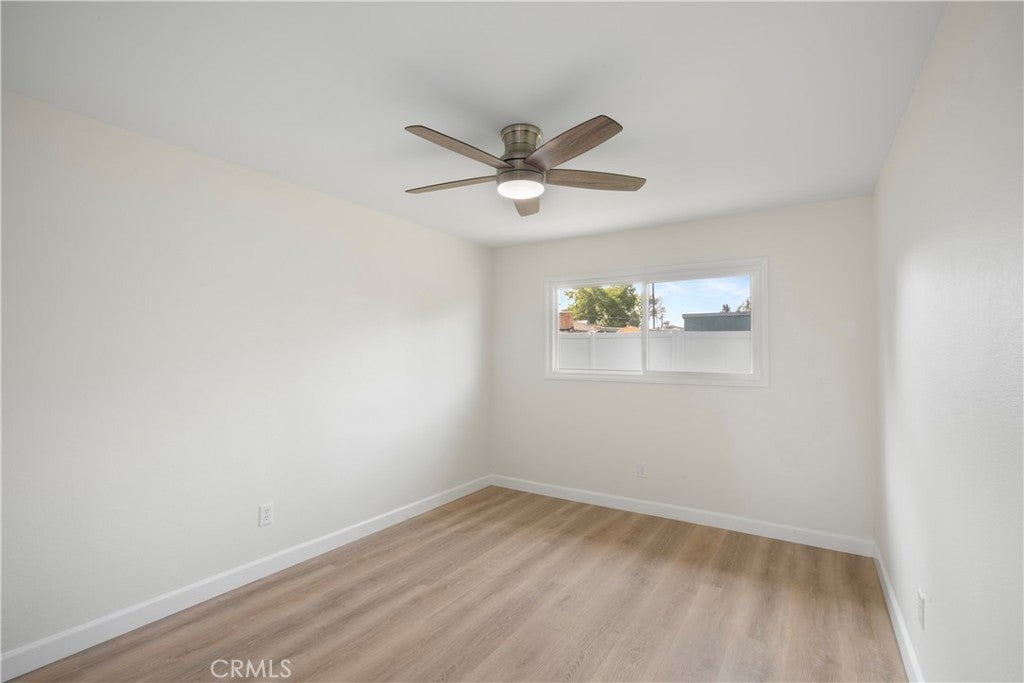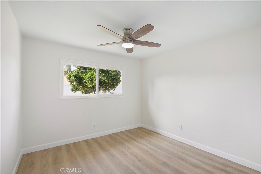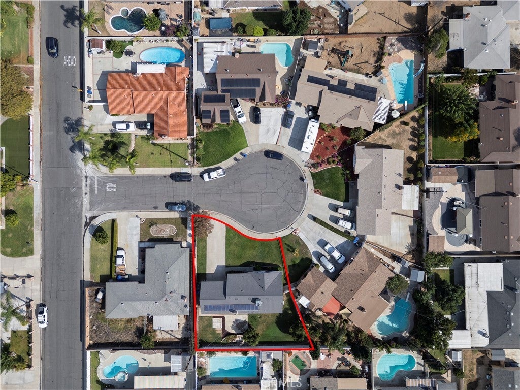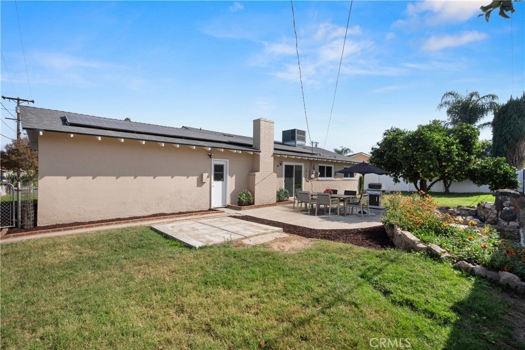 This stunning, move-in ready home offers modern style, energy efficiency, and a fantastic location. Step inside to find new flooring, fresh interior paint, and recessed lighting throughout, creating a bright and welcoming atmosphere. Both bathrooms have been fully remodeled with designer touches including tiled showers, custom lighting options, and a double-sink vanity in the main bath. The indoor laundry area adds convenience, while all bedrooms feature ceiling fans for year-round comfort. Enjoy lower utility bills with paid-off solar panels and relax outdoors in the well-maintained yard with mature orange trees, perfect for entertaining or unwinding at the end of the day. This home is tucked away on a peaceful cul-de-sac and offers privacy while still being close to the freeway, shopping, and dining.