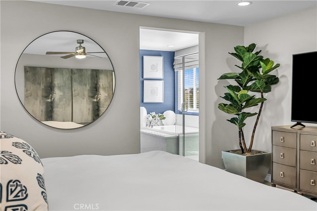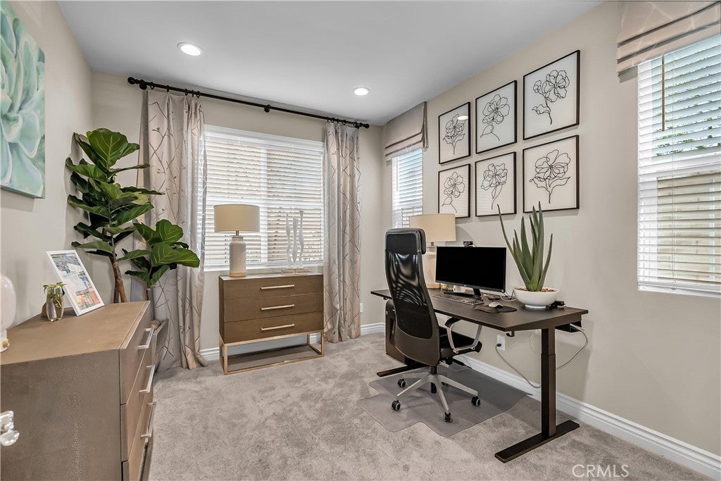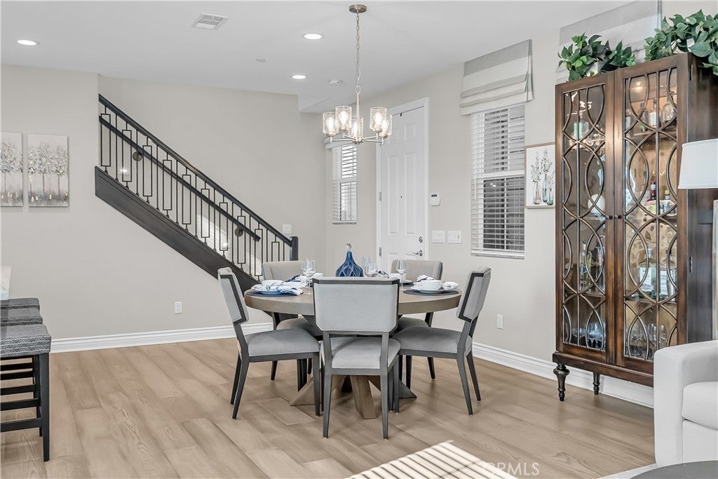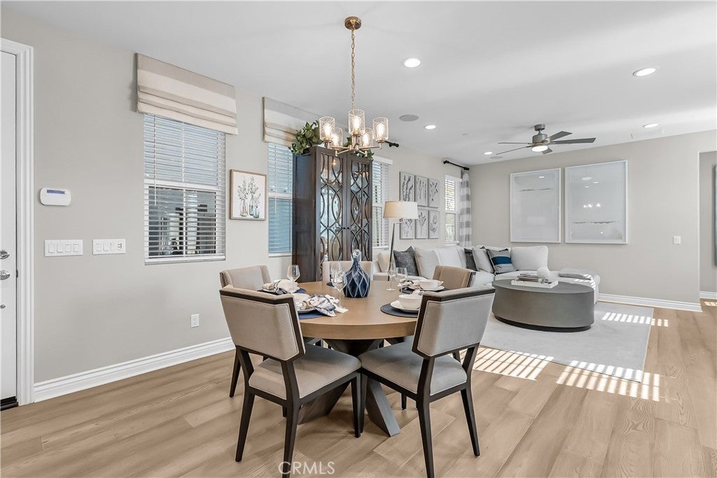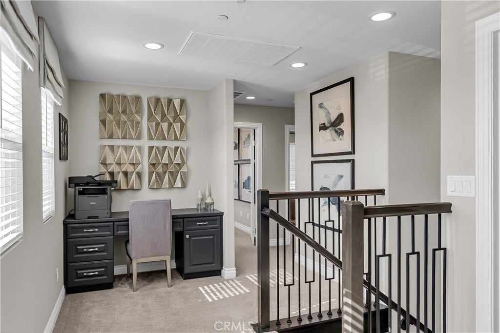 Highland Park – Former Model - Designed as the exemplary iteration of the popular Norcroft floor plan, this is not an average production home. The professional interior design elements, along with curated upgrades throughout, enhance this open floor plan that boasts a bedroom and full bath on the first floor. The gourmet kitchen serves as the focal point of the common areas, uniting design and function. Striking deep-blue cabinetry complements the stainless-steel appliance suite, full height backsplash, center island with leather finished marble. The same design theme continues to the butler’s pantry/coffee bar and walk in pantry that are conveniently ensconced in an alcove off the kitchen. Just beyond the kitchen, the light-filled family room offers large windows, recessed lighting, and warm wide-plank flooring creating a bright, welcoming atmosphere. Up the custom banister and handrail, the second floor continues to impress. At the terminus of the staircase, a large loft with built in desk awaits. The primary suite sits on the opposite side of the 2nd floor from the secondary bedrooms, allowing for privacy. The primary suite is an opulent affair with a spa-like ensuite bath and walk-in closet. Two more bedrooms and a laundry room(w/sink) complete the second floor. Outside, the home wraps the backyard patio, creating a private courtyard for entertaining or dining. The yard is fully landscaped with turf, trees, ornamental gravel, and a drip system. Value add items such as PAID solar, a whole house fan, 2 car attached garage, and a premium lot make this a must see. Highland Park offers robust amenities: pool, spa, clubhouse, playground, dog park, and gated entry. This one is a must see.