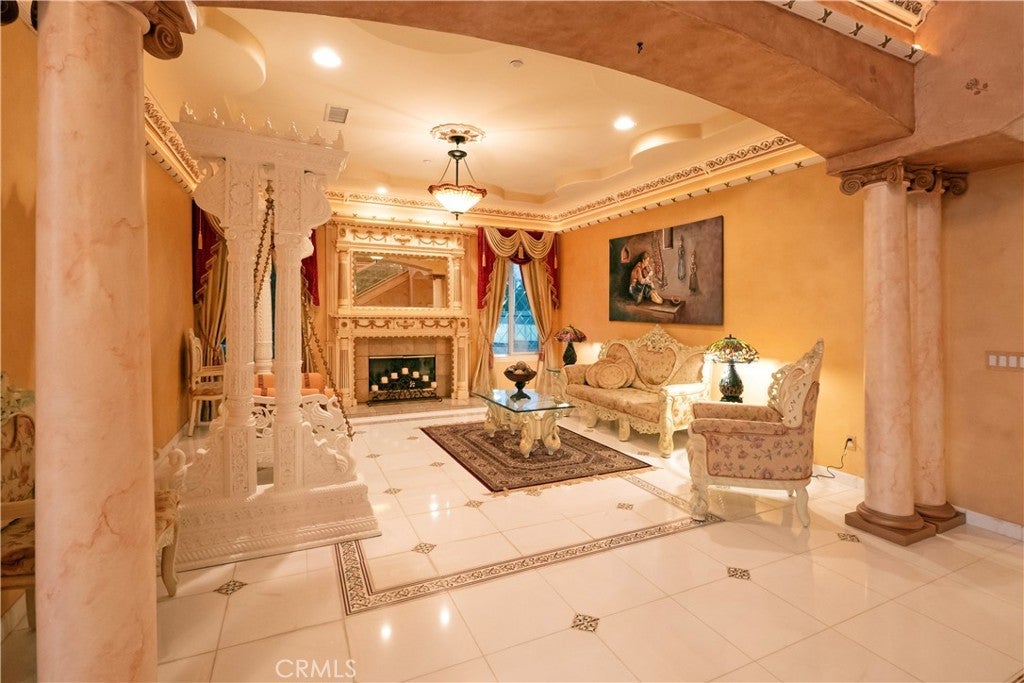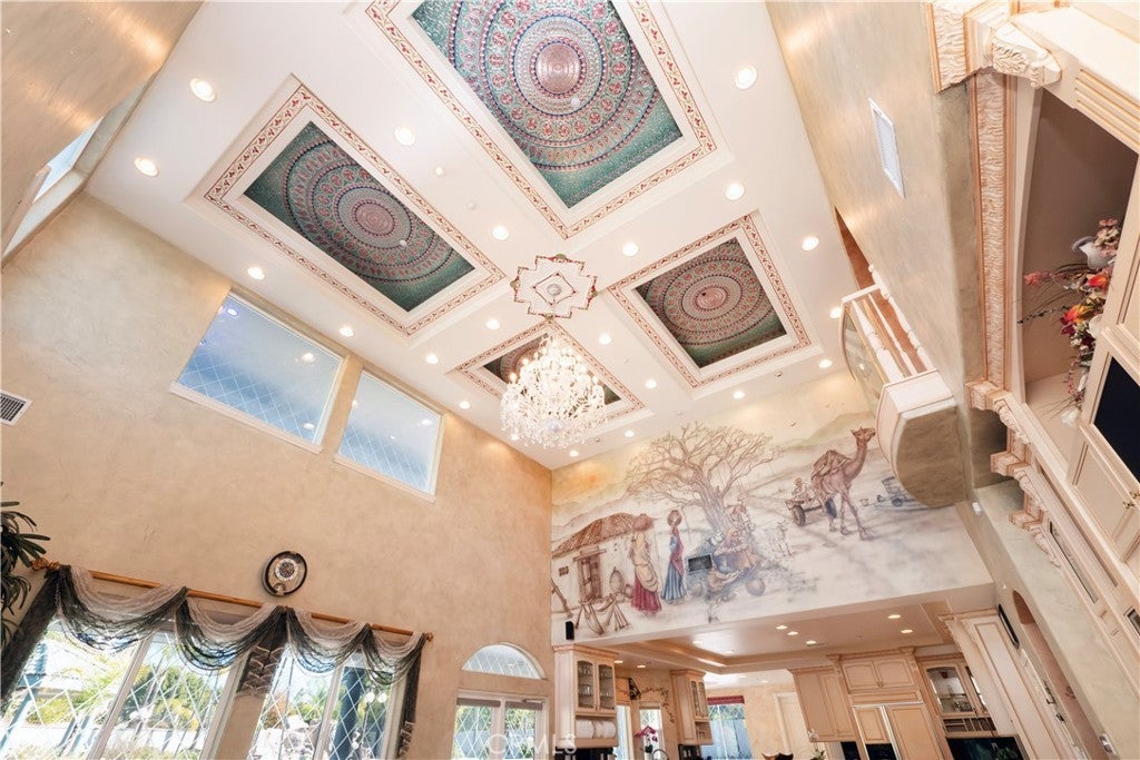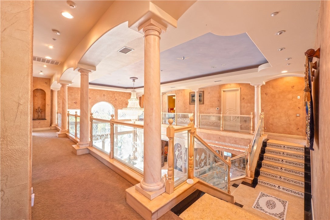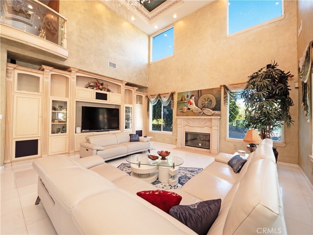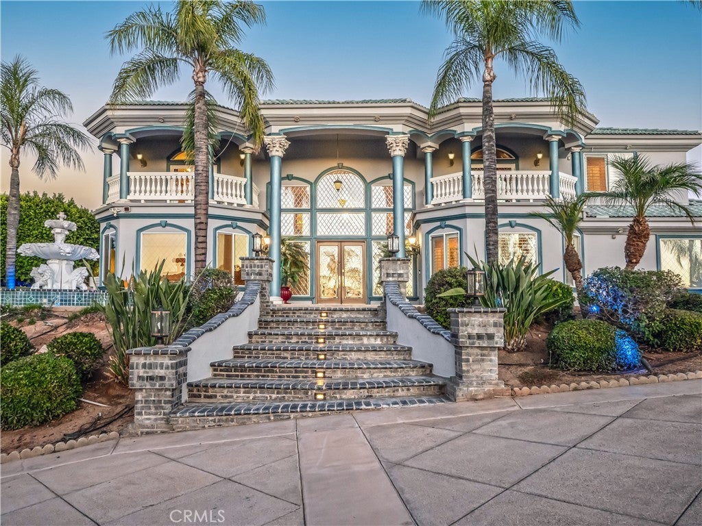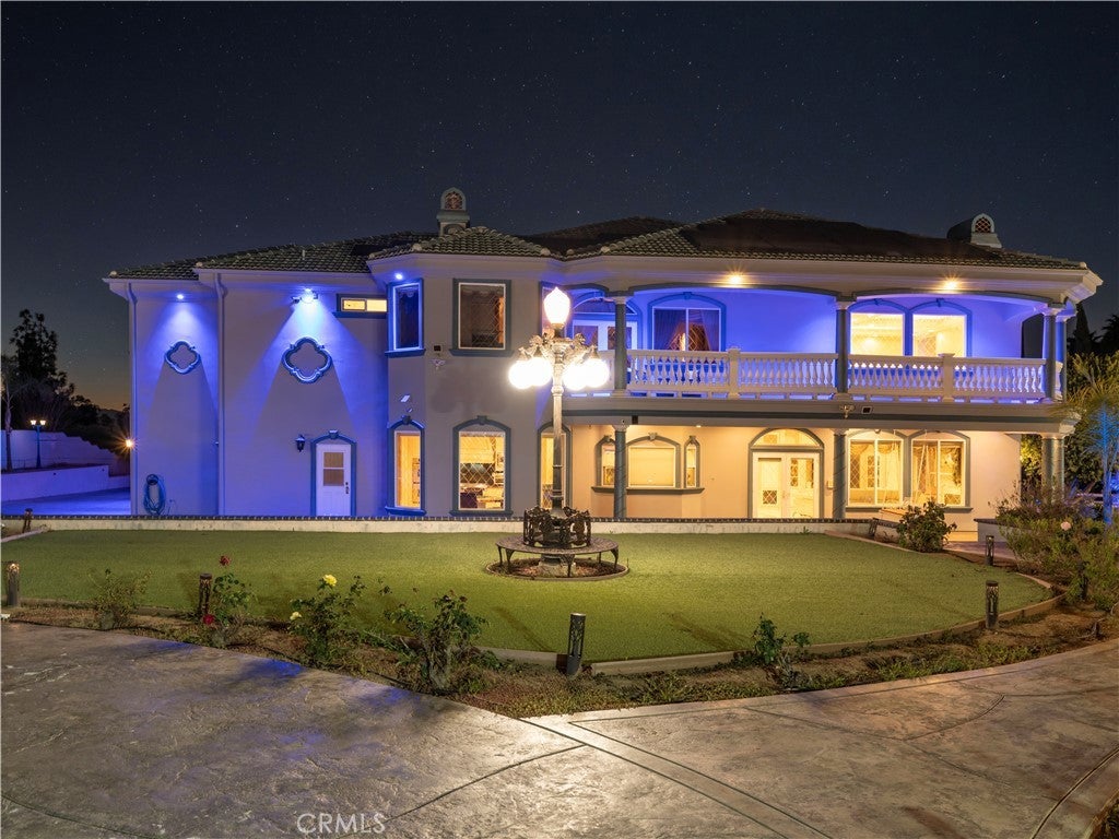 The original owners raised a large family here and loved to host events of all kinds—and it shows in every thoughtful detail of this grand estate. From intimate family dinners to grand celebrations, this home was designed to create lasting memories and exceptional entertainment. Guests will be captivated from the moment they arrive. Walking past the welcoming sculpture, they'll enter through double beveled glass doors into a dramatic two-story foyer that takes center stage. Elegant mother-of-pearl inlay adorns the marble flooring, while rope lighting illuminates the soaring space. Surrounding this stunning foyer, discover a music alcove, two versatile bedrooms, a gracious living room, a formal dining room, and a bonus room perfect as library, wine cellar, home office, or bar tailored to your lifestyle. The second floor offers five spacious bedrooms, each thoughtfully positioned for privacy and a designed theater room —that can convert easily to an additional bedroom. The crowning jewel is the opulent primary suite; complete with a private balcony, cozy fireplace, reading nook, luxurious 14k gold bathroom fixtures, makeup vanity, dual sinks, and a walk-in closet with built-in dressers. The chef's kitchen is where this home truly shines for entertaining. Featuring two stoves with 10 total burners, stainless steel appliances, granite countertops, extensive cabinetry, a walk-in pantry, and a massive island. It opens to a second, casual dining area and family room—ideal for everyday gatherings. A large butler's pantry with a separate entrance makes catered events seamless as it leads out to the resort-like yard. With its outdoor kitchen area, complete with generous counter space, grill, refrigerator, and sink; lighted tennis/basketball court that allows for play any time of day or night; resort-style pool featuring a cascading waterfall, rock slide, and integrated hot tub; multiple covered patios and thoughtful lighting placed throughout every element truly feels like is has been carefully designed for hosting memorable events or simply relaxing with family. Perched above neighboring homes, the property offers privacy and stunning views of mountains, and city lights; and also includes dual 2-car garages with ample storage space, extra-exterior parking for large gatherings. This is more than a house—it's a lifestyle designed for connection, celebration, and making memories that last a lifetime.